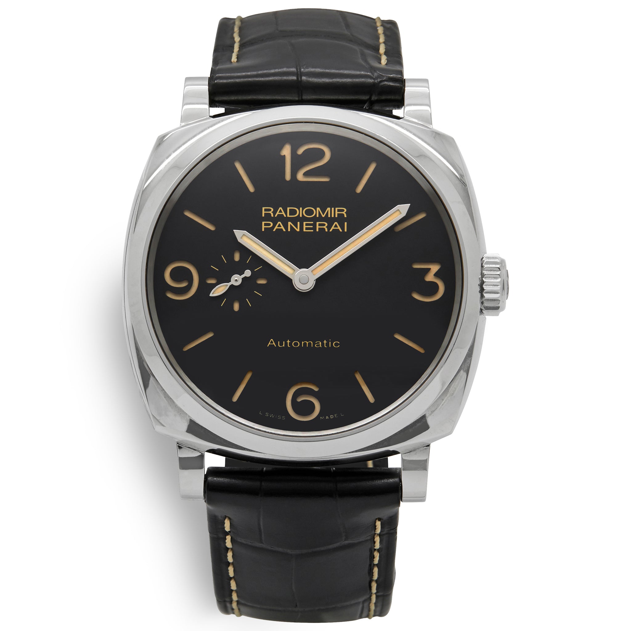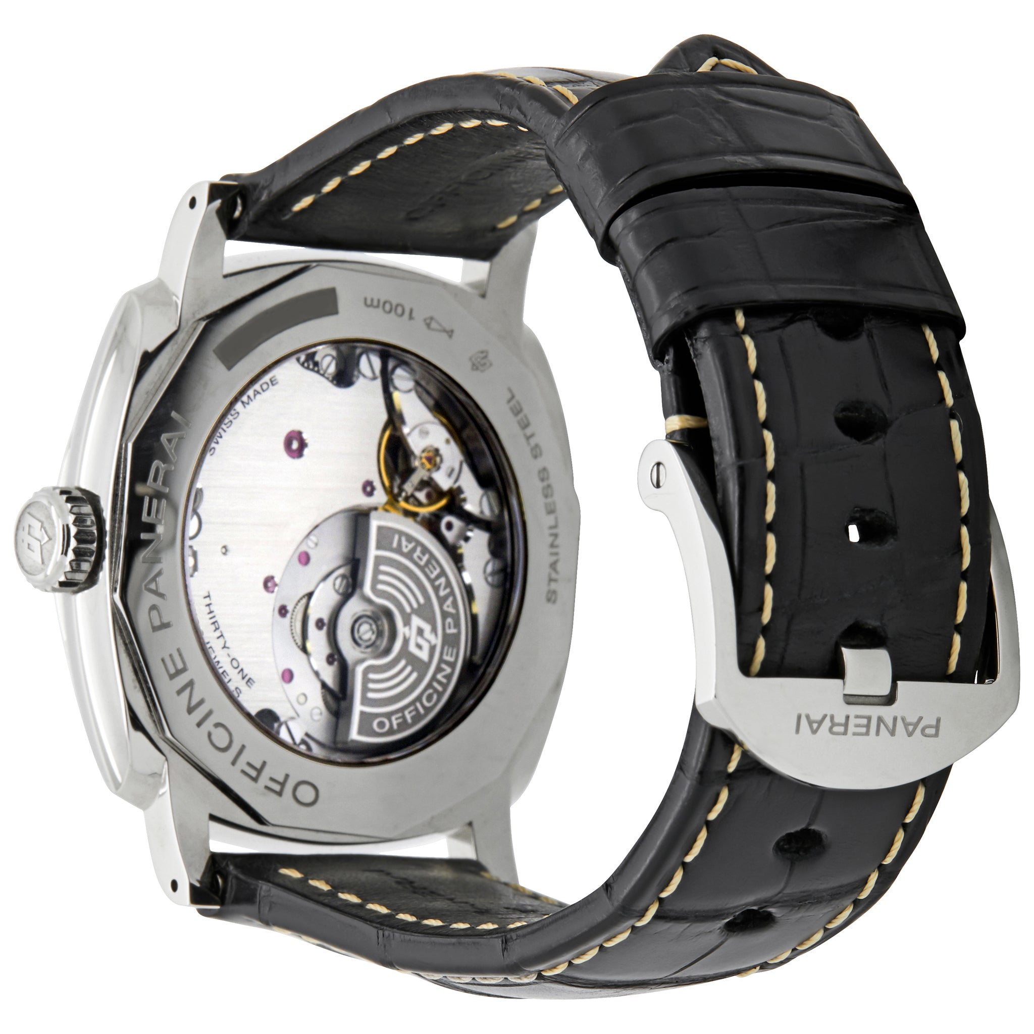 Stainless steel case with a leather strap. Fixed stainless steel bezel. Black dial with luminous silver-tone hands and index hour markers. Dial type: analog. Luminescent hands and markers. Panerai calibre p.4000 automatic movement with about 3 days of power reserve. Scratch resistant sapphire crystal. Screw down crown. Transparent case back. Case size: 45 mm. Case thickness: 12 mm. Cushion case shape. Band width: 23 mm. Tang clasp. Water resistant at 100 meters / 330 feet. Functions: hour, minute, second. Panerai Radiomir 1940 Pam 572 Black Dial Automatic Men's Watch.