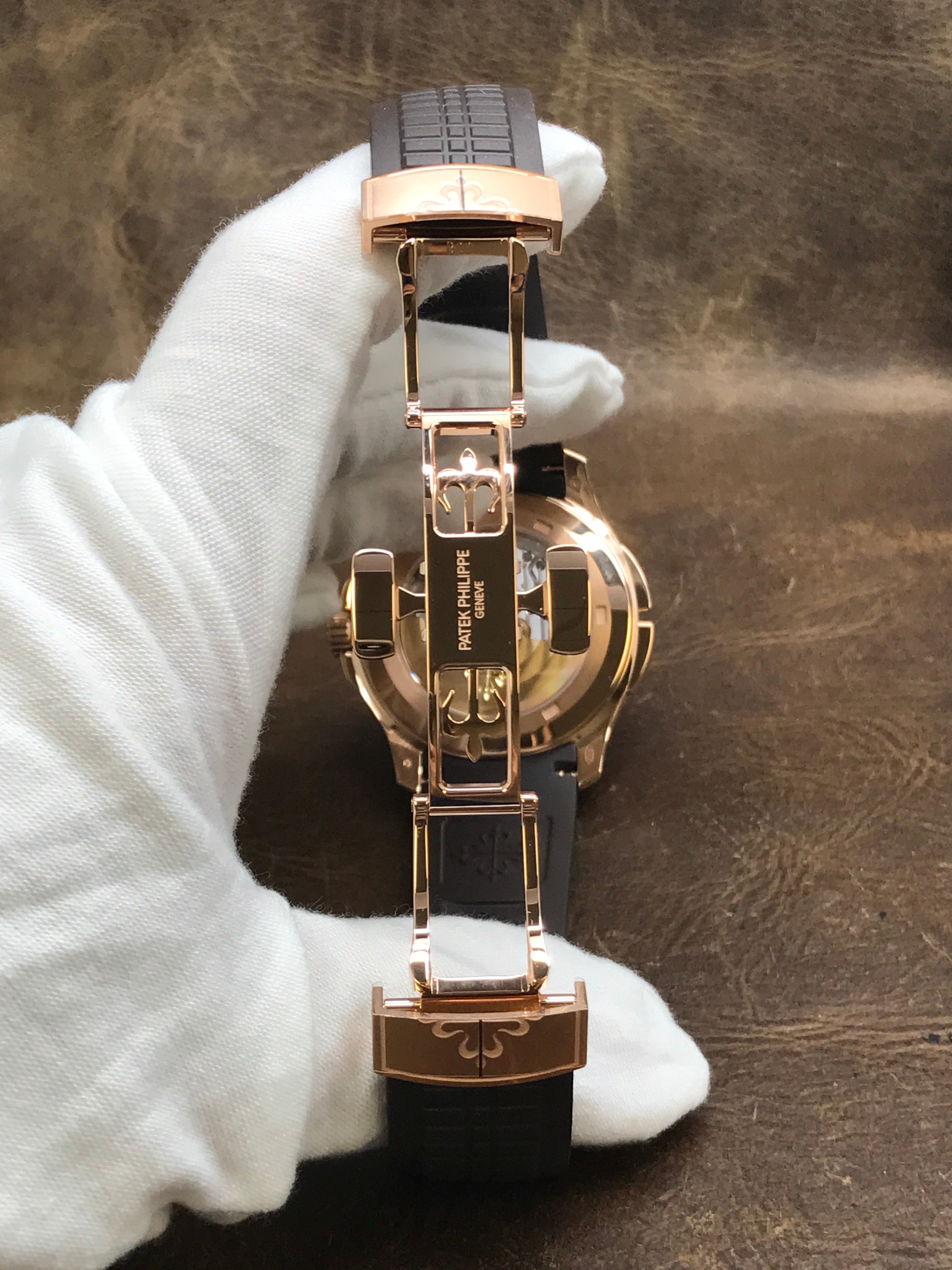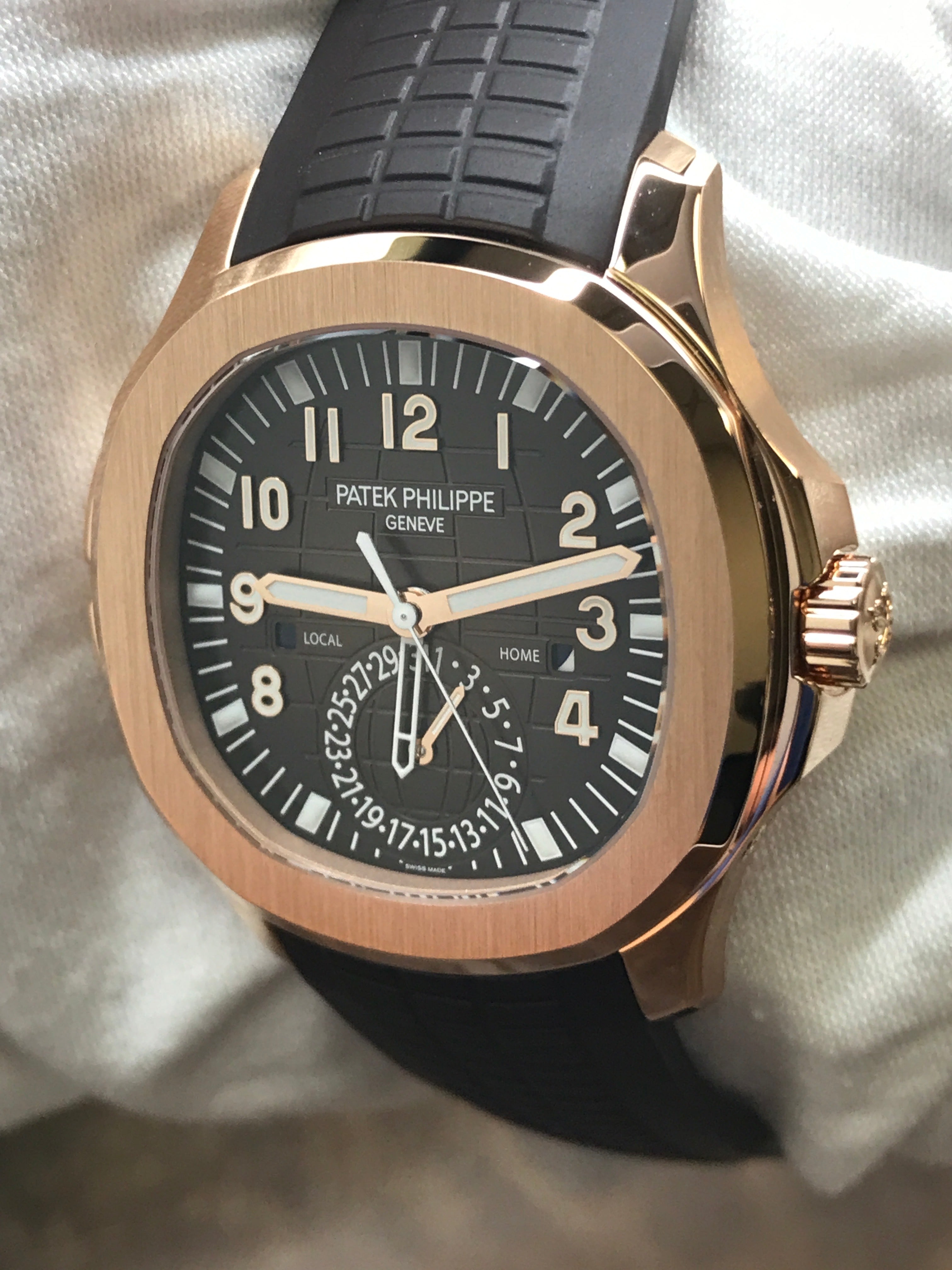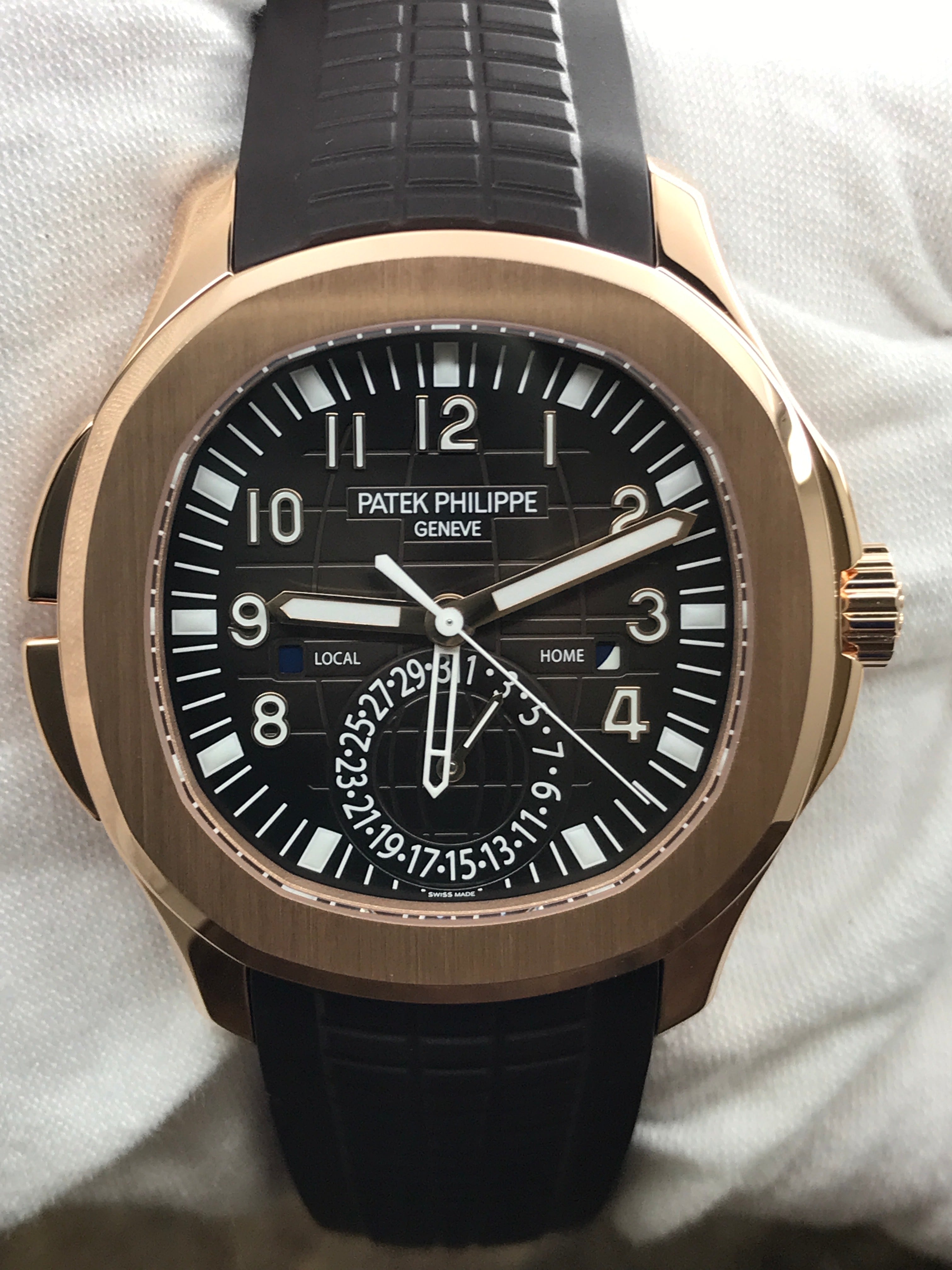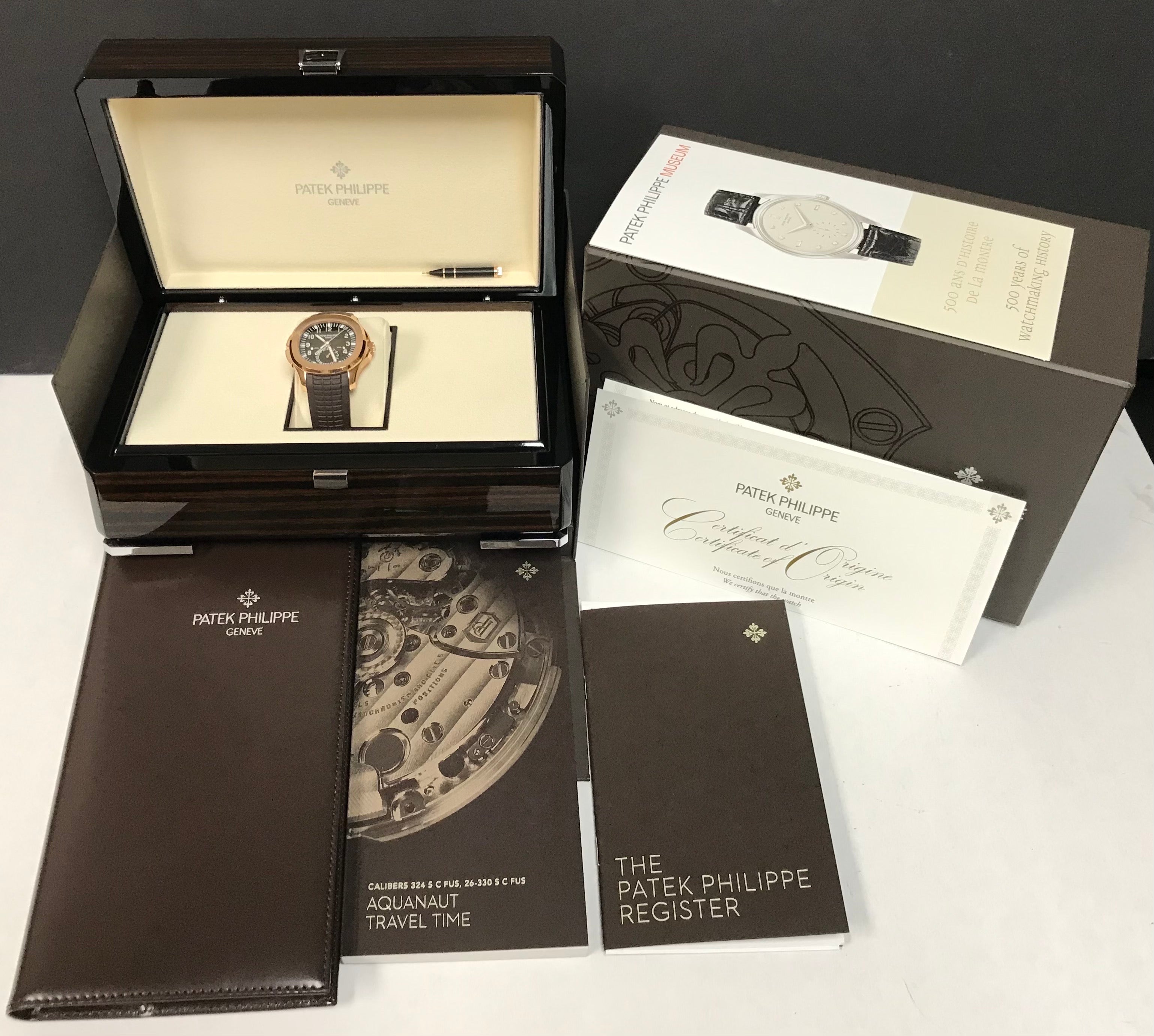 18k rose gold case with a rubber strap. Fixed 18k rose gold bezel. Brown dial with rose gold hands and Arabic numeral hour markers. Dial type: analog. Patek Philippe calibre 324 s c fus automatic movement with about 45 of power reserve. Scratch resistant sapphire crystal. Screw down crown. Transparent case back. Case size: 40.8 mm. Case thickness: 10.2 mm. Oval case shape. Band width: mm. Fold over clasp. Water resistant at 120 meters / 400 feet. Functions: date, second time zone, hour, minute, second. Patek Philippe Aquanaut 5164R Brown Dial Automatic Men's Watch.