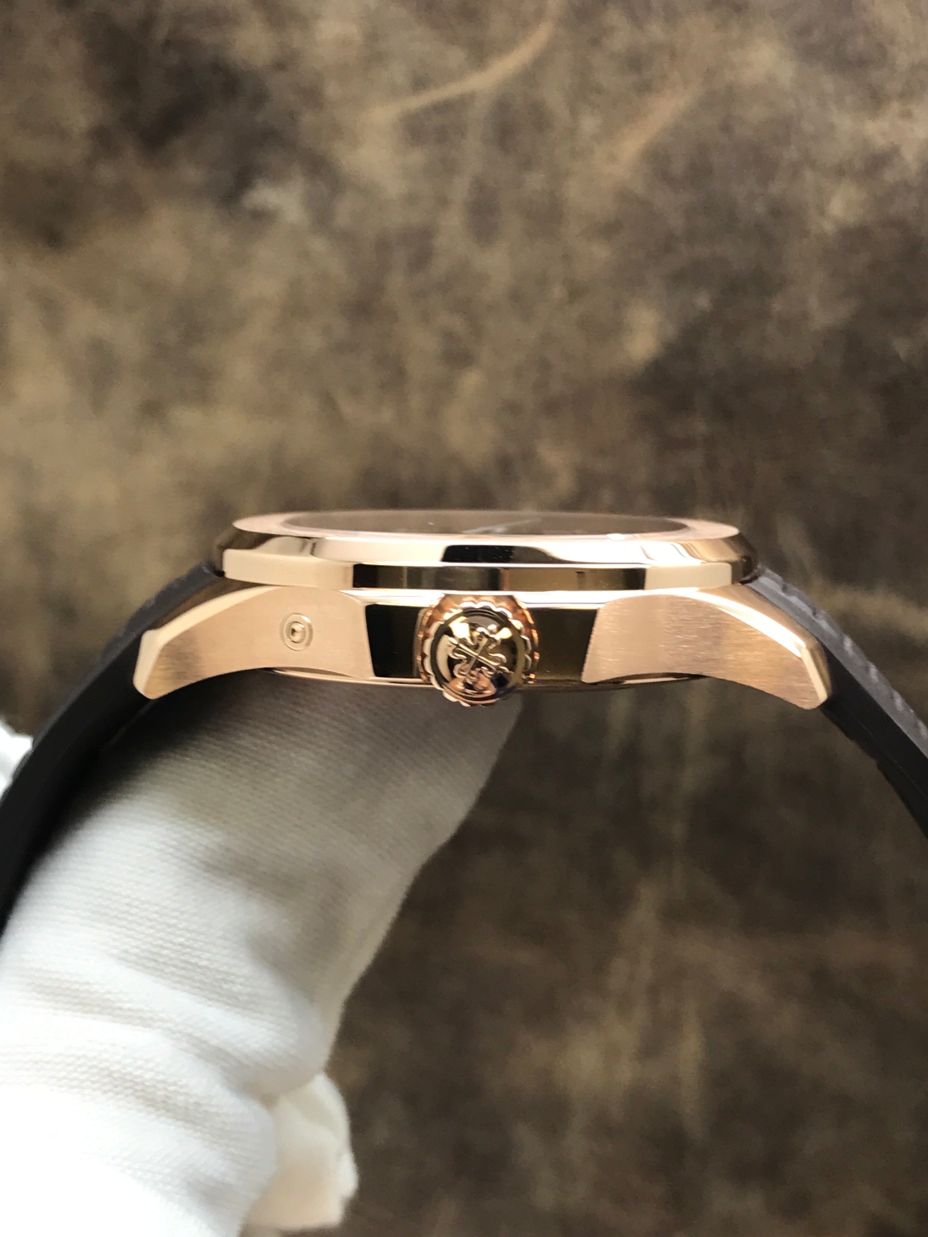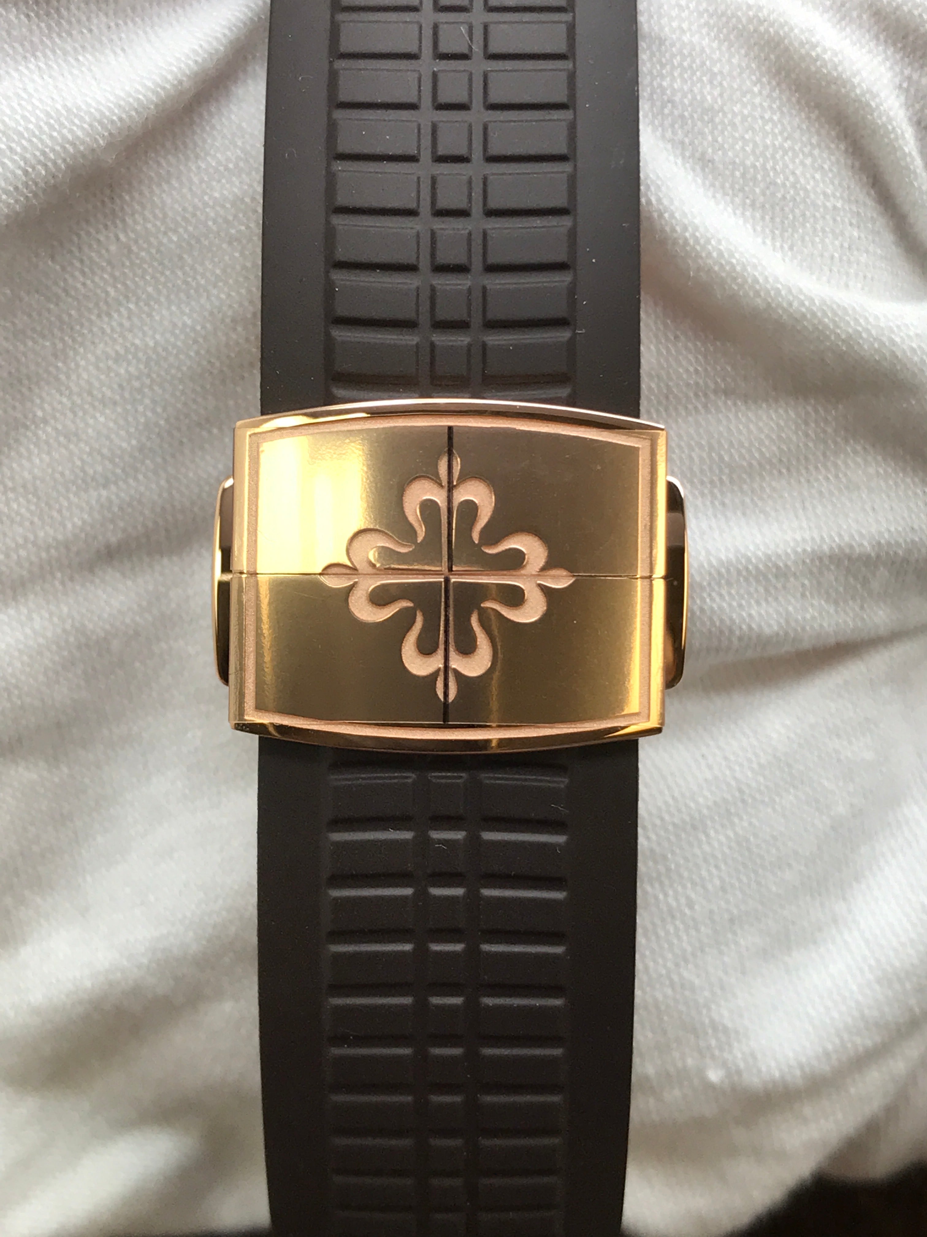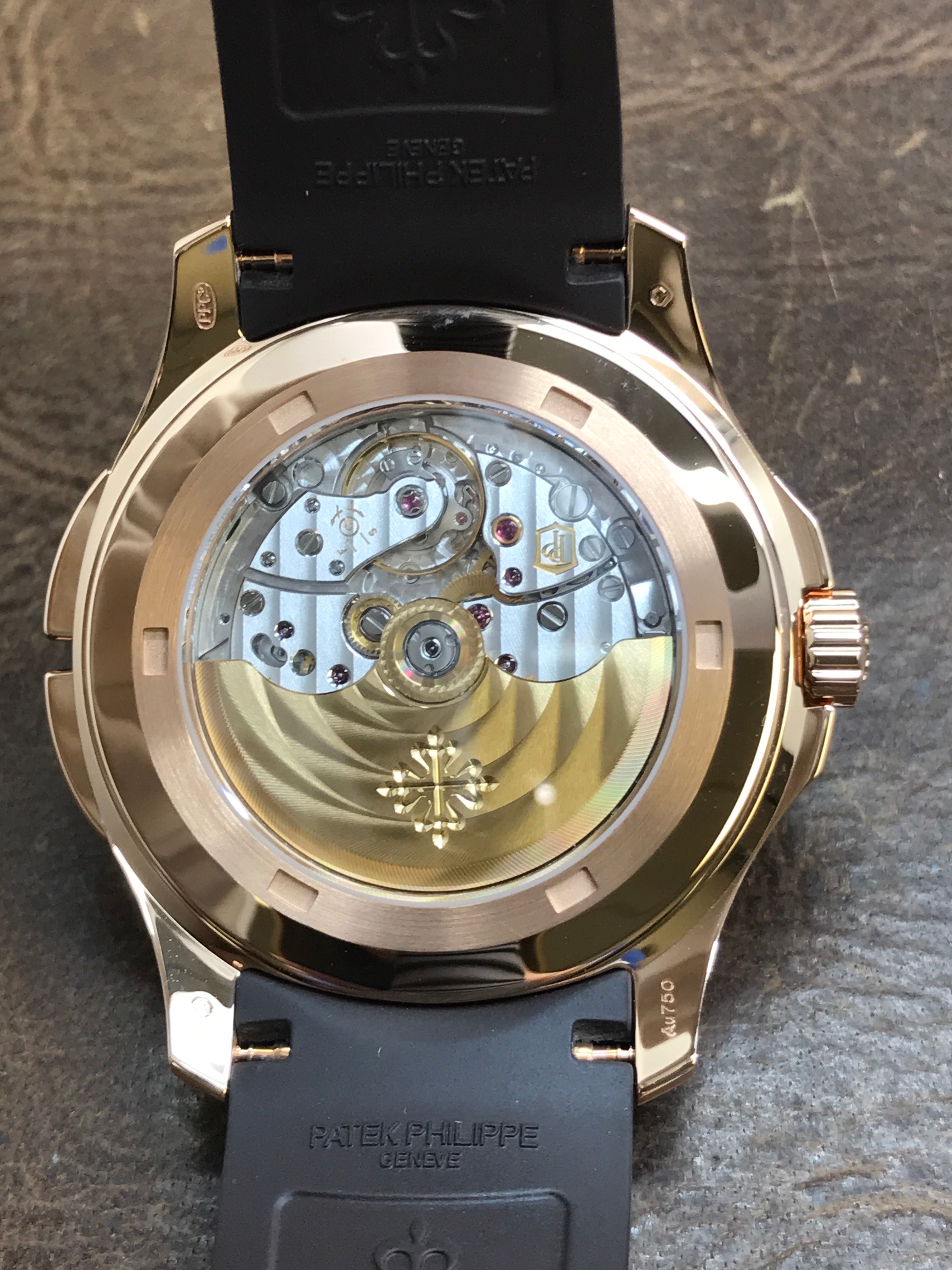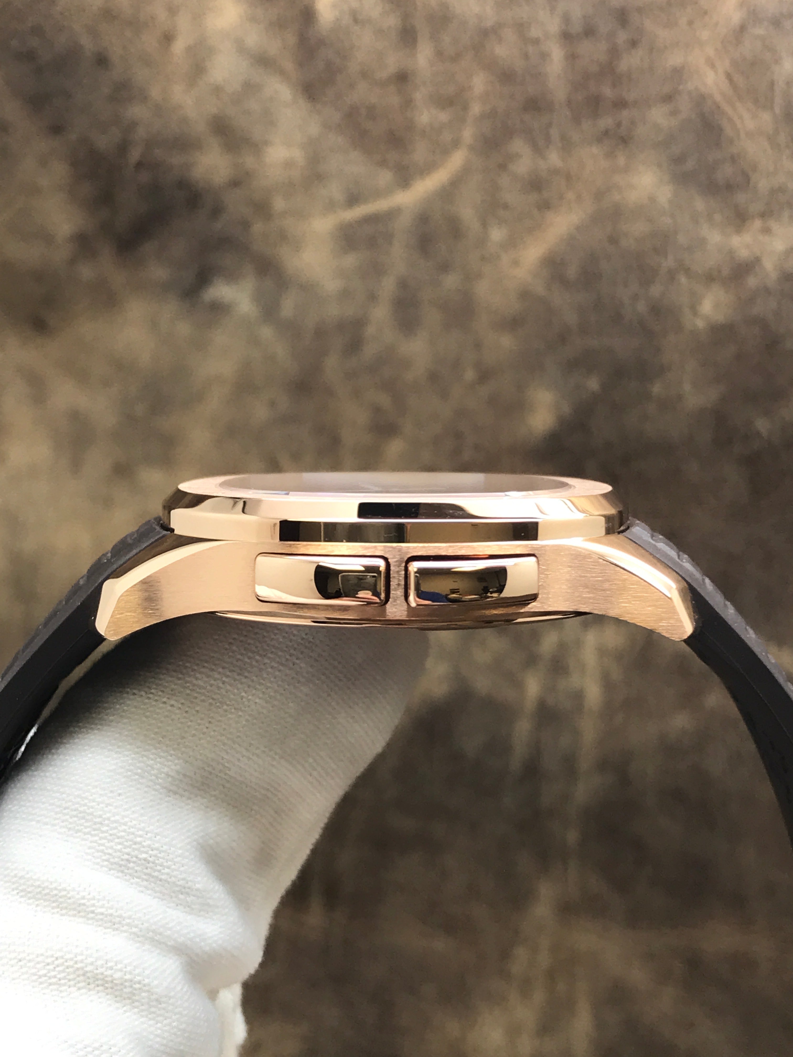 18k rose gold case with a rubber strap. Fixed 18k rose gold bezel. Brown dial with rose gold hands and Arabic numeral hour markers. Dial type: analog. Patek Philippe calibre 324 s c fus automatic movement with about 45 of power reserve. Scratch resistant sapphire crystal. Screw down crown. Transparent case back. Case size: 40.8 mm. Case thickness: 10.2 mm. Oval case shape. Band width: mm. Fold over clasp. Water resistant at 120 meters / 400 feet. Functions: date, second time zone, hour, minute, second. Patek Philippe Aquanaut 5164R Brown Dial Automatic Men's Watch.