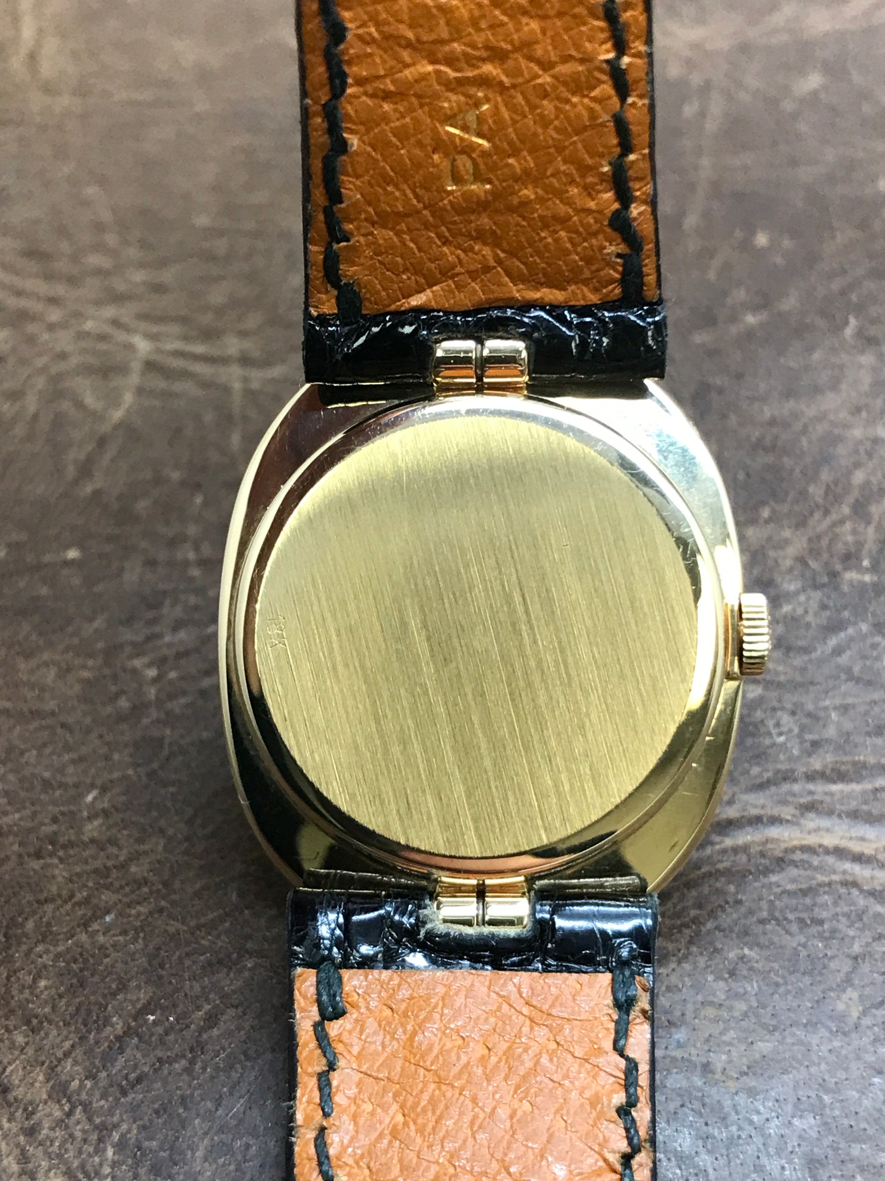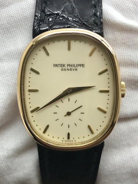 18k yellow gold case with a leather custom strap. Fixed 18k yellow gold bezel. Ivory dial with gold-tone hands and index hour markers. Dial type: analog. 215 manual winding movement with about of power reserve. Scratch resistant sapphire crystal. Pull/push crown. Solid case back. Case size: 27 x 32 mm. Case thickness: mm. Ellipse case shape. Band width: mm. 18k yellow gold tang clasp. Functions: hour, minutes, seconds. Patek Philippe Ellipse 3948 Ivory Dial Manual winding Men's Watch.