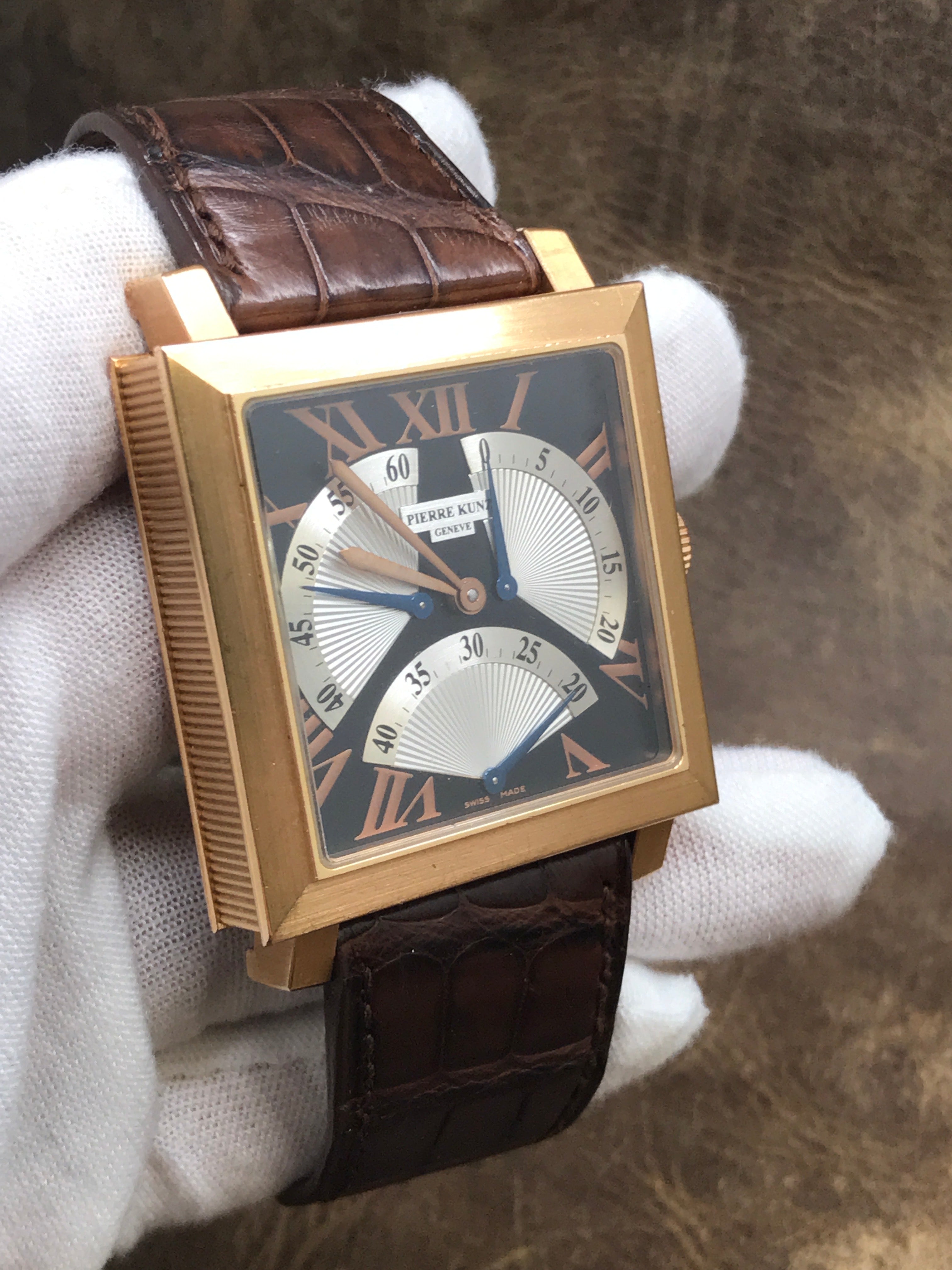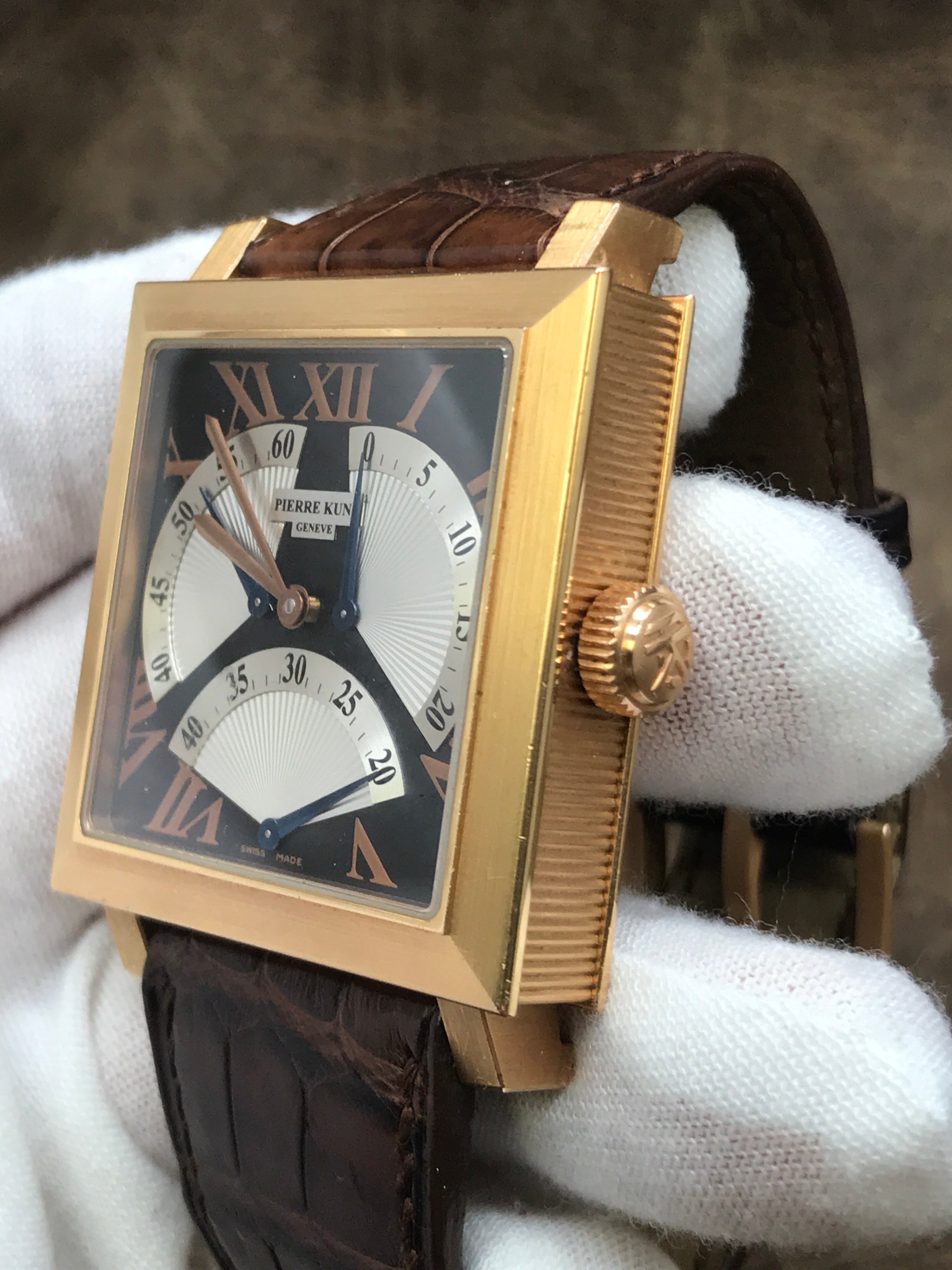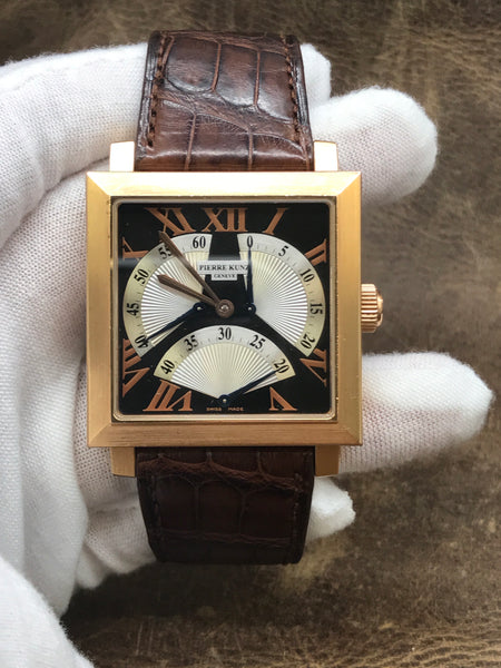 18k rose gold case with a leather strap. Fixed 18k rose gold bezel. Black & silver dial with blue-steel sword-shaped hands and Roman numerals hour markers. Dial type: analog. Pk 2001 automatic movement with about 42 hours of power reserve. Scratch resistant sapphire crystal. Pull / push crown. Exhibition case back. Case size: 38mm mm. Case thickness: 11 mm. Square case shape. Band width: mm. 18k rose gold tang clasp. Water resistant at 30 meters / 100 feet. Functions: hours, minutes, retrograde seconds. Pierre Kunz Triple Retrograde PKB002STR Black & Silver Dial Automatic Men's Watch.