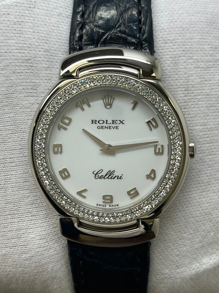 18k white gold case with a leather strap. 18k white gold with diamonds 18k white gold with diamonds bezel. White dial with silver tone hands and Arabic hour markers. Dial type: analog. Quartz movement with about of power reserve. Sapphire crystal. Pull / push crown. Solid case back. Case size: 33 mm. Case thickness: mm. Round case shape. Band width: mm. 18k white gold deployment clasp. Water resistant at no. Functions: hour, minutes. Rolex Cellini Cellissima 33mm 6681 White Dial Quartz Women's Watch.