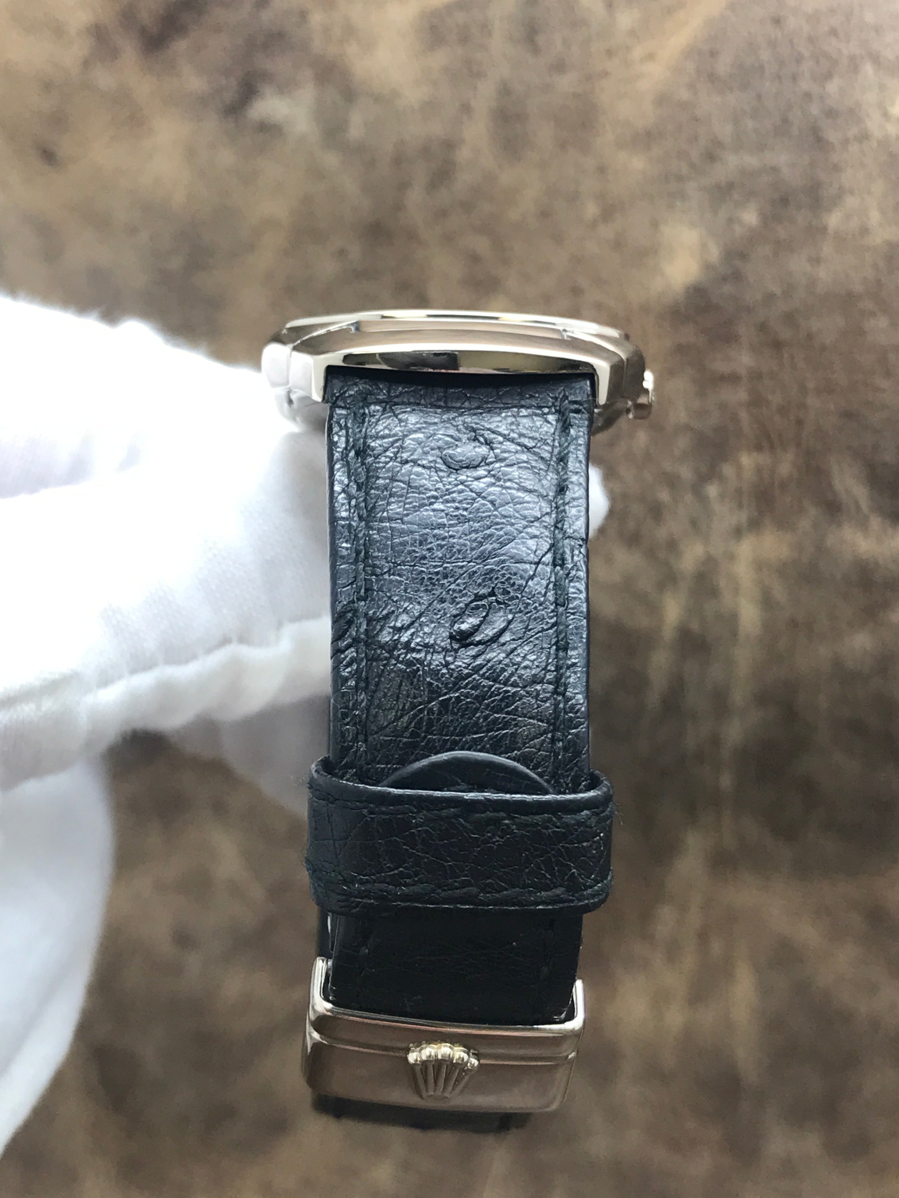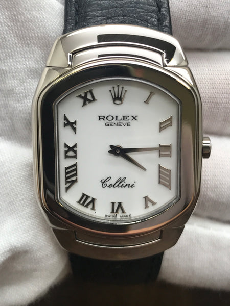 18k white gold case with a leather strap. Fixed 18k white gold bezel. White dial with silver tone hands and Roman numerals hour markers. Dial type: analog. Cal. 6620 quartz movement with about of power reserve. Scratch resistant sapphire crystal. Pull / push crown. Solid case back. Case size: 35 x 29 mm. Case thickness: 6 mm. Oval case shape. Band width: mm. 18k white gold deployment clasp. Water resistant at 30 meters / 100 feet. Functions: hours, minutes. Rolex Cellini 6633 White Dial Quartz Watch.