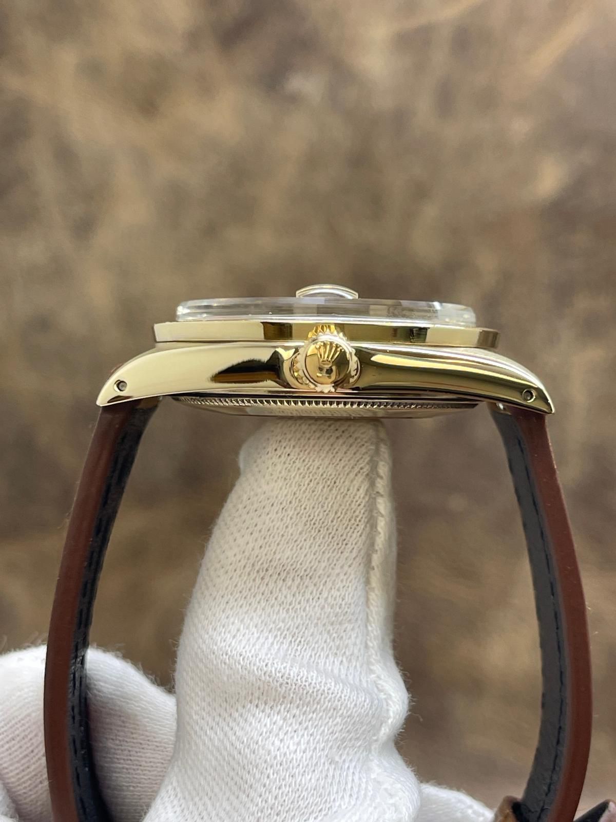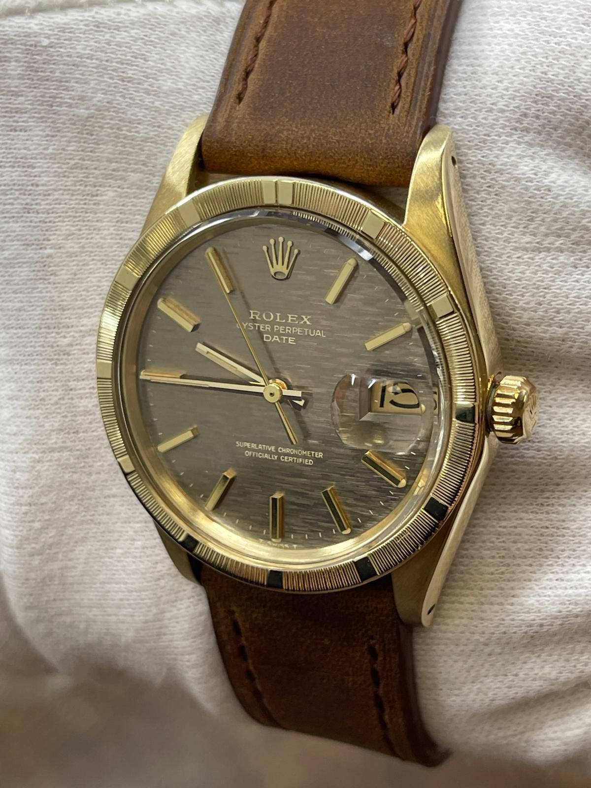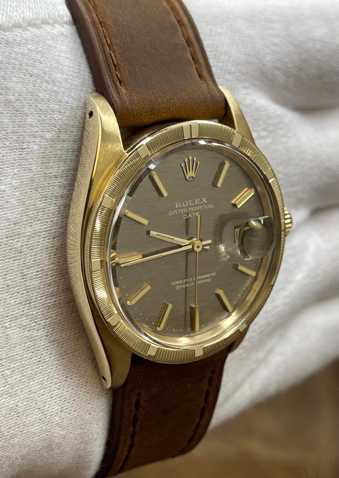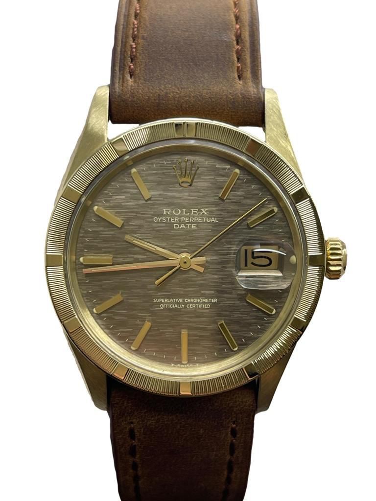 14k yellow gold case with a custom leather strap custom leather. Fixed engine turned yellow gold bezel. Brown mosaic dial with gold-tone hands and index hour markers. Dial type: analog. Cal. 1575 automatic movement with about 48 hours of power reserve. Acrylic crystal. Screw-down crown. Solid case back. Case size: 34 mm. Case thickness: 12 mm. Round case shape. Band width: mm. Custom steel tang clasp. Water resistant at not waterproof. Functions: hours, minutes, seconds, date. Rolex Date 34mm 14K Yellow Gold 1501 Brown Mosaic Dial Automatic Watch.