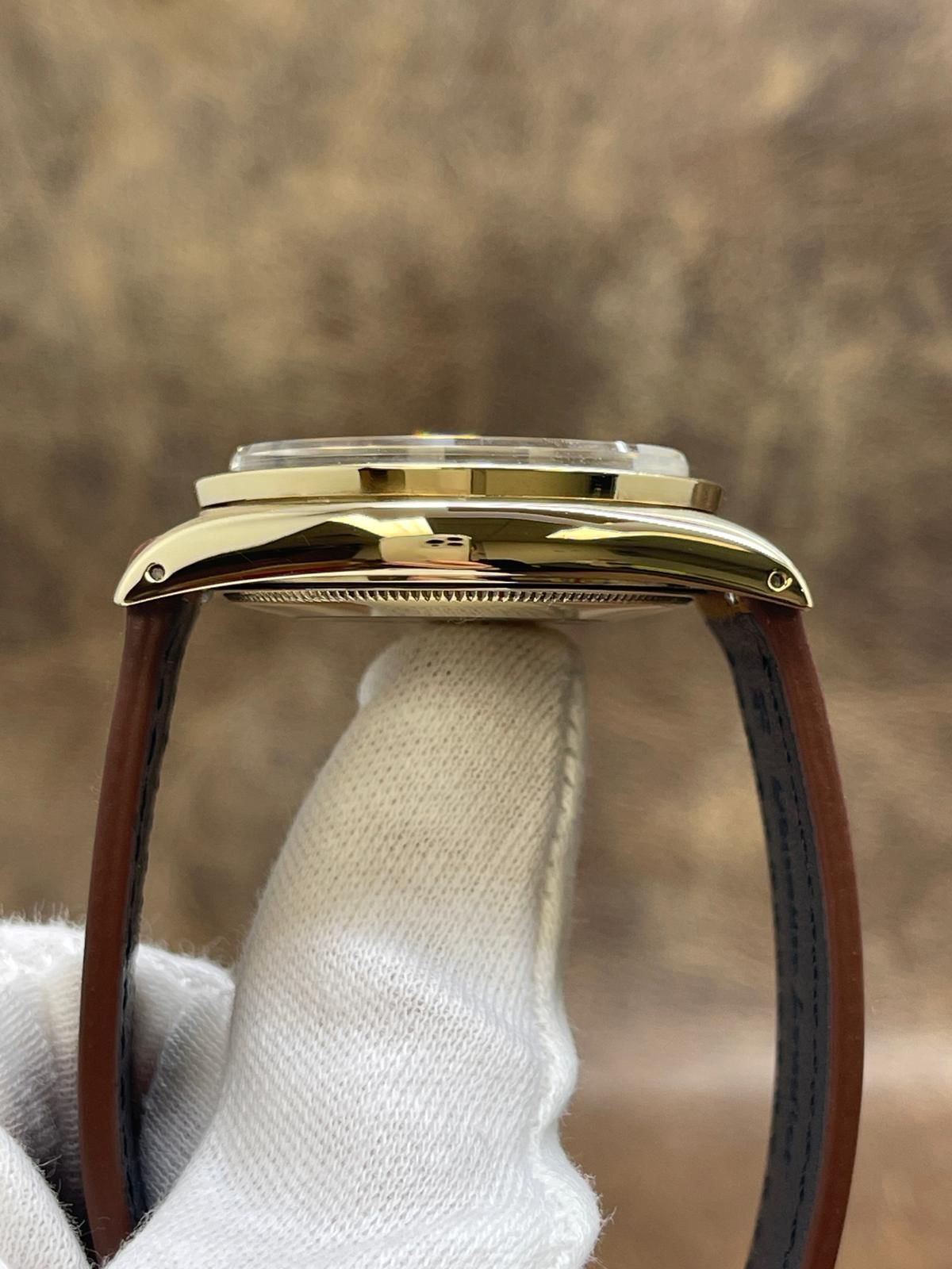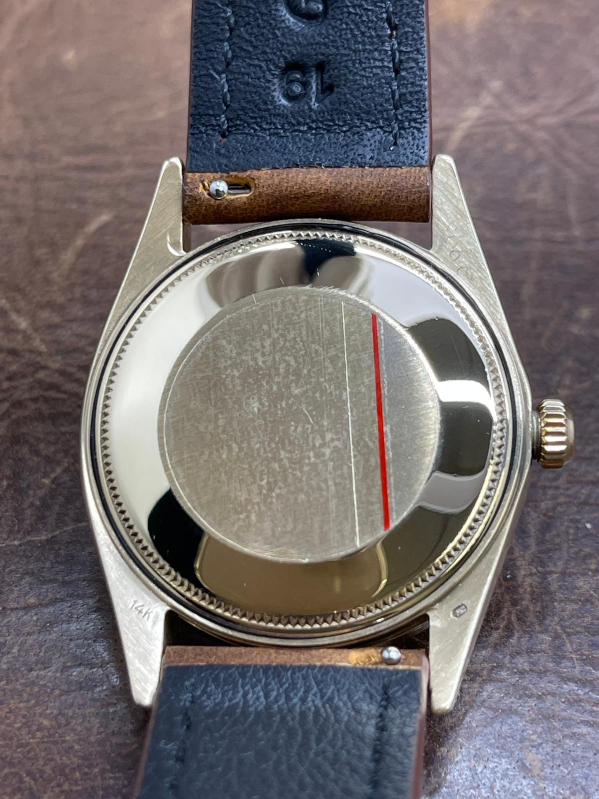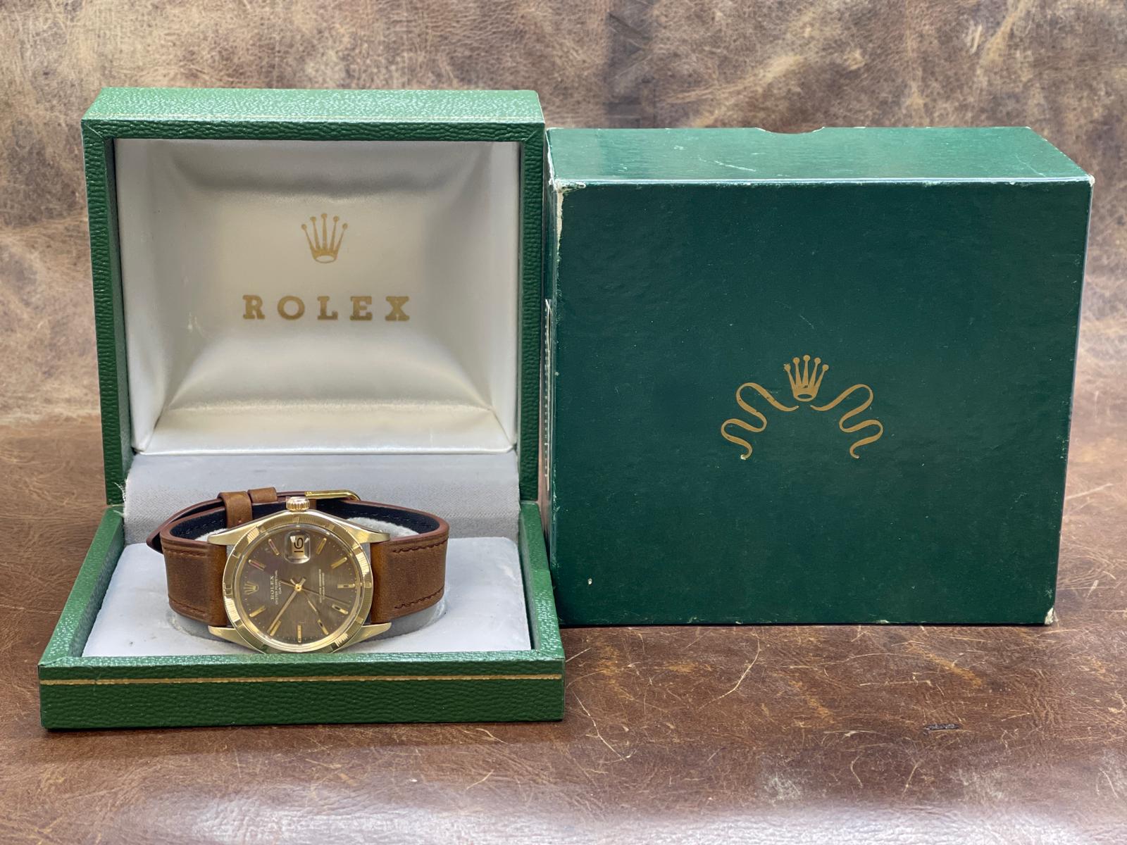 14k yellow gold case with a custom leather strap custom leather. Fixed engine turned yellow gold bezel. Brown mosaic dial with gold-tone hands and index hour markers. Dial type: analog. Cal. 1575 automatic movement with about 48 hours of power reserve. Acrylic crystal. Screw-down crown. Solid case back. Case size: 34 mm. Case thickness: 12 mm. Round case shape. Band width: mm. Custom steel tang clasp. Water resistant at not waterproof. Functions: hours, minutes, seconds, date. Rolex Date 34mm 14K Yellow Gold 1501 Brown Mosaic Dial Automatic Watch.