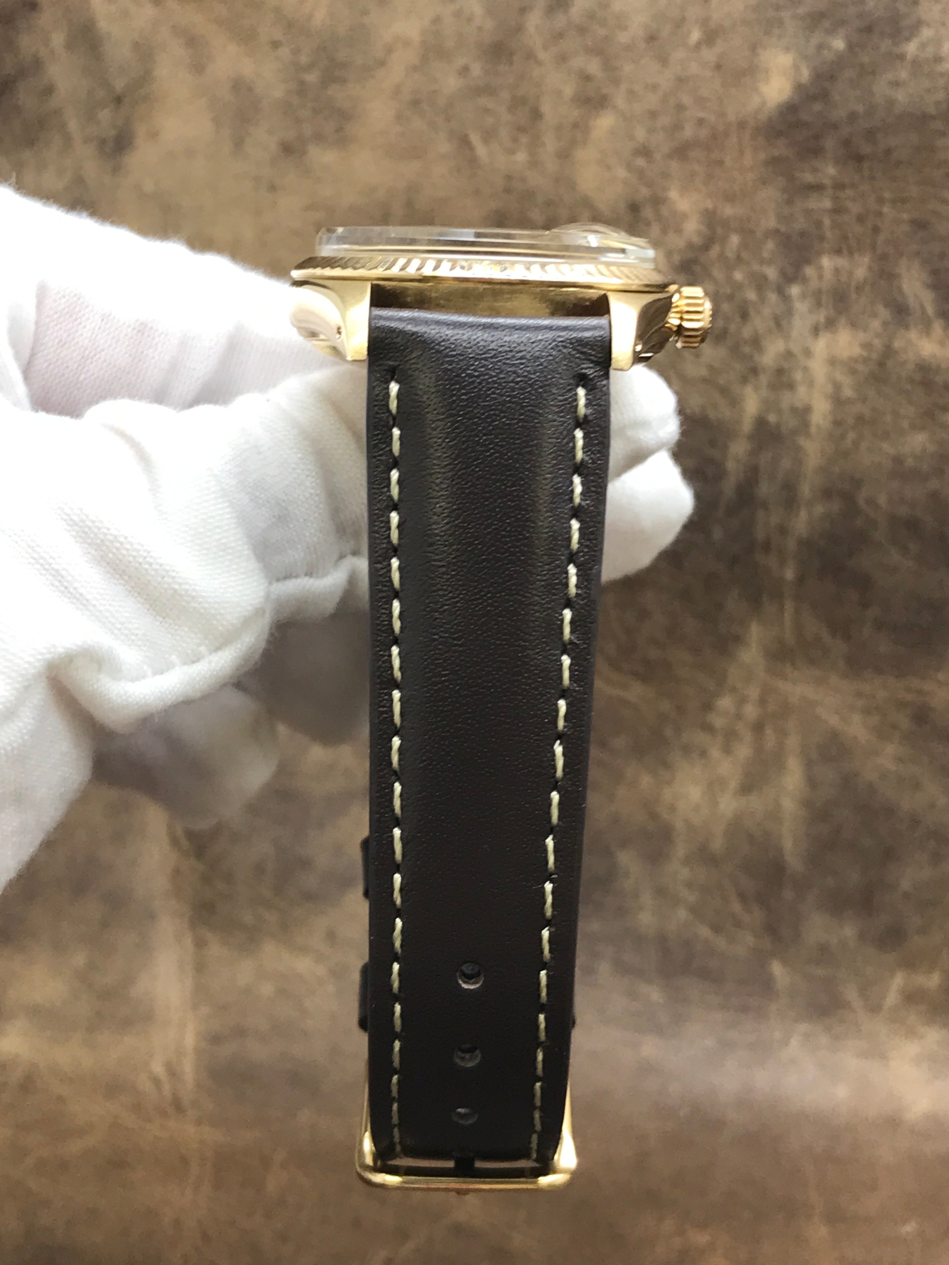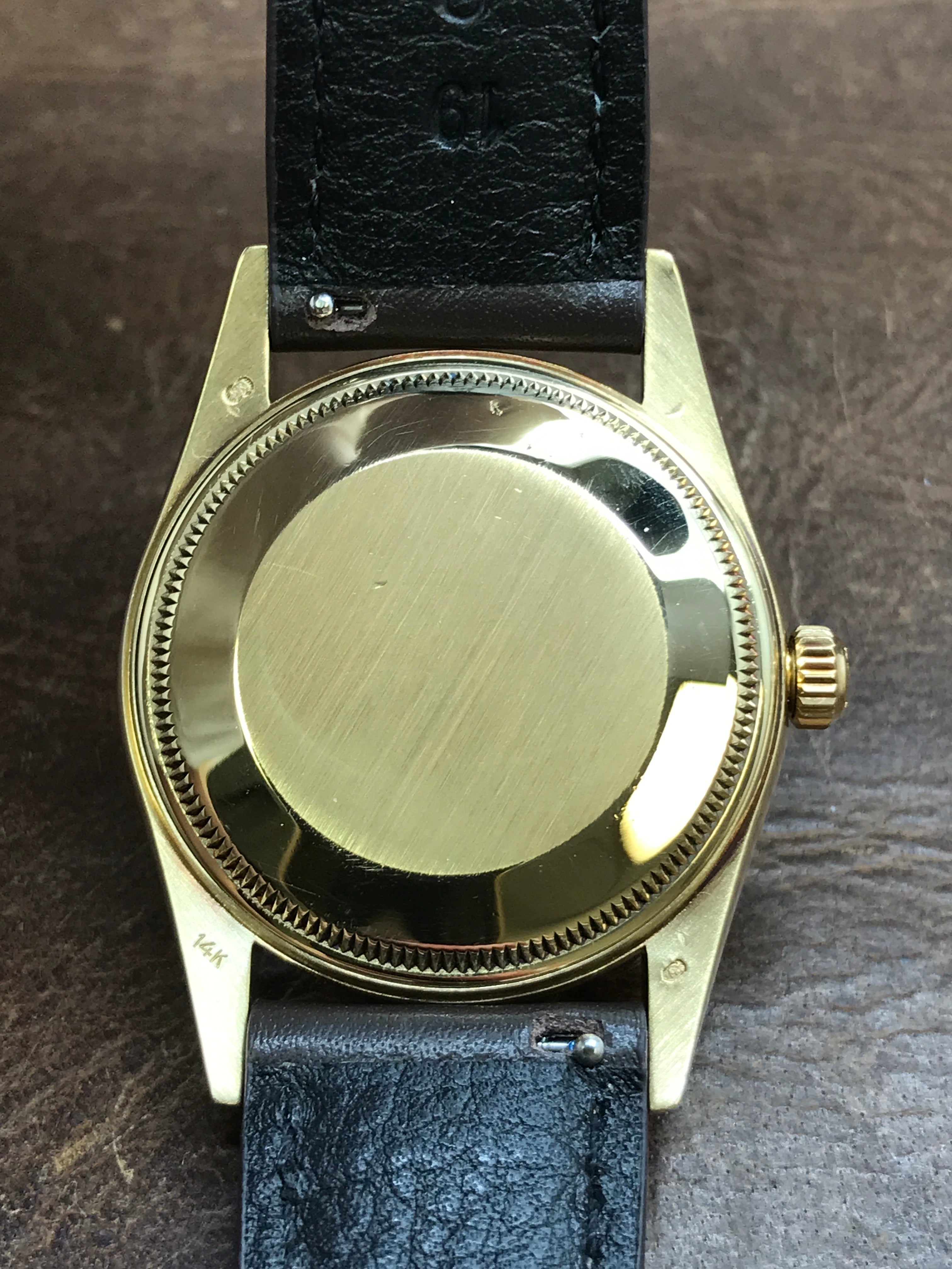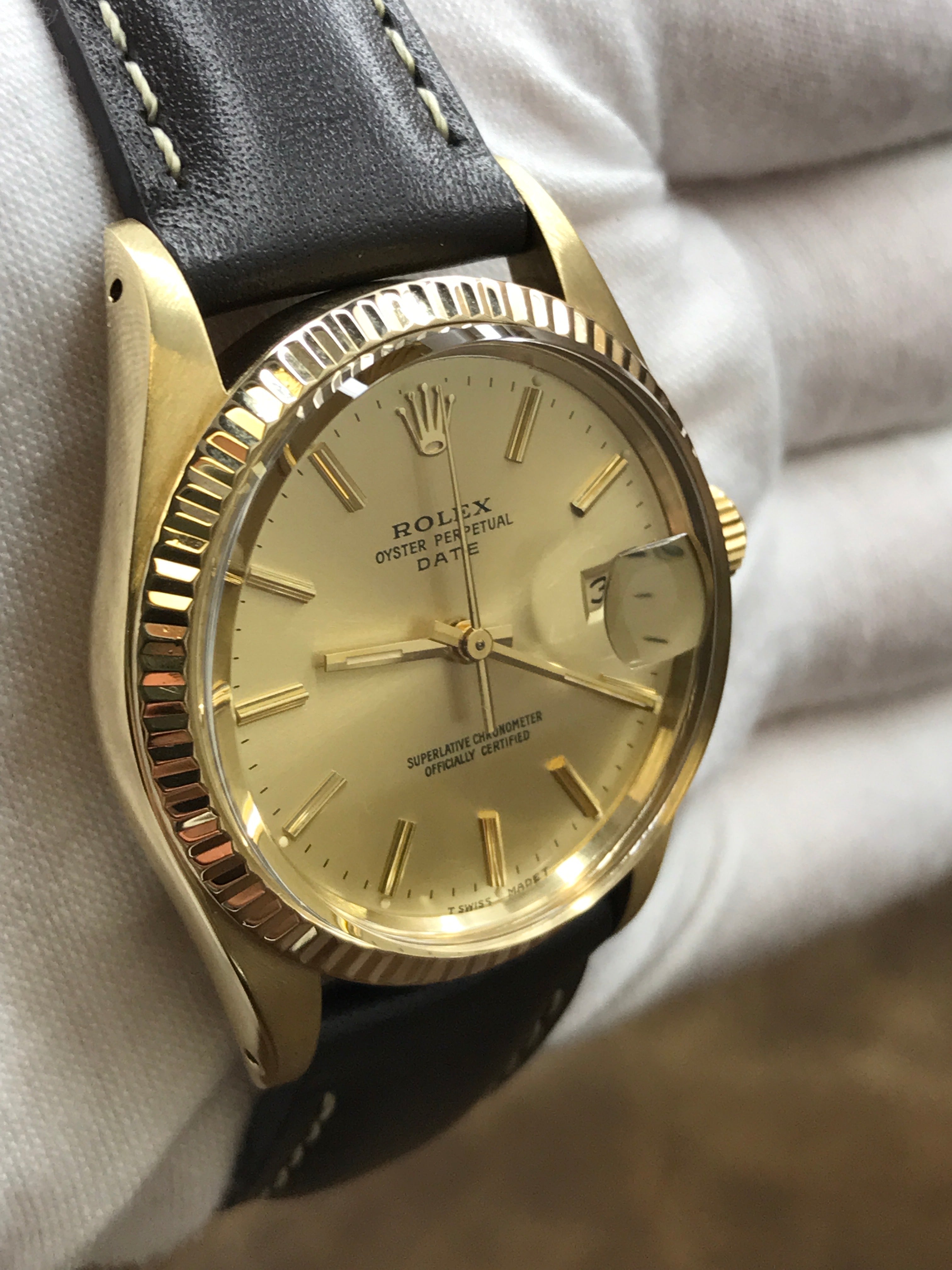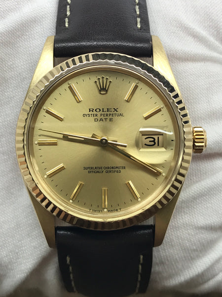 14k yellow gold case with a custom leather strap custom strap. Fixed fluted 14k yellow gold bezel. Gold dial with gold-tone hands and index hour markers. Dial type: analog. Caliber 3035 automatic movement with about of power reserve. Acrylic crystal. Screw down crown. Solid case back. Case size: 34 mm. Case thickness: mm. Round case shape. Band width: mm. Custom steel tang clasp. Water resistant at 100 meters / 330 feet. Functions: date, hour, minutes, seconds. Rolex Date 15037 Gold Dial Automatic Watch.