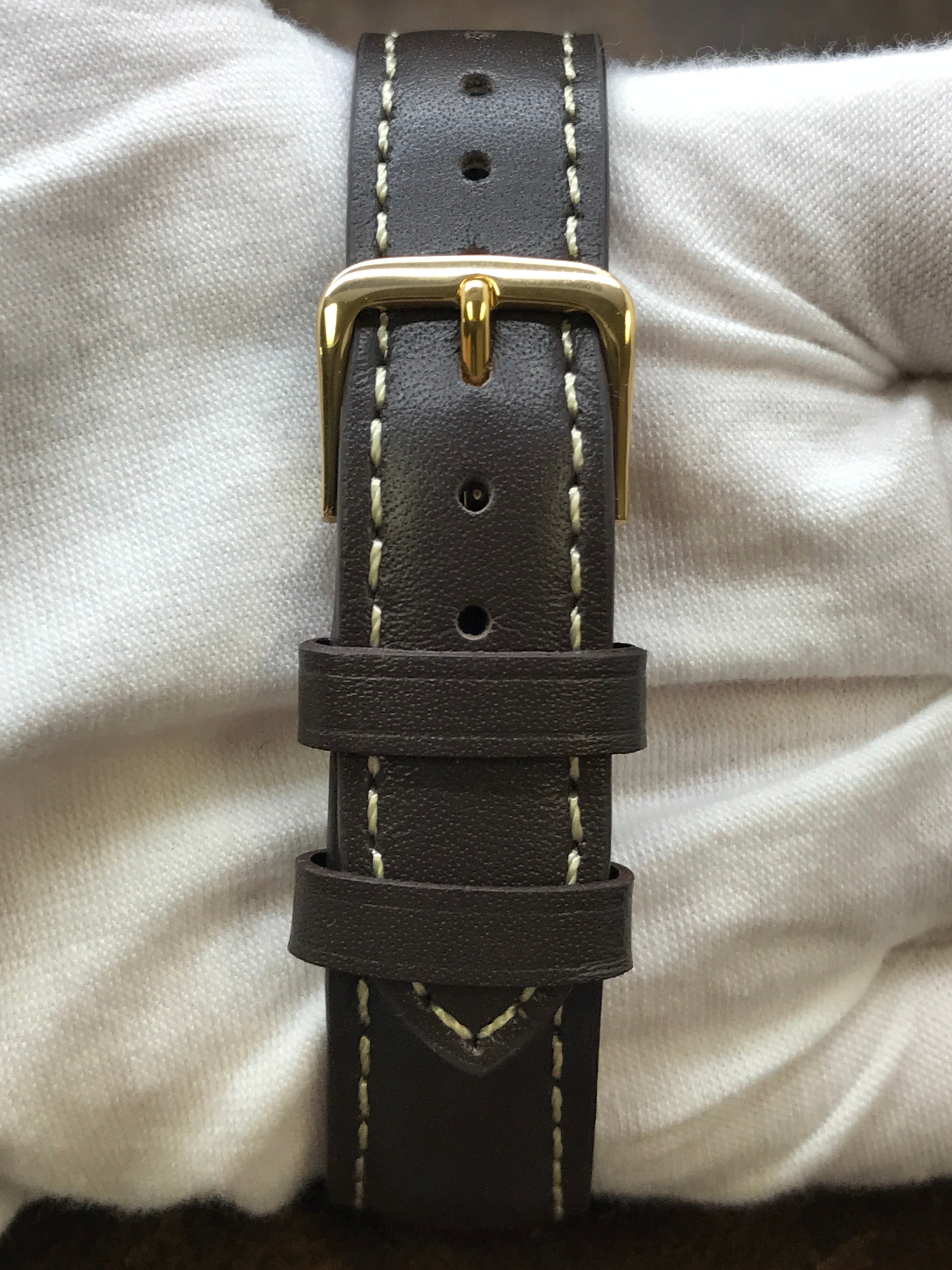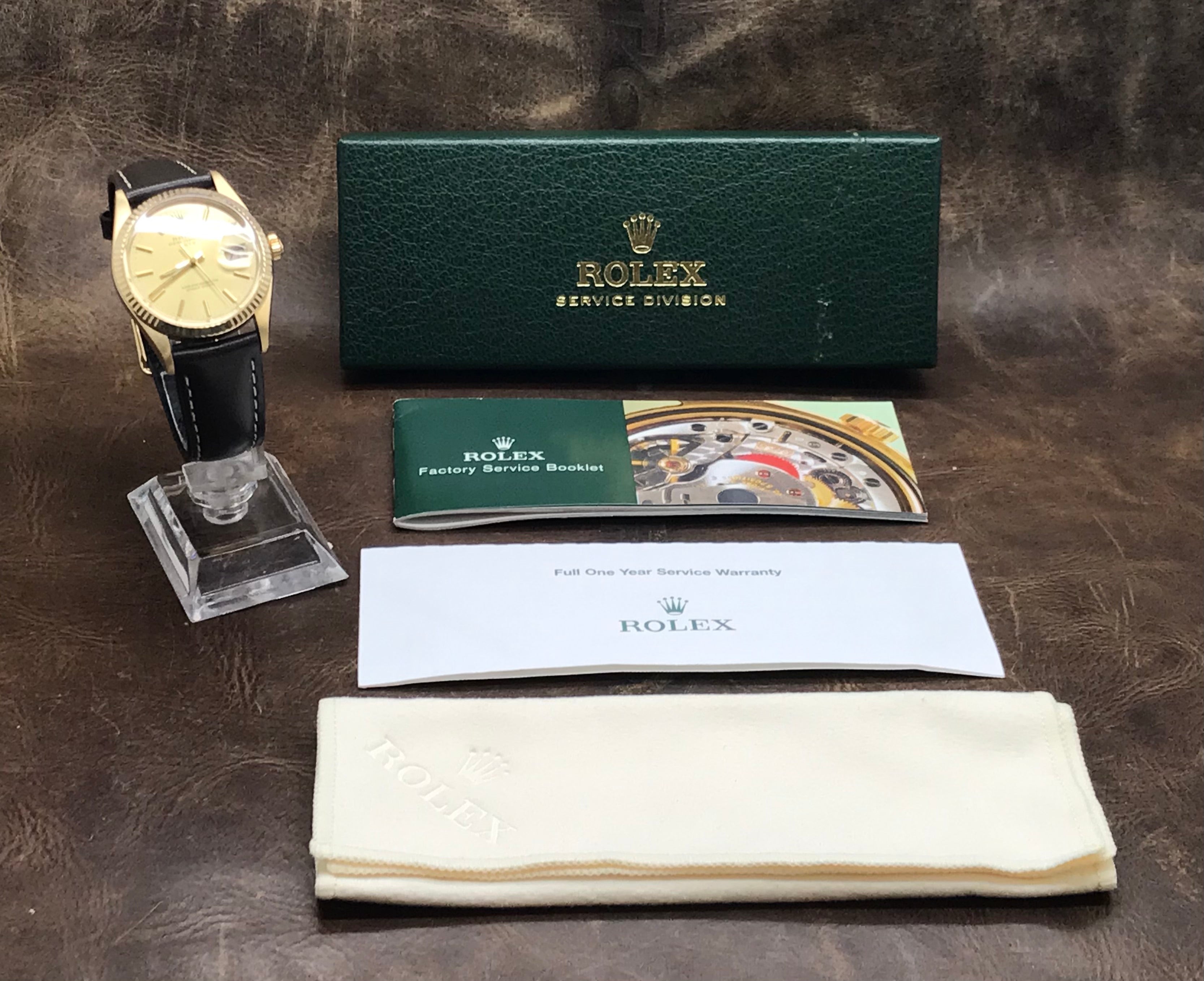This pre-owned Rolex Date 15037 is in excellent condition and comes with: original Rolex box, booklet & papers from SERVICE. The watch comes with a custom leather strap and tang buckle. Max wrist size: 7.5 in.