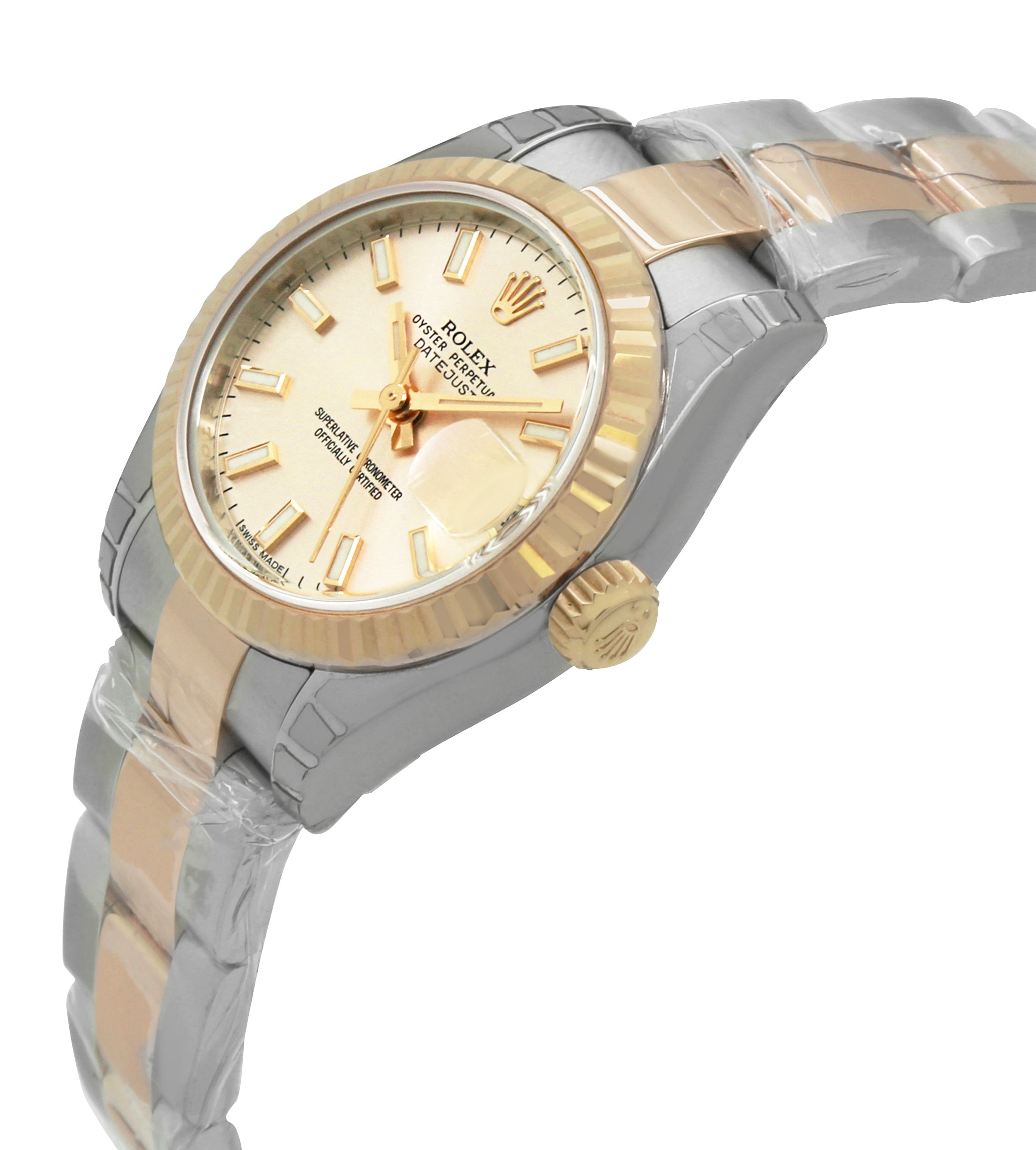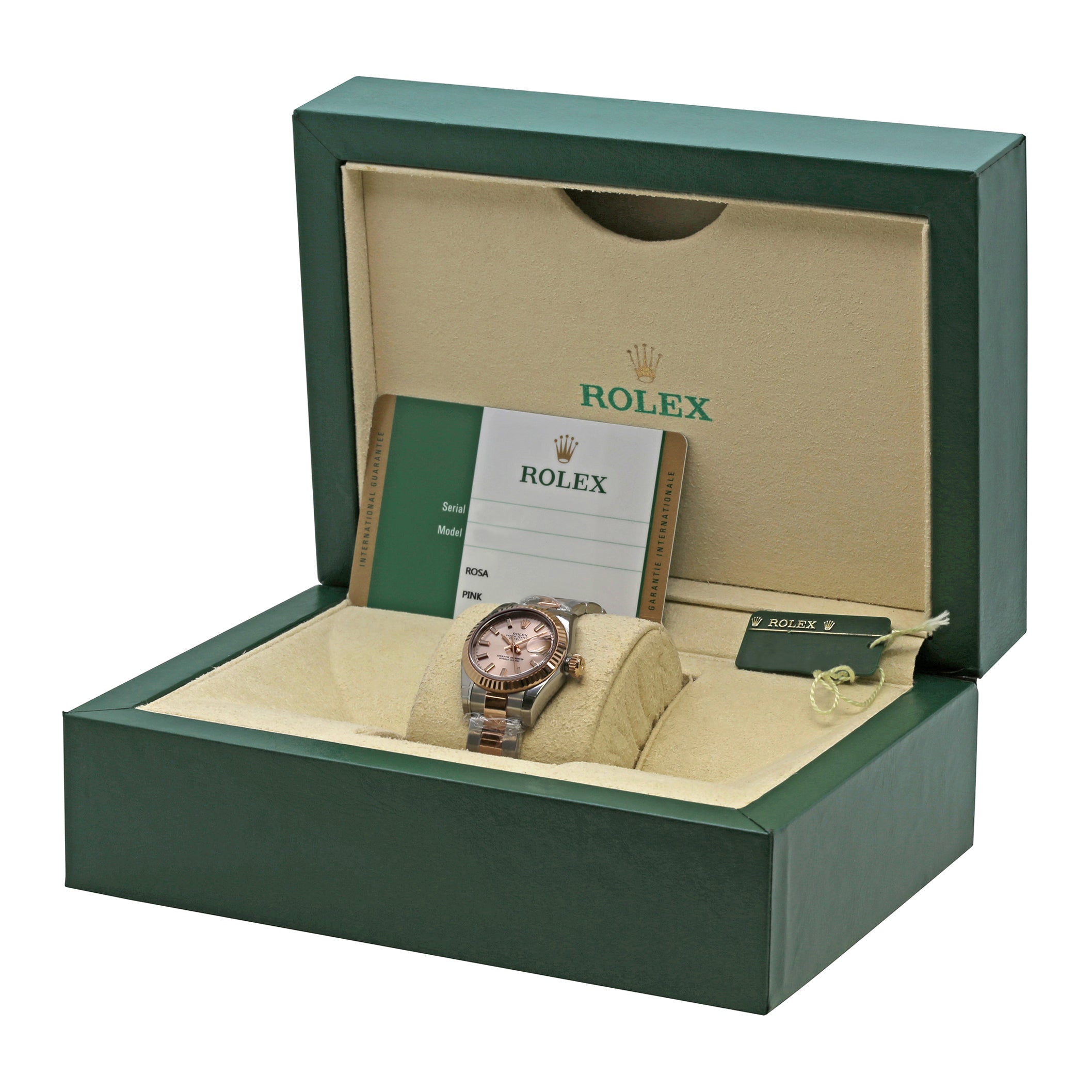 Stainless steel case with a stainless steel and 18kt everose gold Rolex oyster bracelet. Fixed fluted 18kt everose gold bezel. Pink dial with luminous rose gold-tone hands and index hour markers. Dial type: analog. Luminescent hands and markers. Rolex calibre 2235 automatic movement with about 48 hours of power reserve. Scratch resistant sapphire crystal. Screw down crown. Solid case back. Case size: 26 mm. Case thickness: mm. Round case shape. Band width: mm. Concealed crown clasp. Water resistant at 100 meters / 330 feet. Functions: date, hour, minute, second, chronometer. Rolex Datejust 26mm 179171 Pink Dial Automatic Women's Watch.