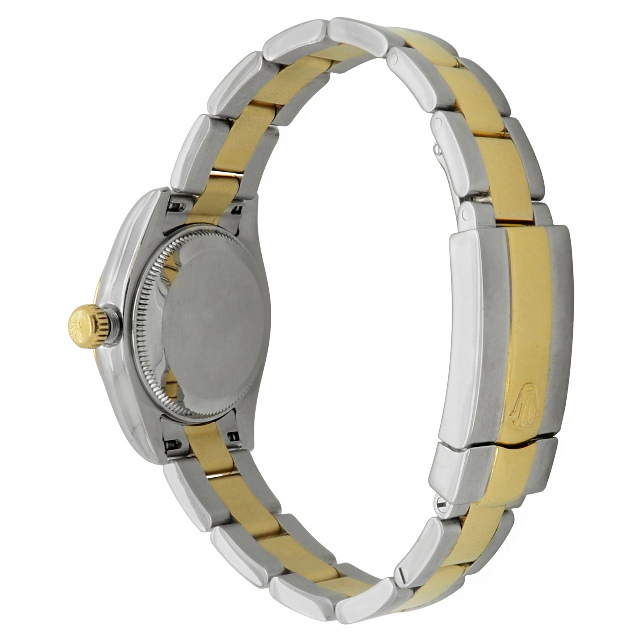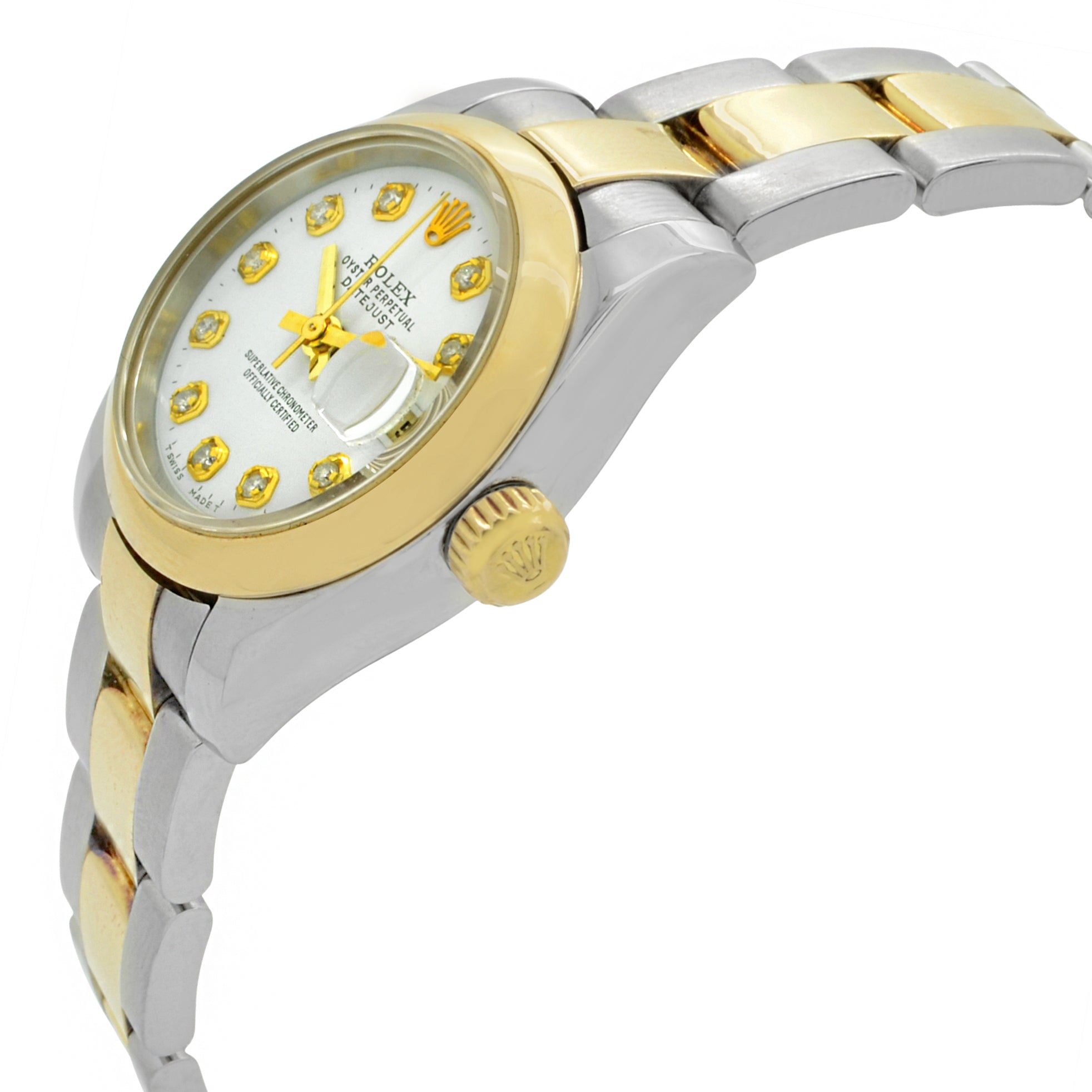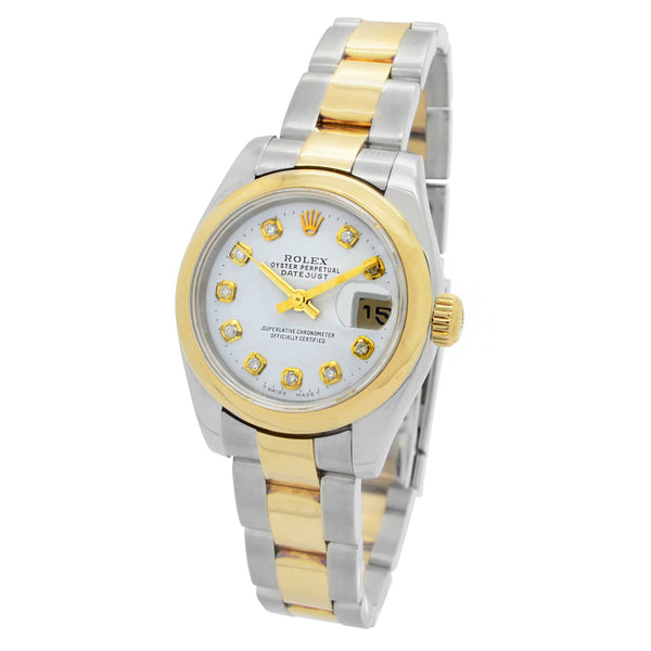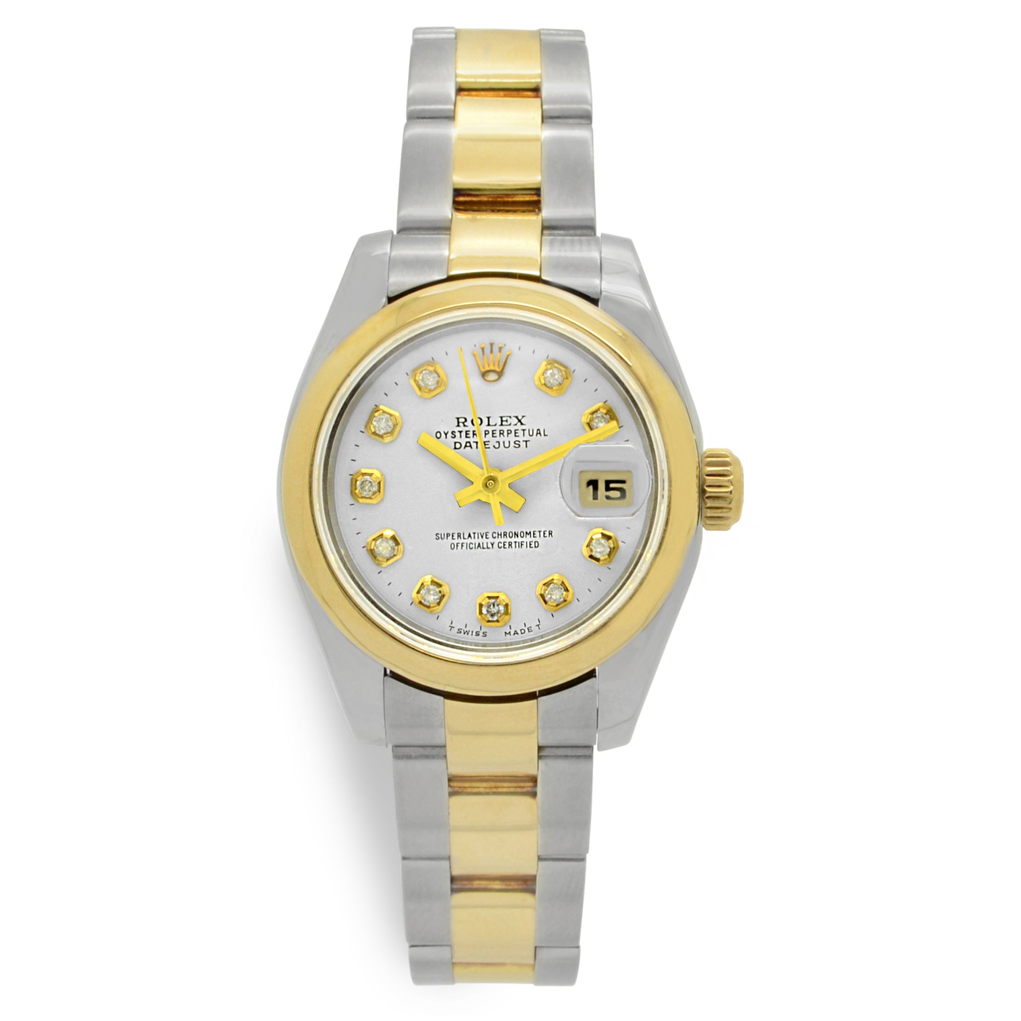 Stainless steel case with a stainless steel and 18k yellow gold Rolex oyster bracelet. Domed and fluted 18kt yellow gold bezel. White dial with yellow gold-tone hands and diamond hour markers. Dial type: analog. Rolex calibre 2235 automatic movement with about 48 hours of power reserve. Sapphire crystal. Screwdown crown. Solid case back. Case size: 26 mm. Case thickness: 10.5 mm. Round case shape. Band width: mm. Oysterclasp clasp. Water resistant at 100 meters / 330 feet. Functions: date, hour, minute, second, chronometer. Rolex Datejust 26mm Lady 26 179163 White Dial Automatic Women's Watch.