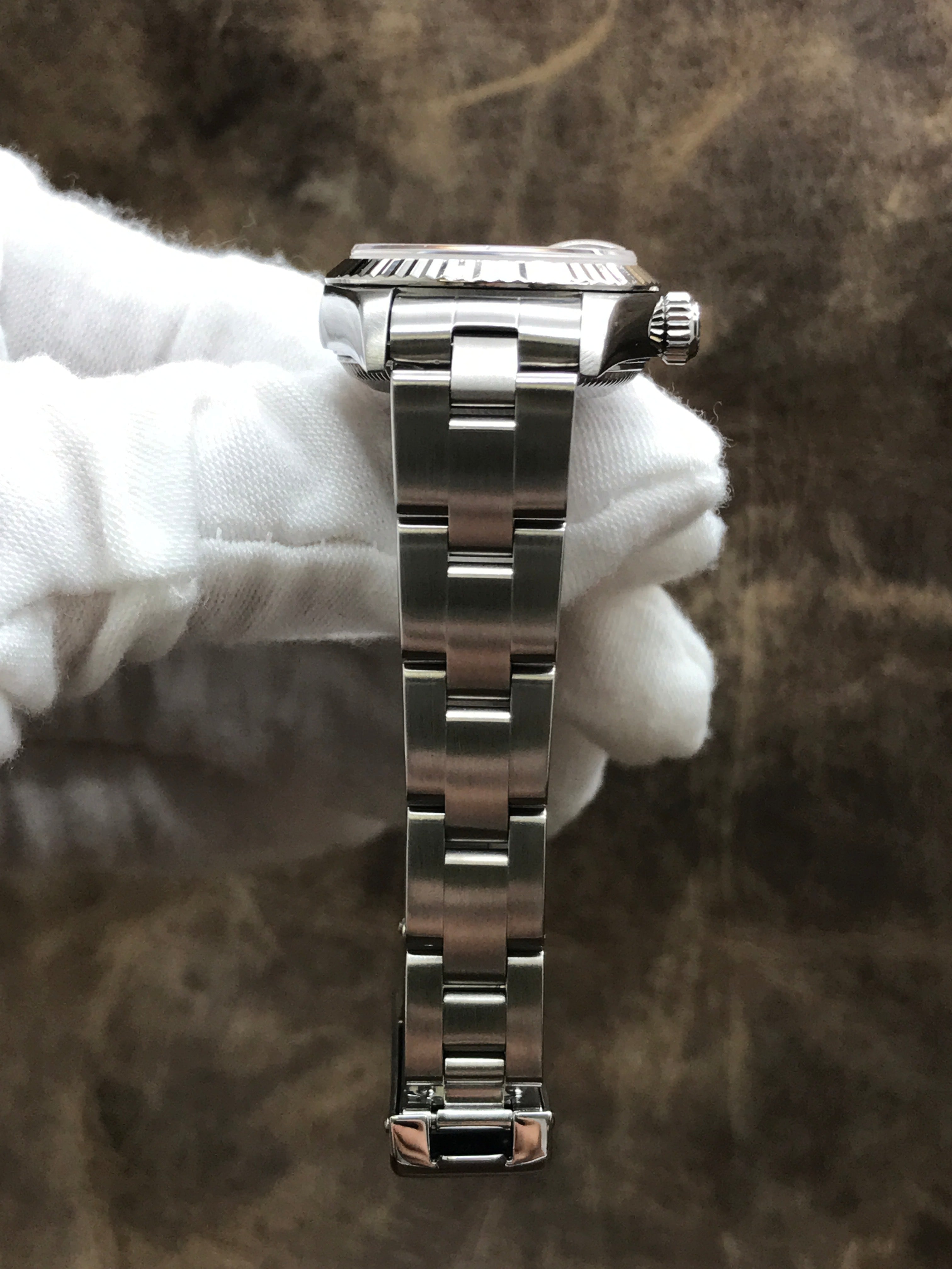 Stainless steel case with a stainless steel oyster bracelet. Fixed fluted stainless steel bezel. Silver dial with silver-tone hands and index hour markers. Dial type: analog. Rolex calibre 2135 automatic movement with about 42 hours of power reserve. Scratch resistant sapphire crystal. Screw-down crown. Solid case back. Case size: 26 mm. Case thickness: 11 mm. Round case shape. Band width: mm. Fold over clasp. Water resistant at 100m/330ft. Functions: date, hour, minute, seconds. Rolex Datejust 26mm 69174 Silver Dial Automatic Women's Watch.