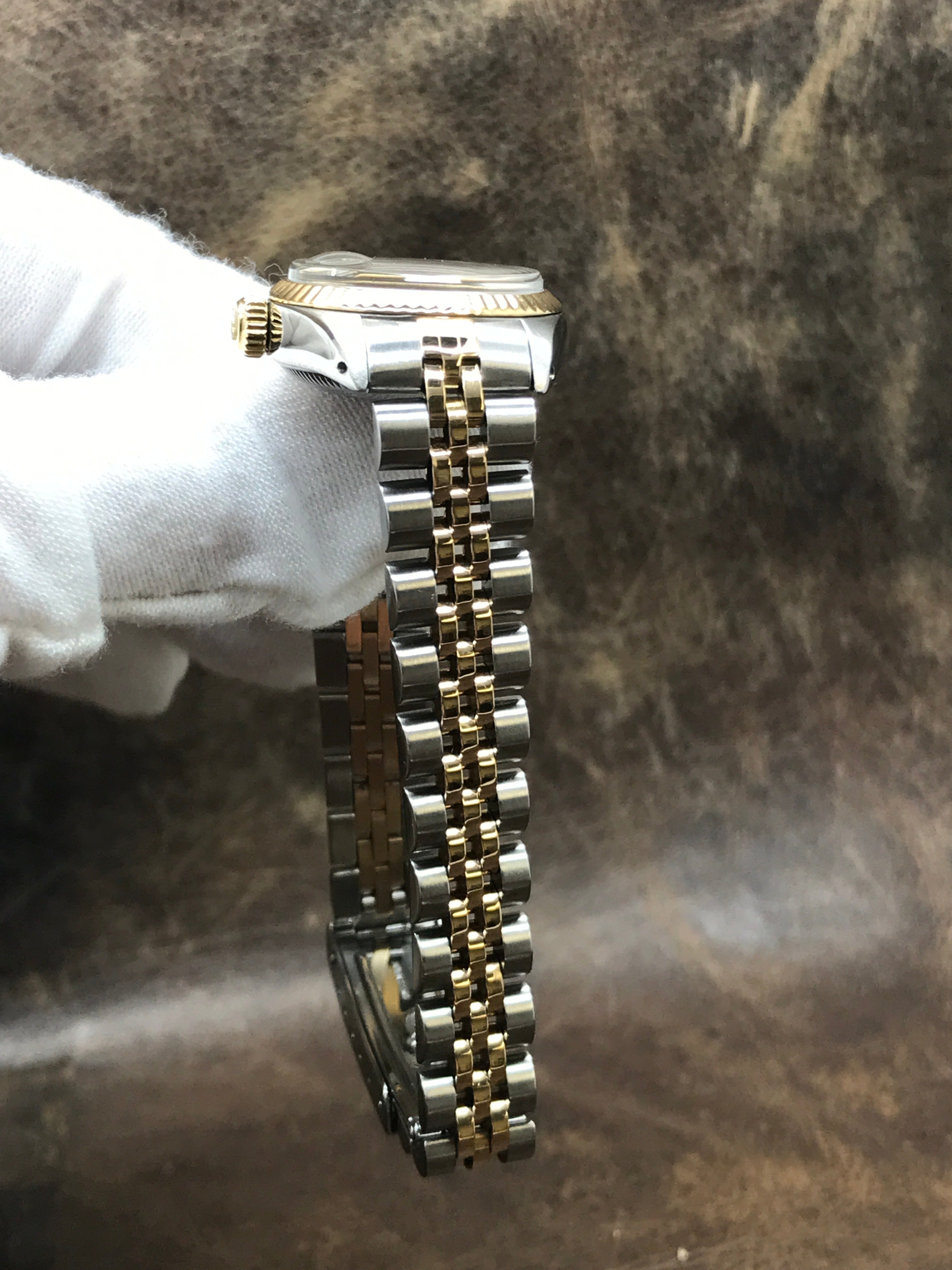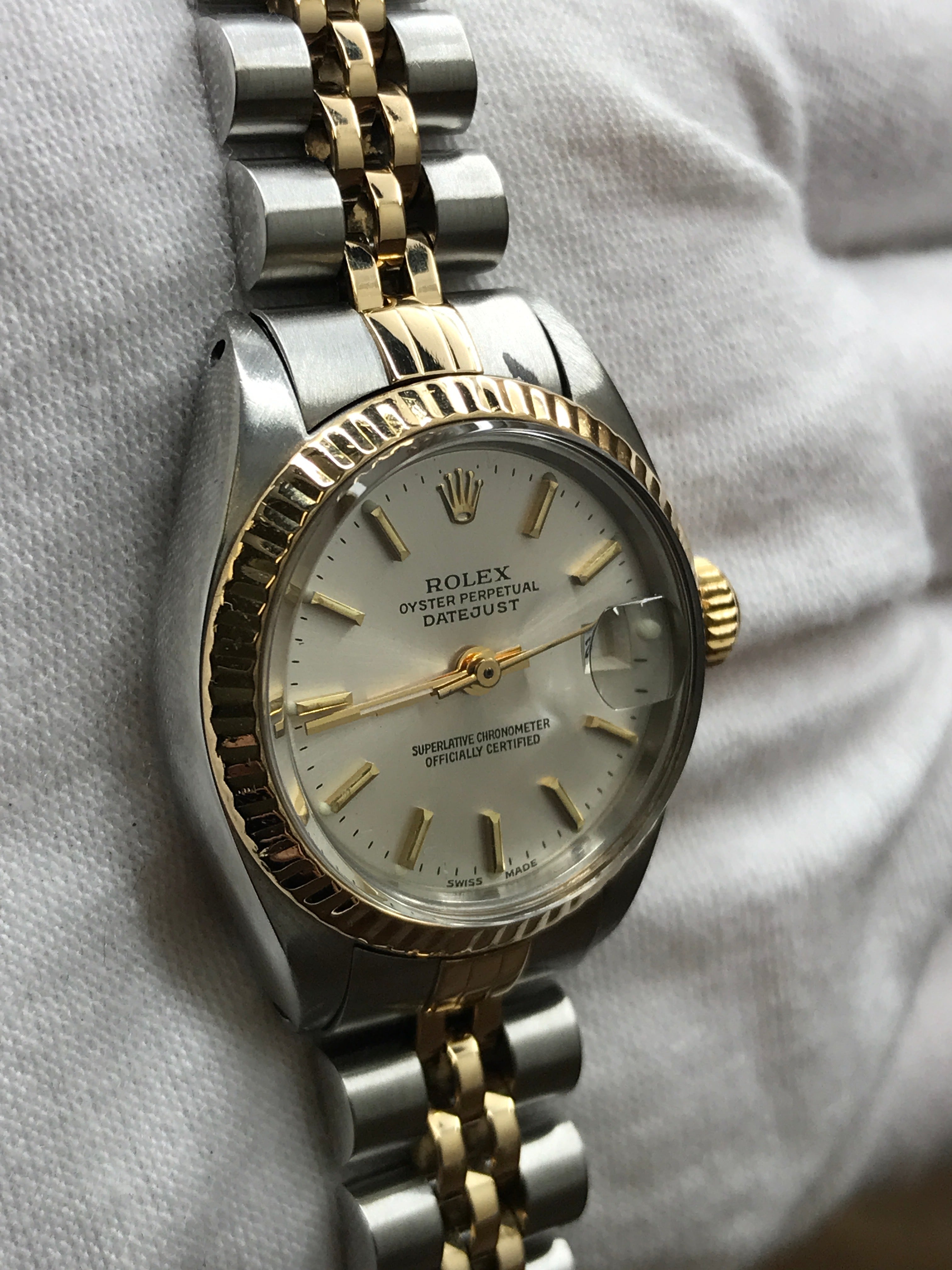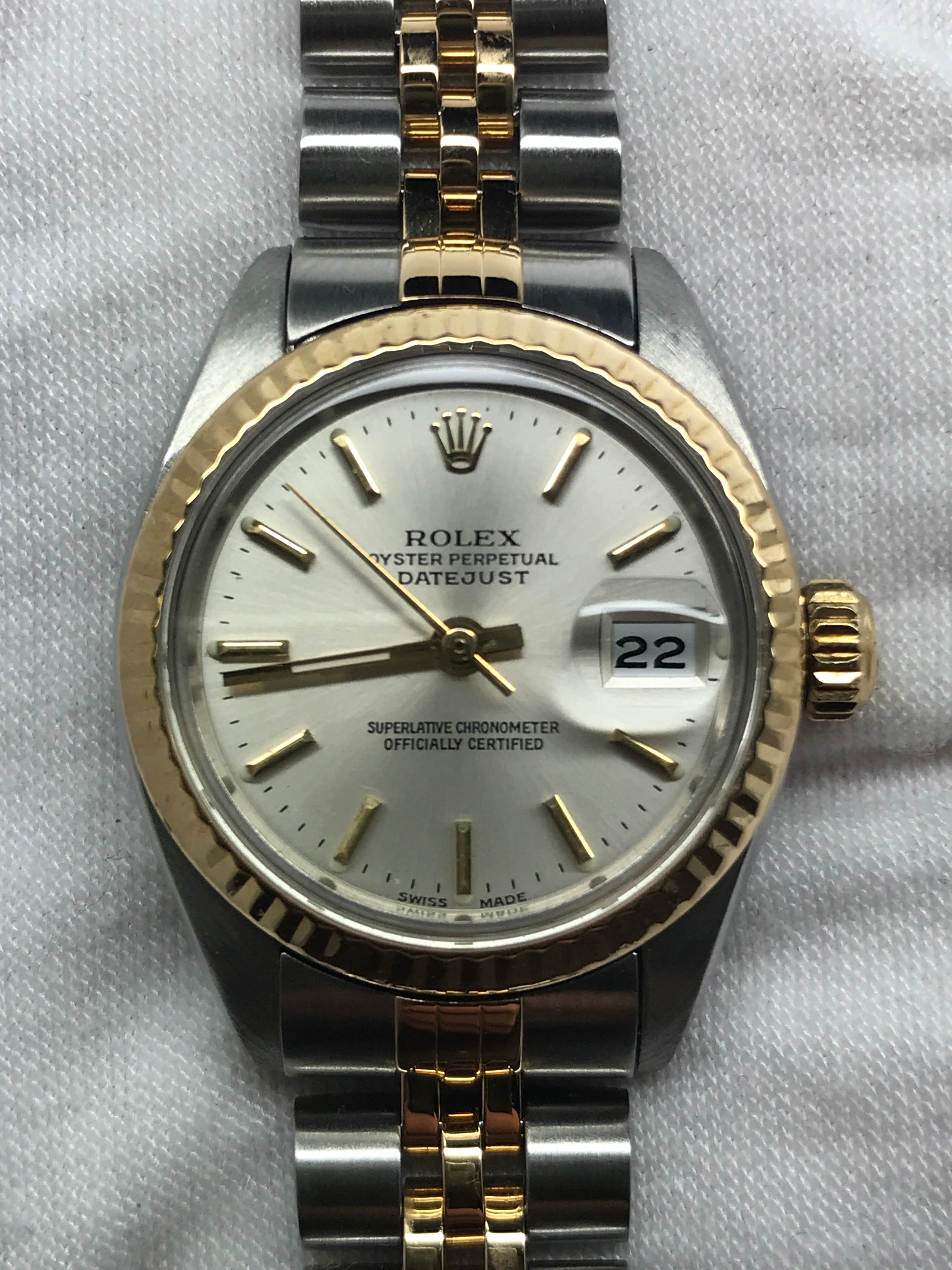 Stainless steel case with a stainless steel & 18k yellow gold jubilee bracelet. Fixed fluted 18k yellow gold bezel. Silver dial with gold-tone hands and index hour markers. Dial type: analog. Luminescent hands and markers. Rolex calibre 2035 automatic movement with about 42 hours of power reserve. Acrylic crystal. Screw down crown. Solid case back. Case size: 26 mm. Case thickness: 11 mm. Round case shape. Band width: mm. Fold over w/ safety release clasp. Functions: date, hour, minute, second. Rolex Datejust 26mm 6917 Silver Dial Automatic Women's Watch.