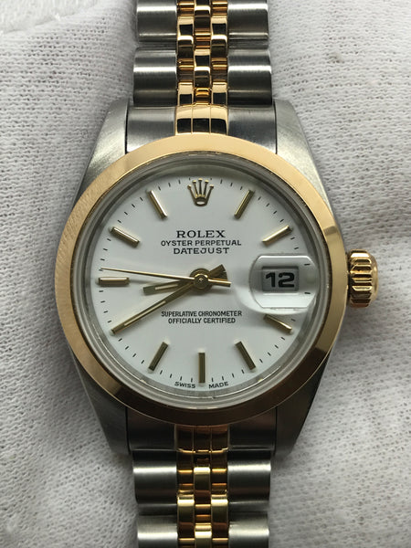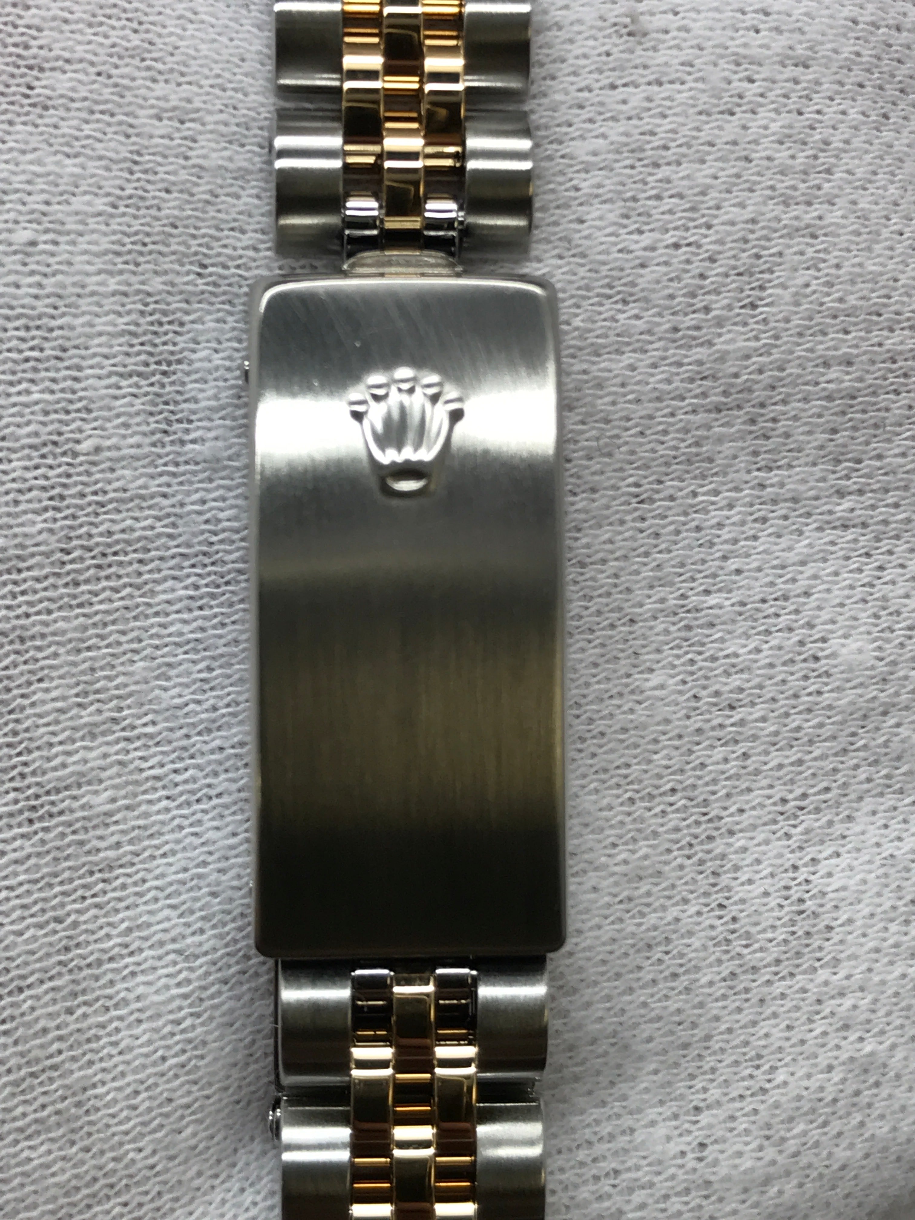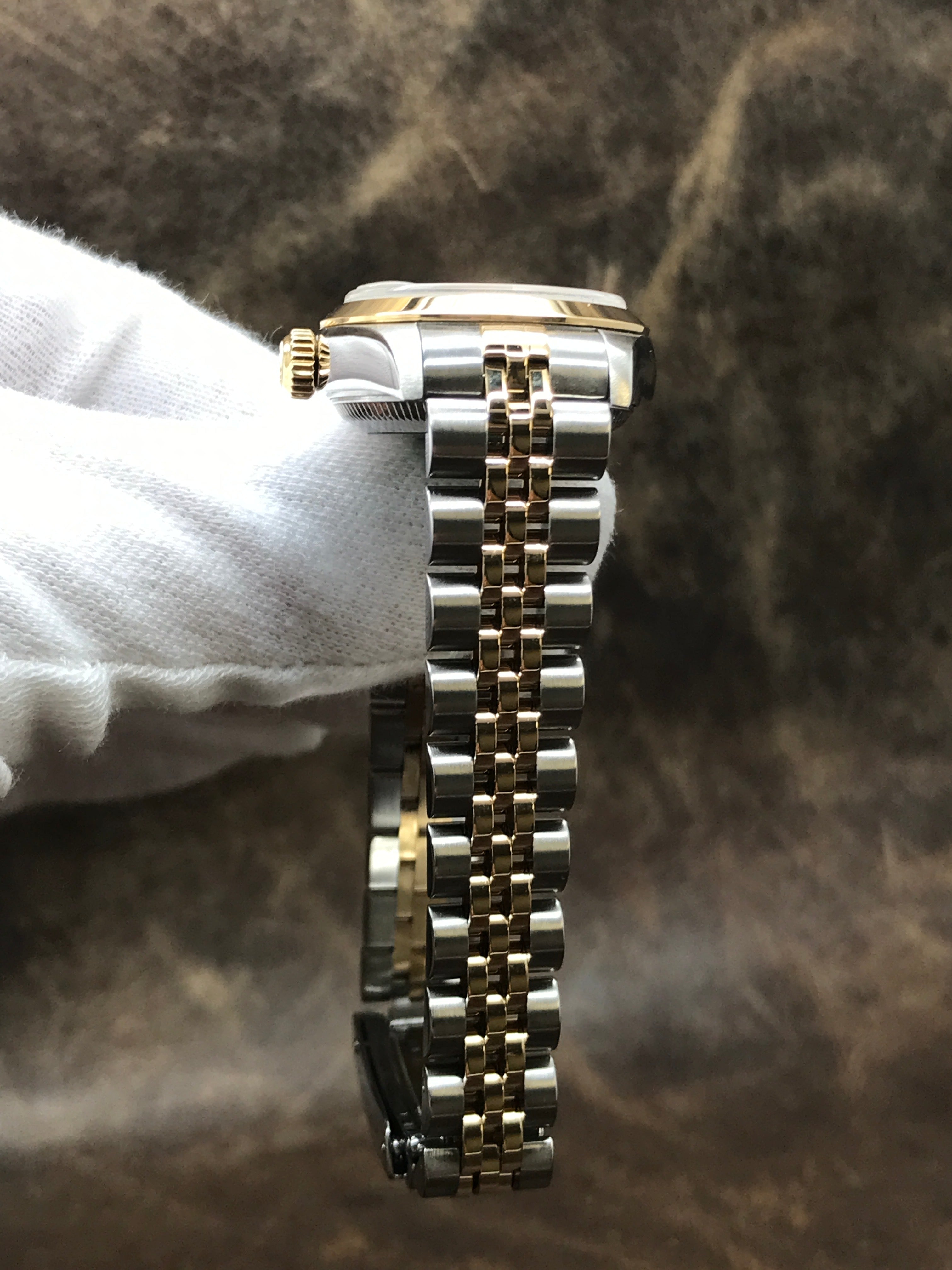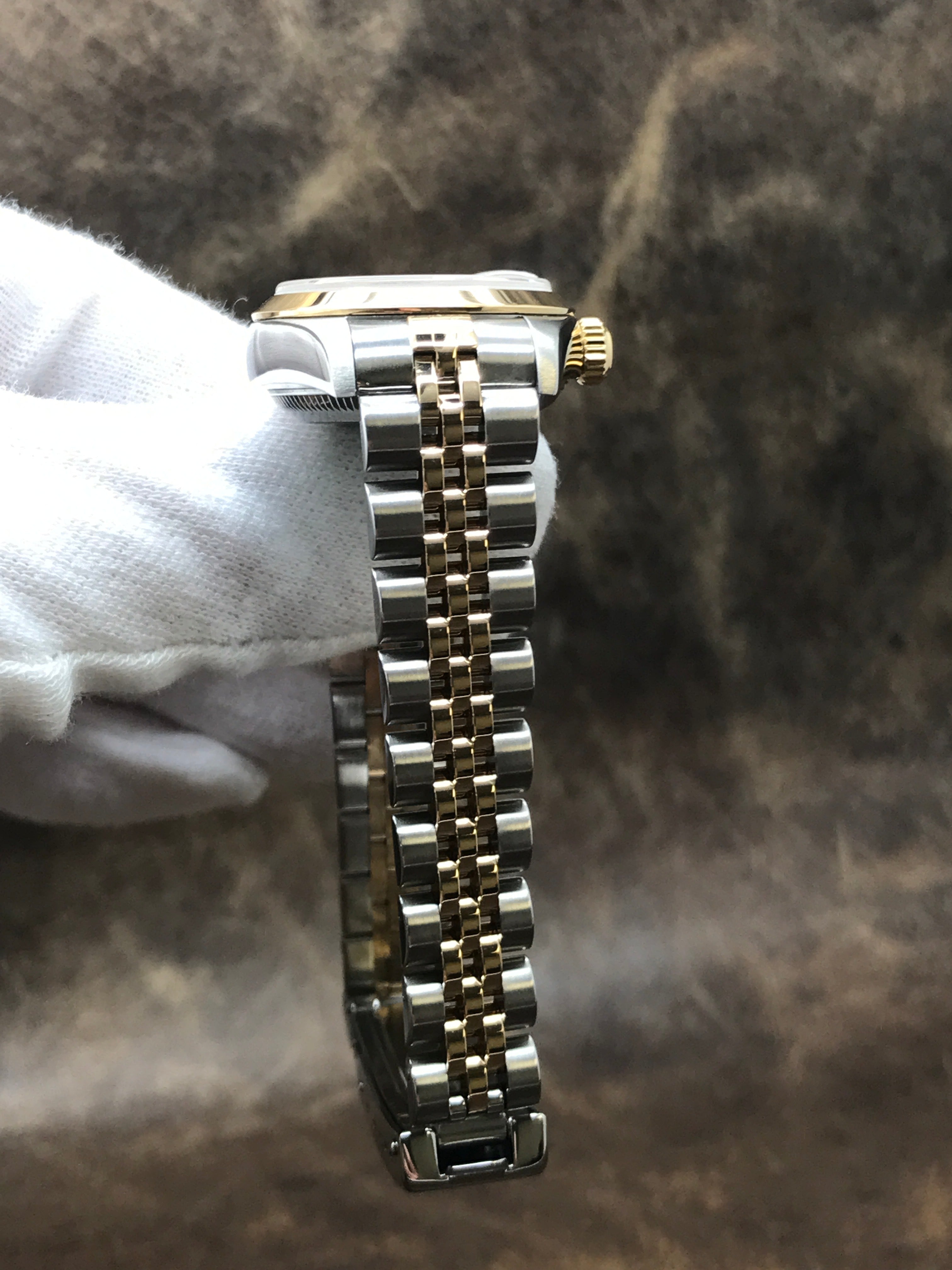 Stainless steel case with a stainless steel & 18k yellow gold jubilee bracelet. Fixed 18k yellow gold bezel. White dial with luminous gold-tone hands and index hour markers. Dial type: analog. 2235 automatic movement with about 48 of power reserve. Sapphire crystal. Screw down crown. Solid case back. Case size: 26 mm. Case thickness: 10.2 mm. Round case shape. Band width: mm. Fold over w/ safety release clasp. Water resistant at 100 meters / 330 feet. Functions: hour, minute, seconds, date. Rolex Datejust 26mm 79163 White Dial Automatic Women's Watch.