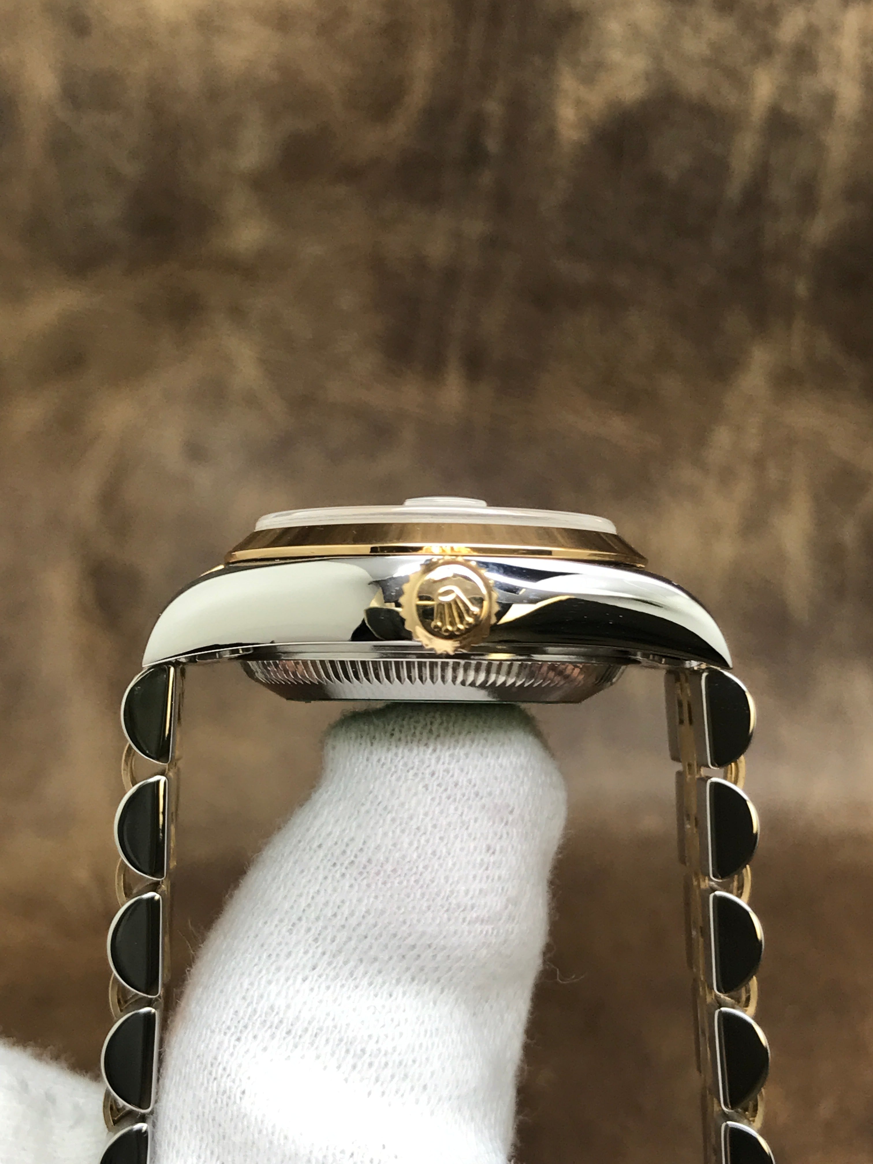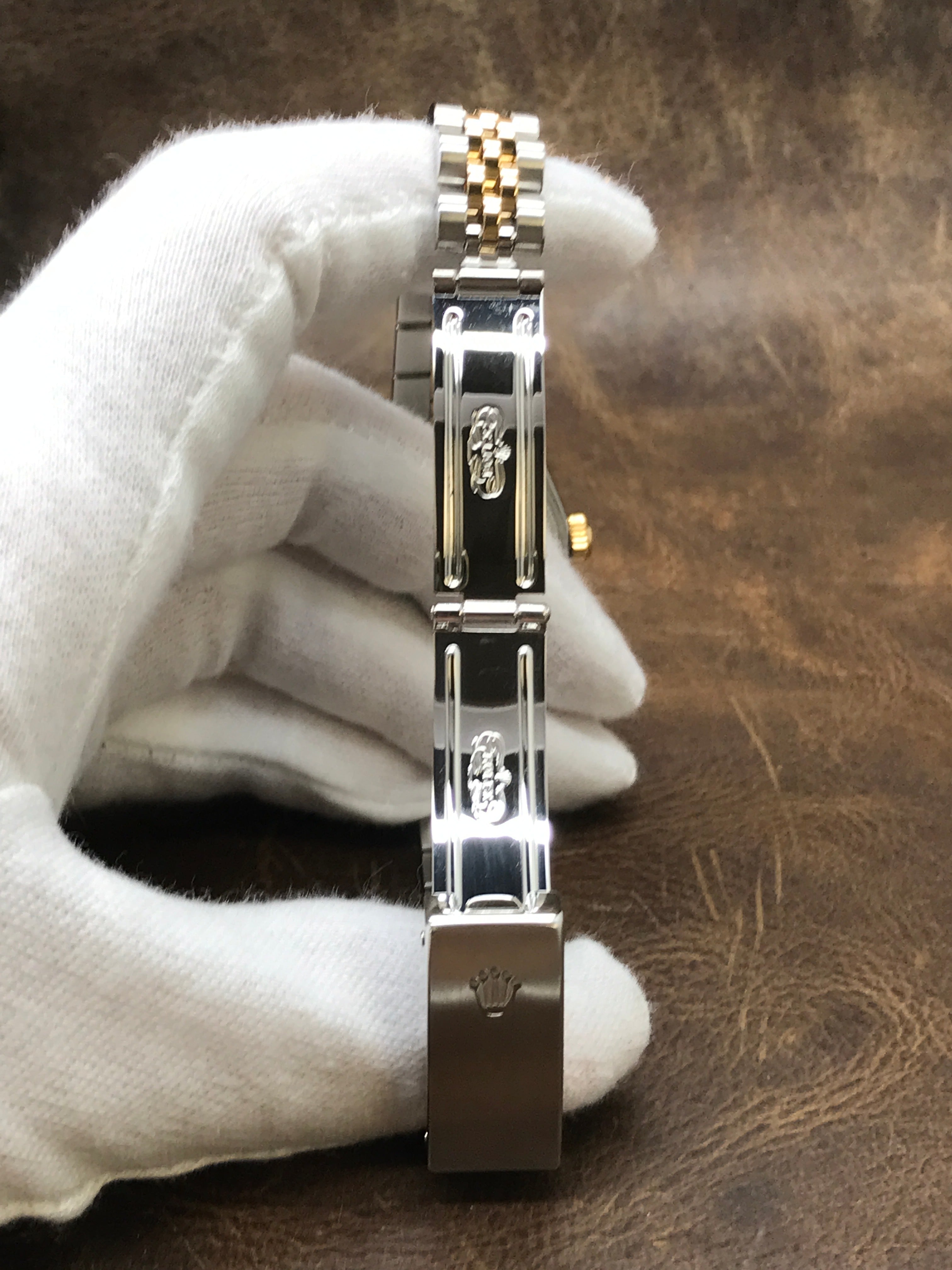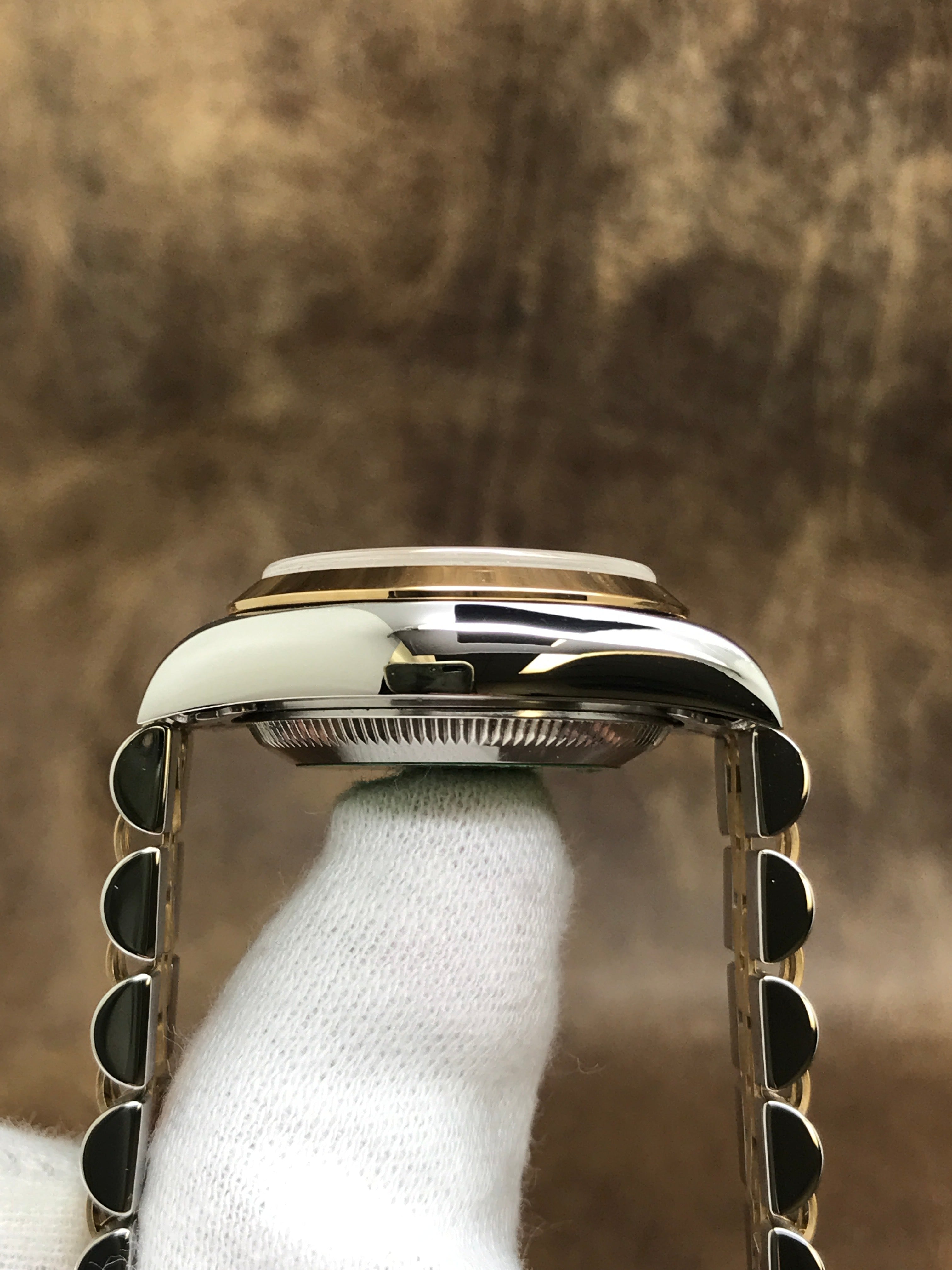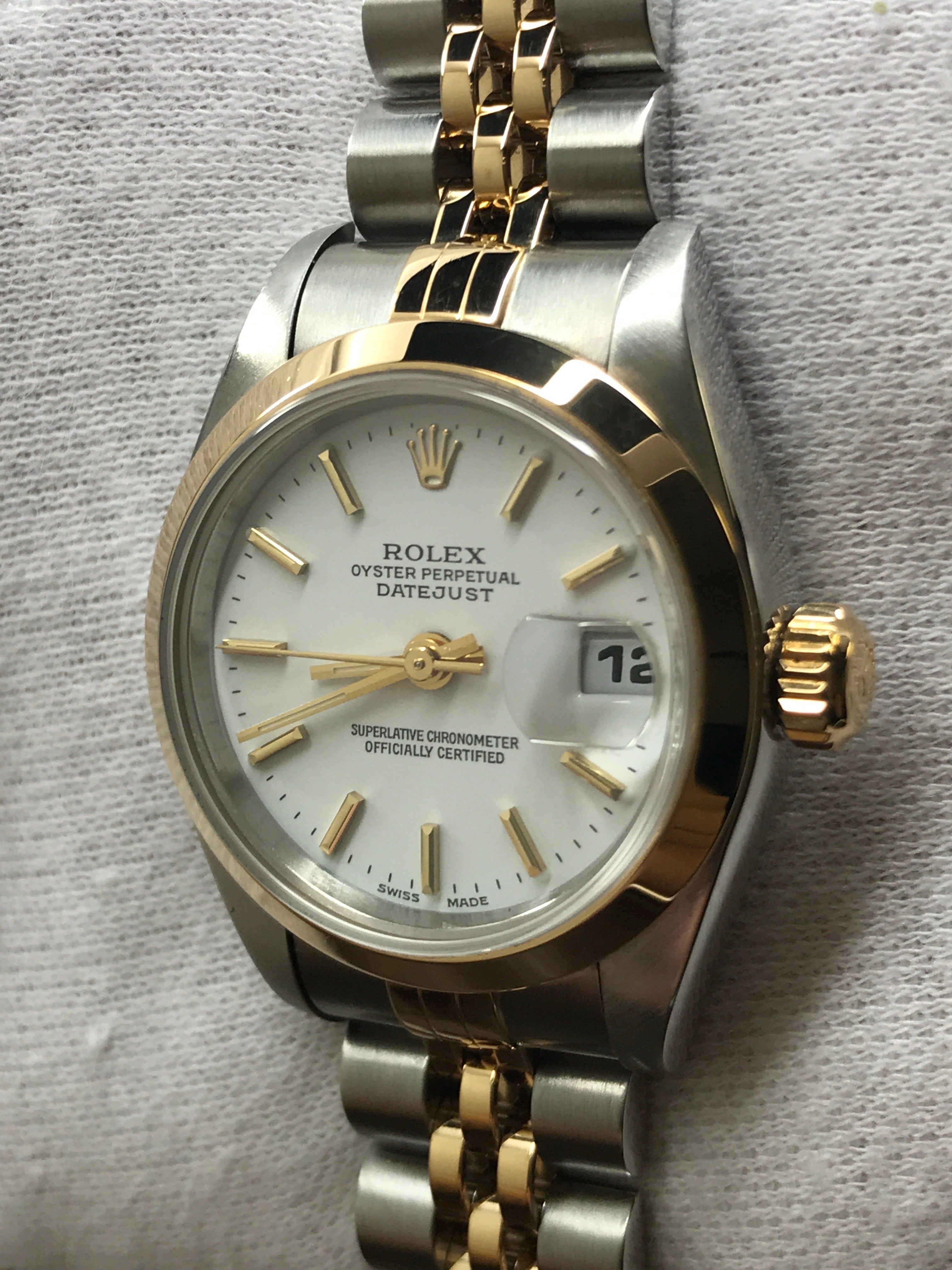 Stainless steel case with a stainless steel & 18k yellow gold jubilee bracelet. Fixed 18k yellow gold bezel. White dial with luminous gold-tone hands and index hour markers. Dial type: analog. 2235 automatic movement with about 48 of power reserve. Sapphire crystal. Screw down crown. Solid case back. Case size: 26 mm. Case thickness: 10.2 mm. Round case shape. Band width: mm. Fold over w/ safety release clasp. Water resistant at 100 meters / 330 feet. Functions: hour, minute, seconds, date. Rolex Datejust 26mm 79163 White Dial Automatic Women's Watch.