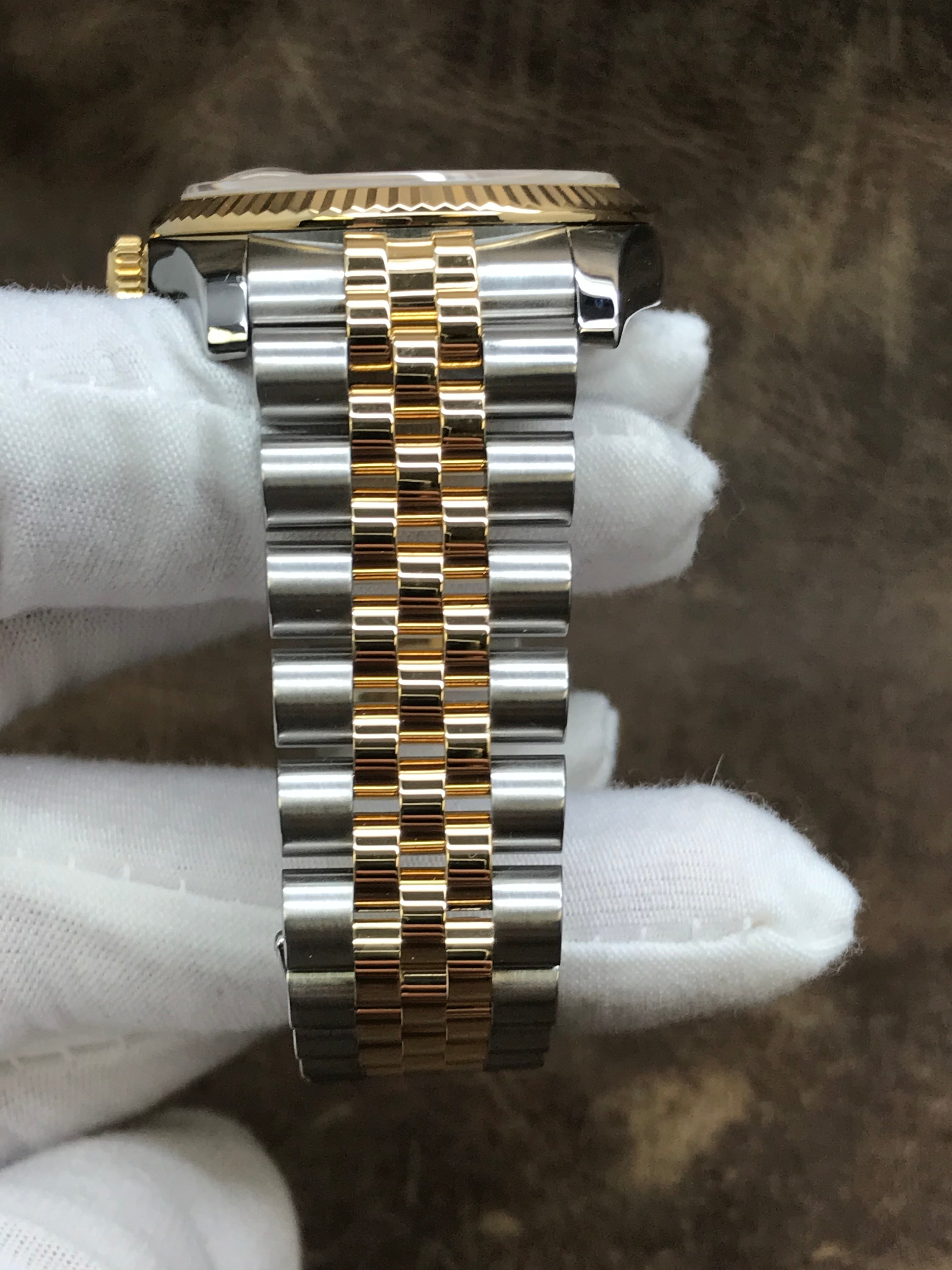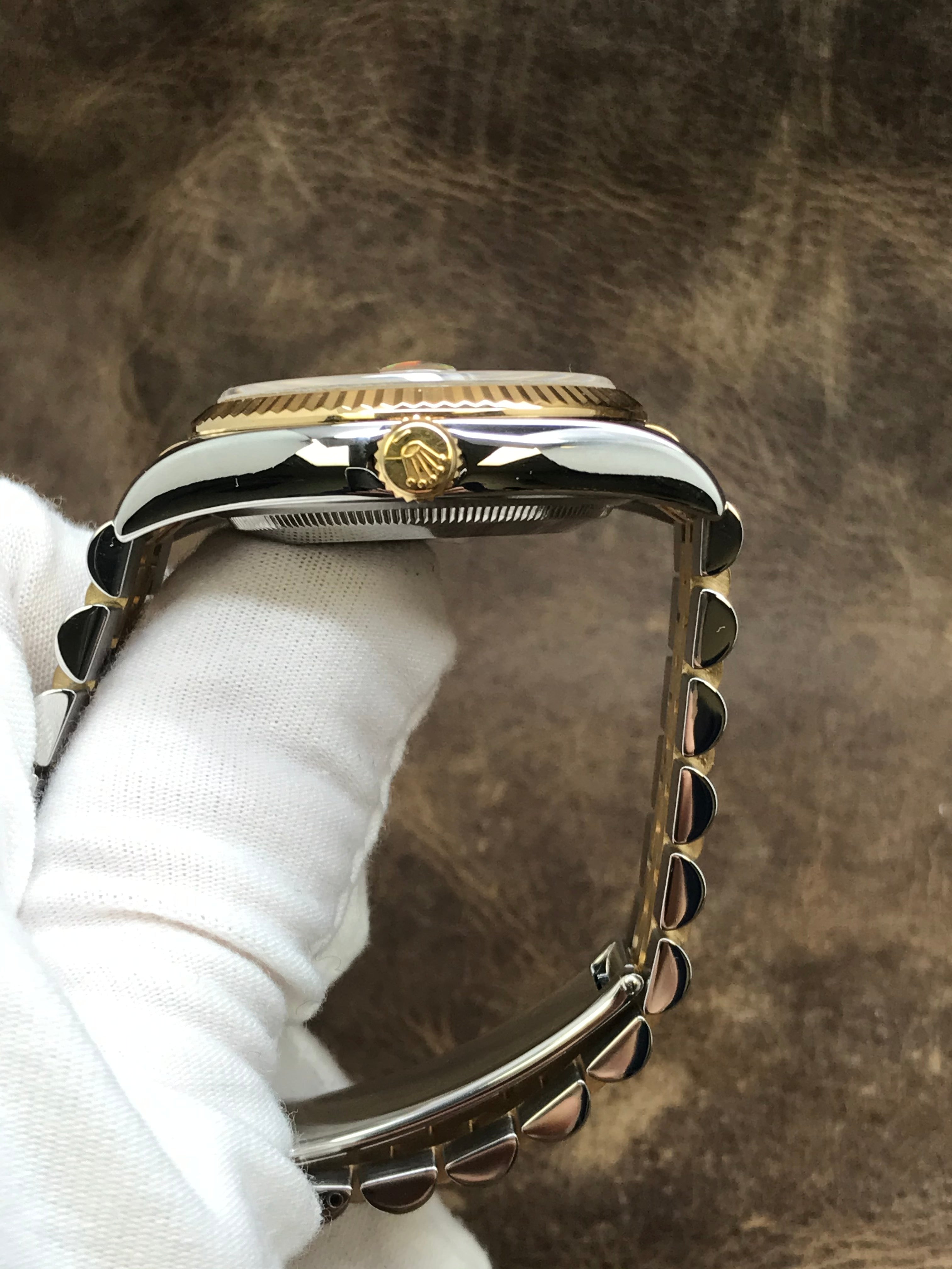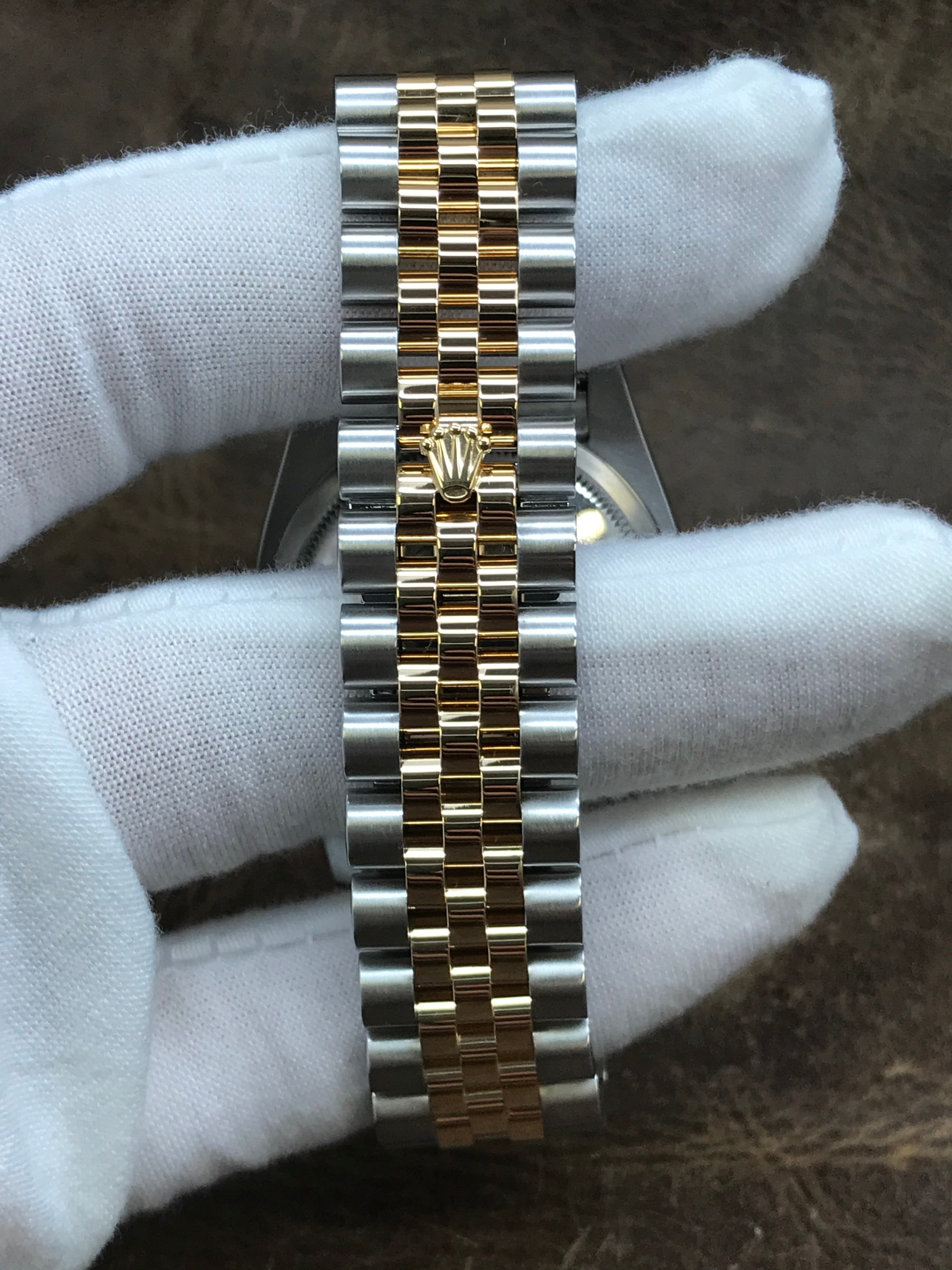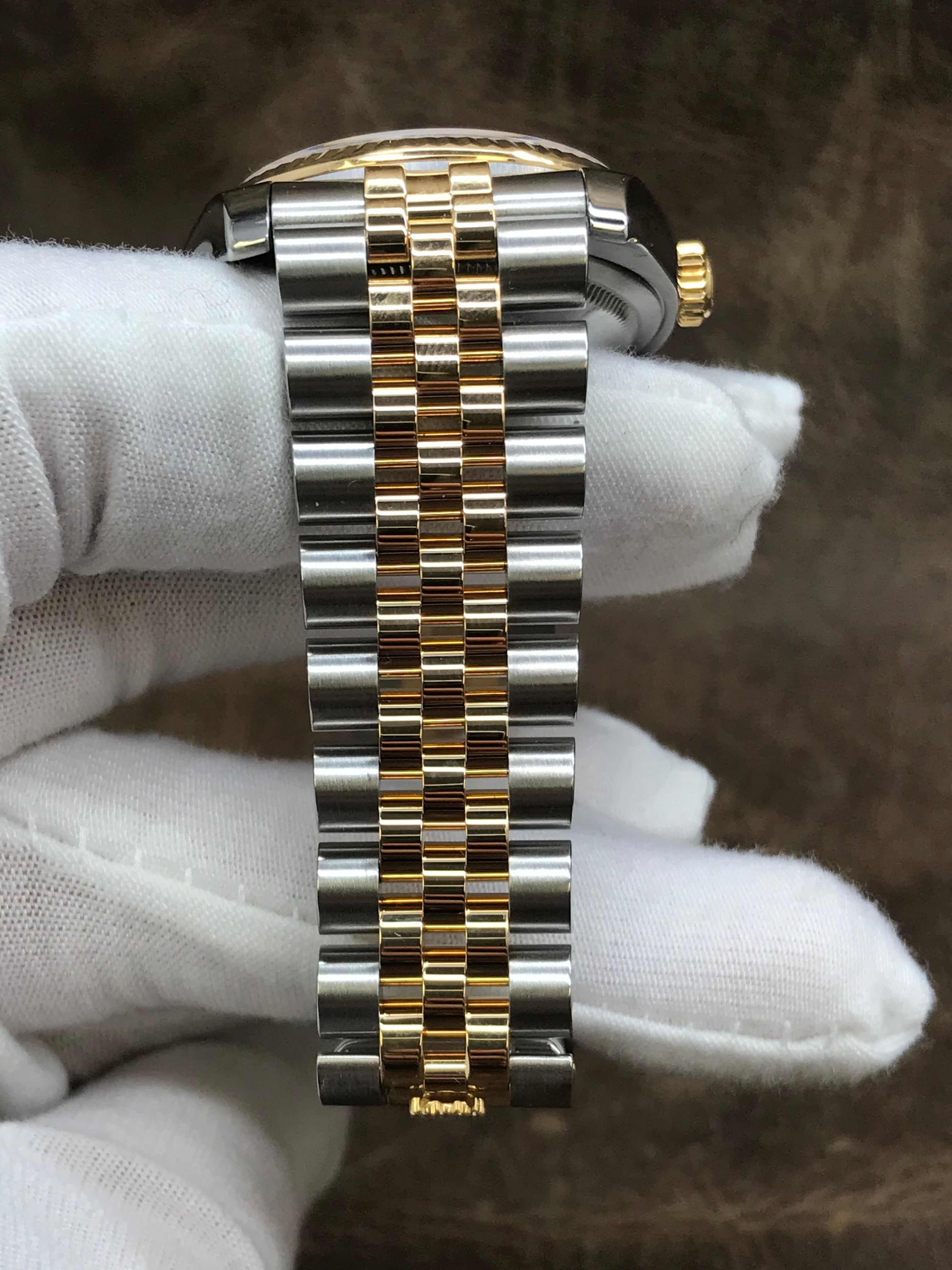 Stainless steel case with a 18kt yellow gold and stainless steel jubilee bracelet. Fixed fluted 18k yellow gold bezel. Champagne dial with gold tone & luminous hands and luminous index hour markers. Dial type: analog. Luminescent hands and markers. Rolex calibre 3135 automatic movement with about 48 hours of power reserve. Scratch resistant sapphire crystal. Screw down crown. Solid case back. Case size: 36 mm. Case thickness: 12 mm. Round case shape. Band width: 20 mm. Hidden deployant clasp. Water resistant at 100 meters / 330 feet. Functions: date, hour, minute, second, chronometer. Rolex Datejust 36mm 116233 Champagne Dial Automatic Watch.