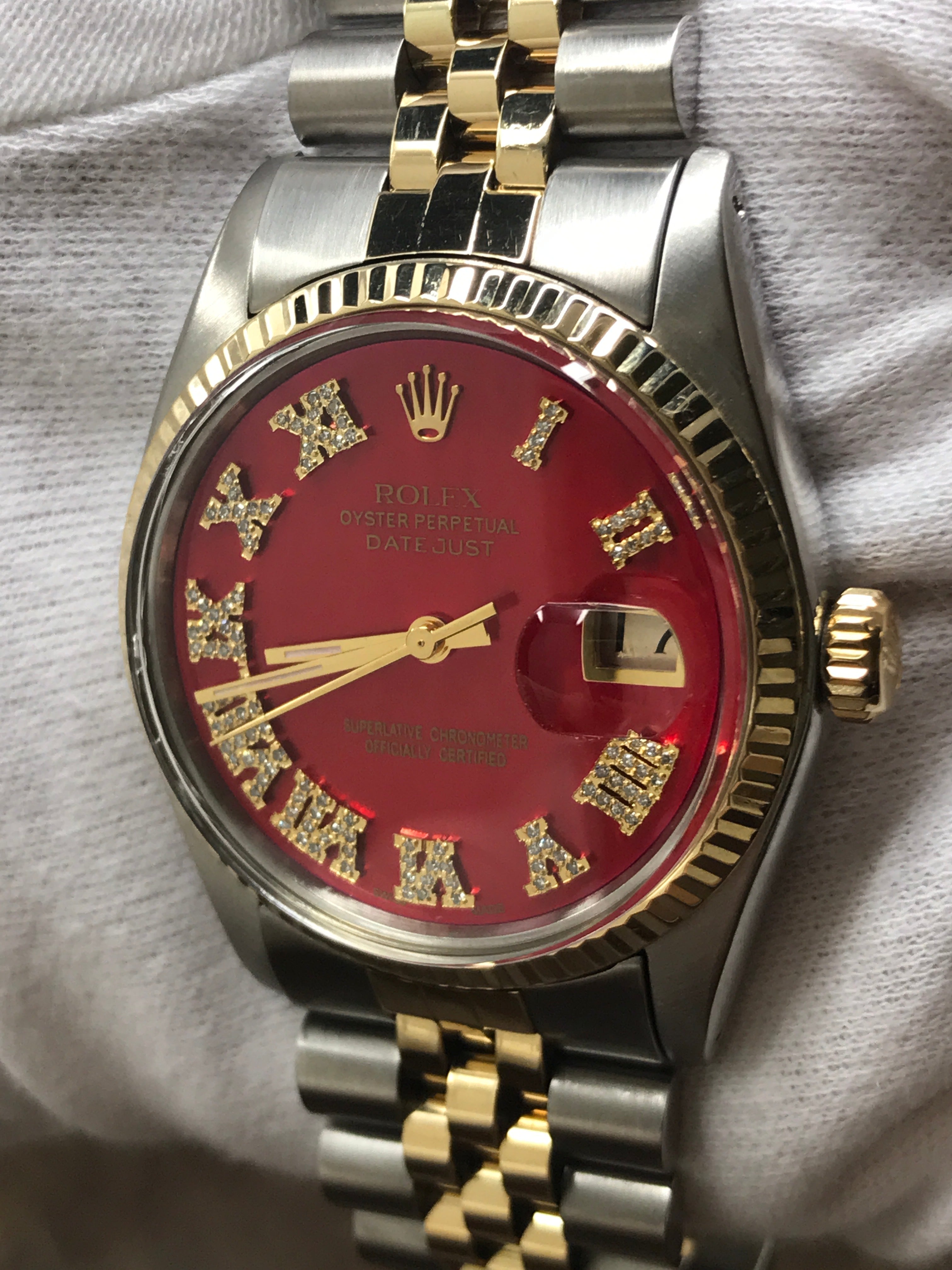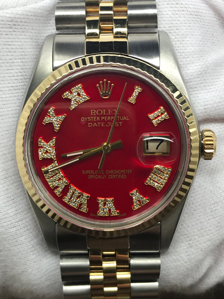 Stainless steel case with a stainless steel & 18k yellow gold jubilee bracelet. Fixed fluted 18k yellow gold bezel. Custom red diamond dial with gold-tone hands and custom added diamonds on Roman numerals hour markers. Dial type: analog. Luminescent hands. Rolex calibre 3035 automatic movement with about 50 hours of power reserve. Scratch resistant sapphire crystal. Screw down crown. Solid case back. Case size: 36 mm. Case thickness: 12 mm. Round case shape. Band width: mm. Fold over clasp. Water resistant at 100 meters / 330 feet. Functions: date, hour, minute, second, chronometer. Rolex Datejust 36mm 16013 Custom Red Diamond Dial Automatic Watch.