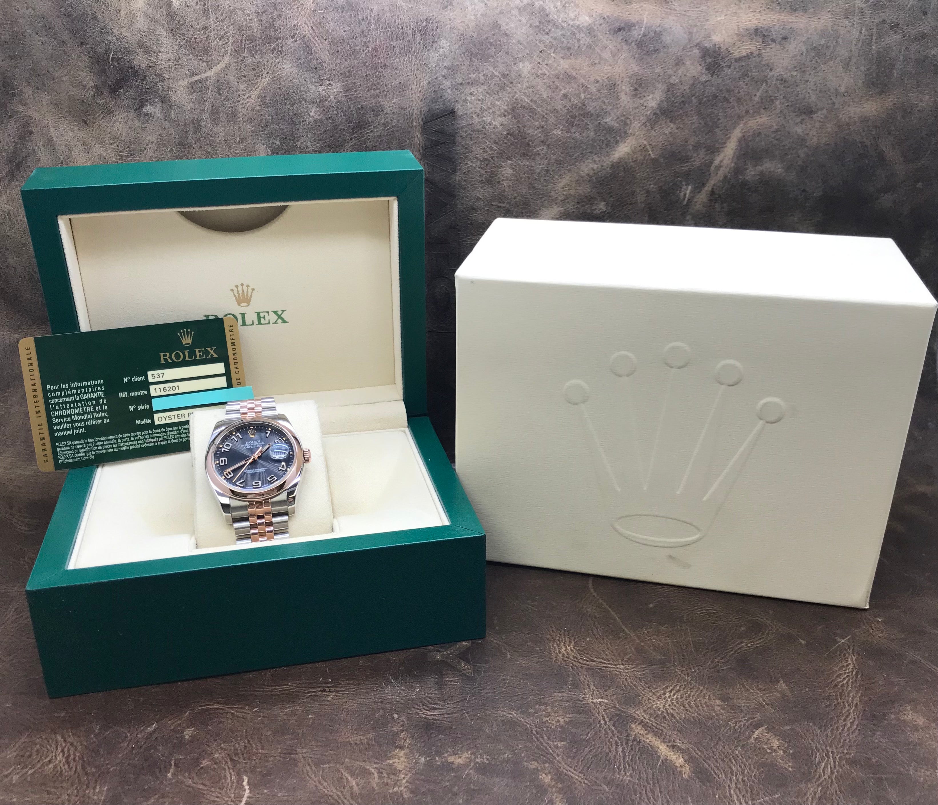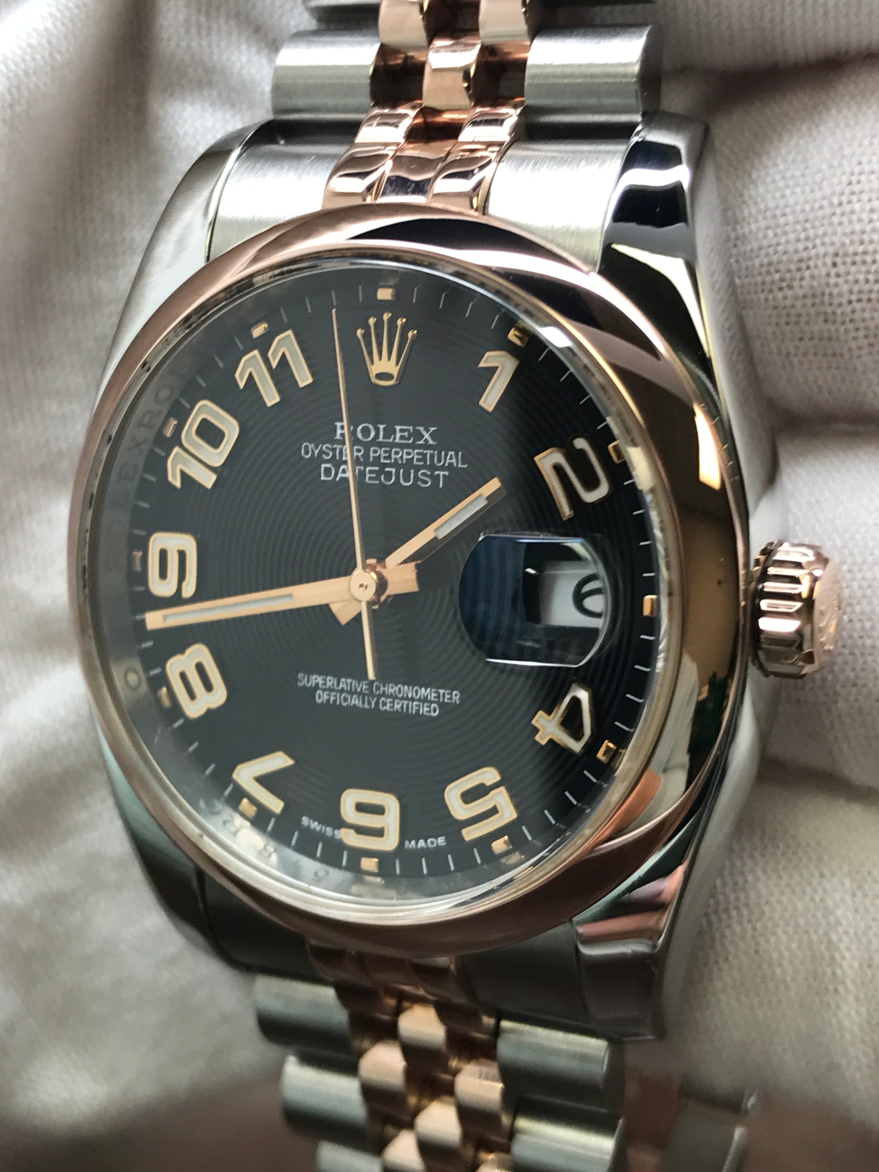 Stainless steel case with a stainless steel & 18k rose gold Rolex jubilee bracelet. Fixed domed 18k rose gold bezel. Black dial with luminous rose gold hands and Arabic hour markers. Dial type: analog. Cal. 3135 automatic movement with about 50 hours of power reserve. Scratch resistant sapphire crystal. Screw down crown. Solid case back. Case size: 36 mm. Case thickness: 11.6 mm. Round case shape. Band width: mm. Hidden deployment clasp. Water resistant at 100 meters / 330 feet. Functions: hours, minutes, seconds, date. Rolex Datejust 36mm 116201 Black Dial Automatic Watch.