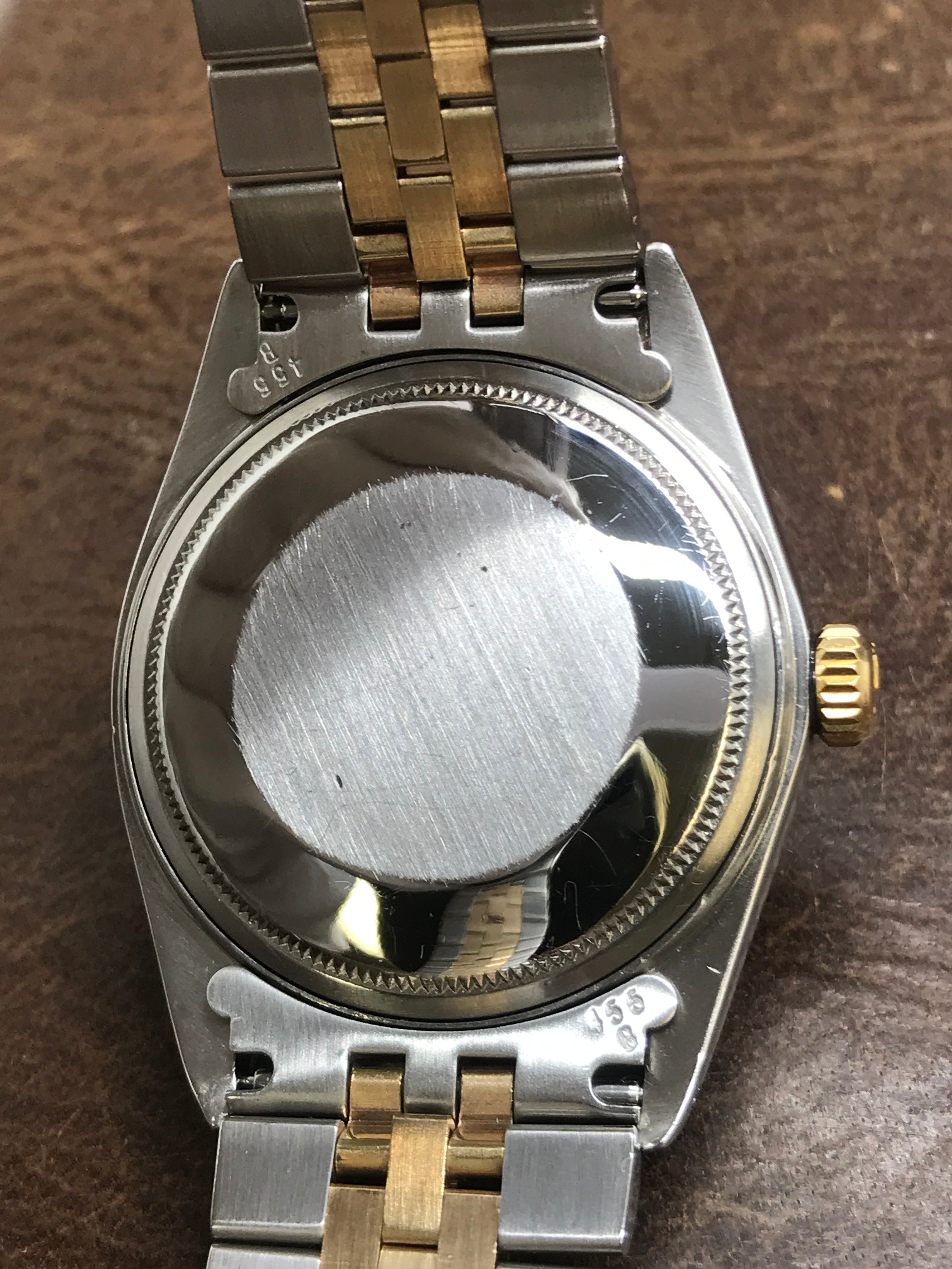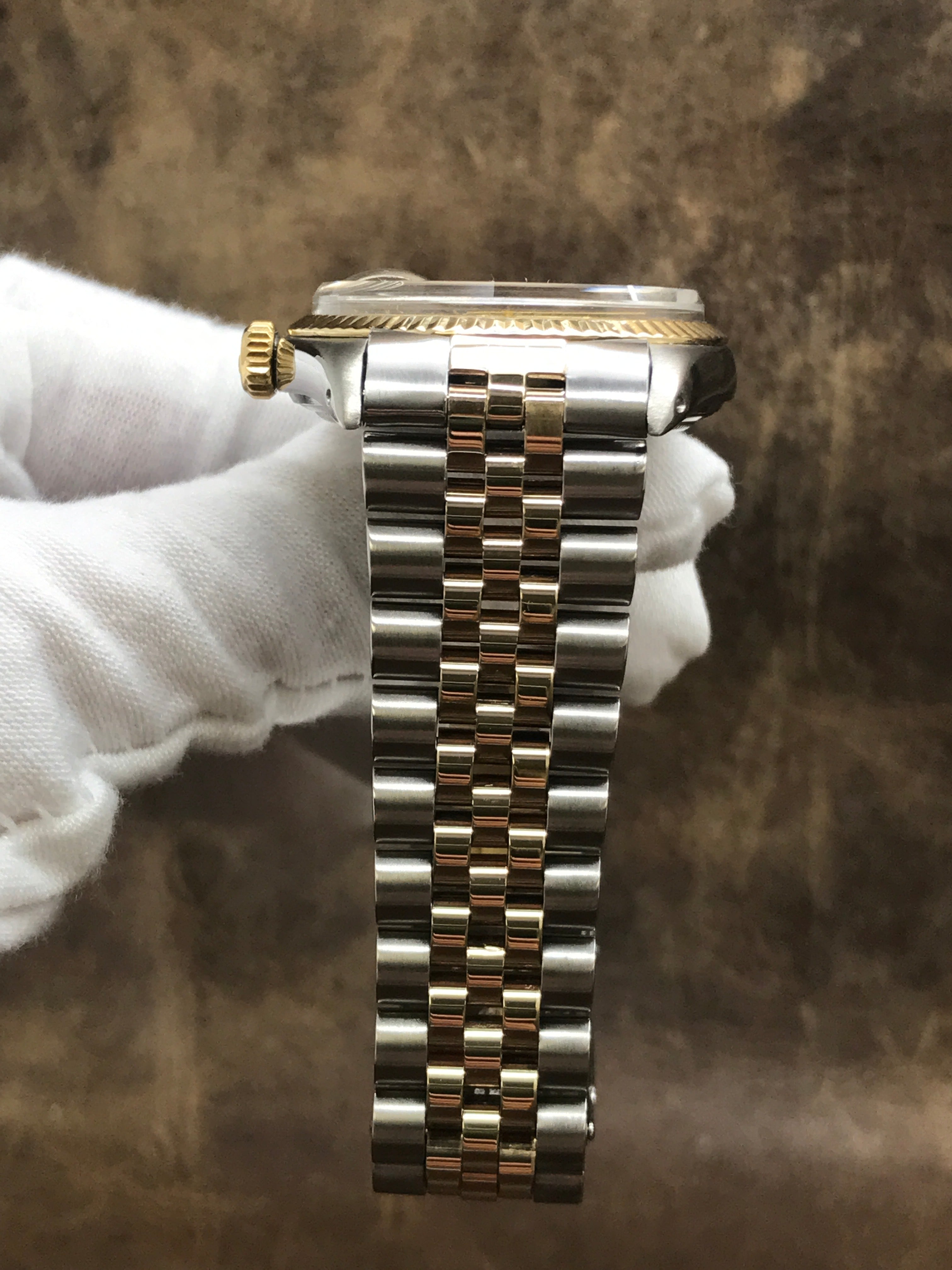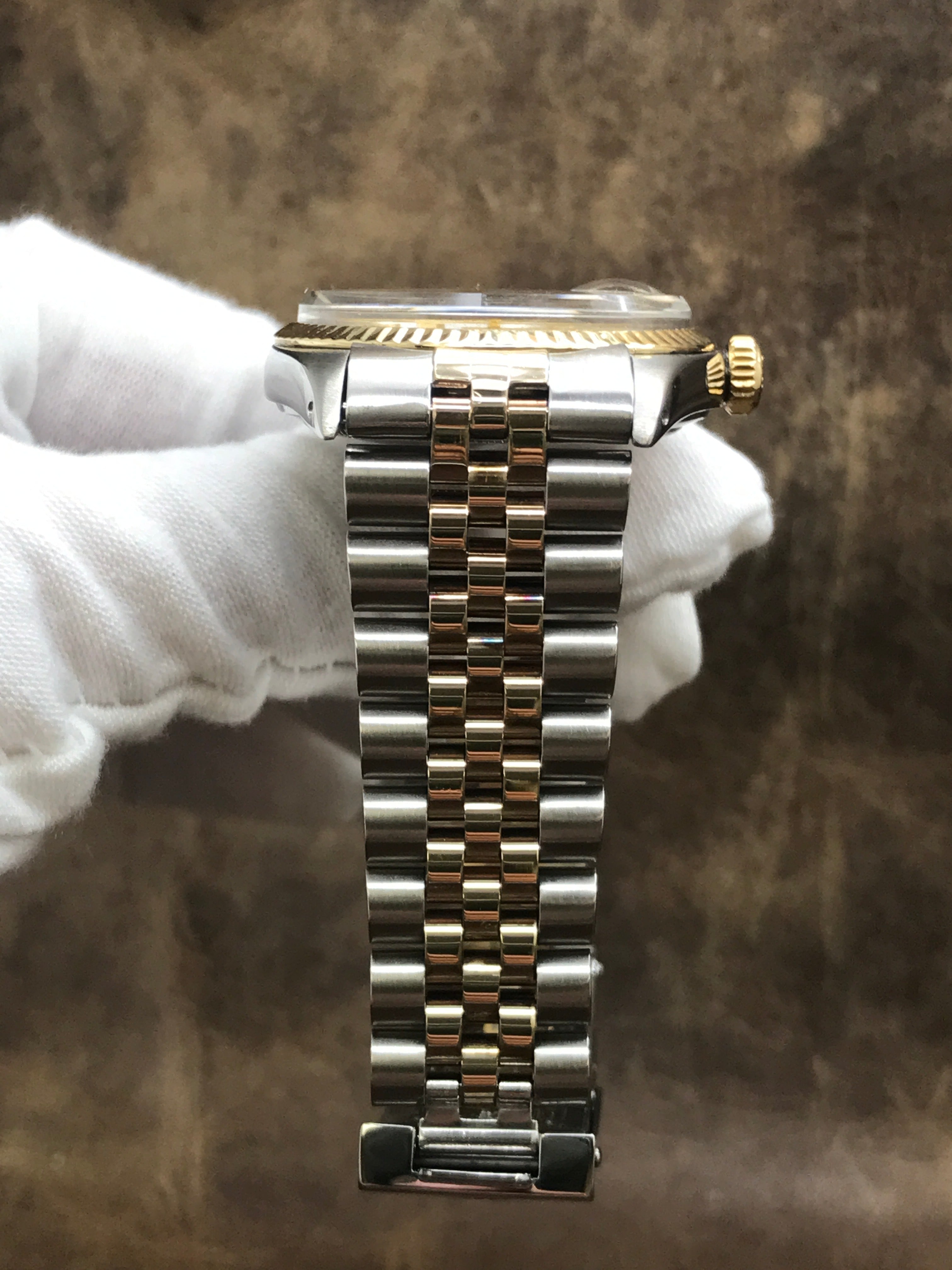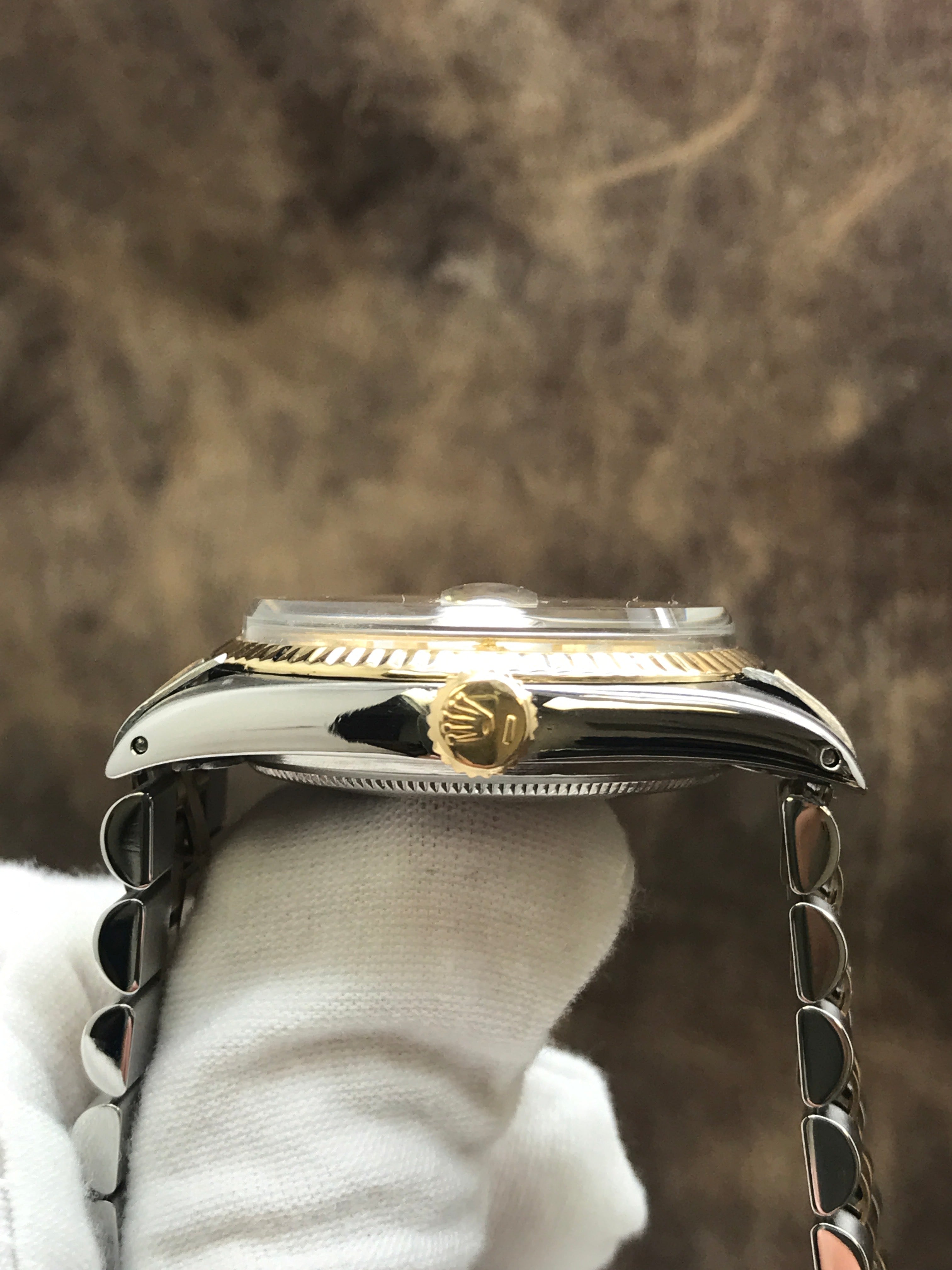 Stainless steel case with a stainless steel & 18k yellow gold jubilee bracelet. Fixed fluted 18k yellow gold bezel. Silver dial with gold-tone hands and index hour markers. Dial type: analog. Luminescent hands and markers. Rolex calibre 1575 automatic movement with about 50 hours of power reserve. Acrylic crystal. Screw down crown. Solid case back. Case size: 36 mm. Case thickness: 11.5 mm. Round case shape. Band width: mm. Fold over w/ safety release clasp. Water resistant at 100 meters / 330 feet. Functions: date, hour, minute, second. Rolex Datejust 36mm 1601 Silver Dial Automatic Watch.