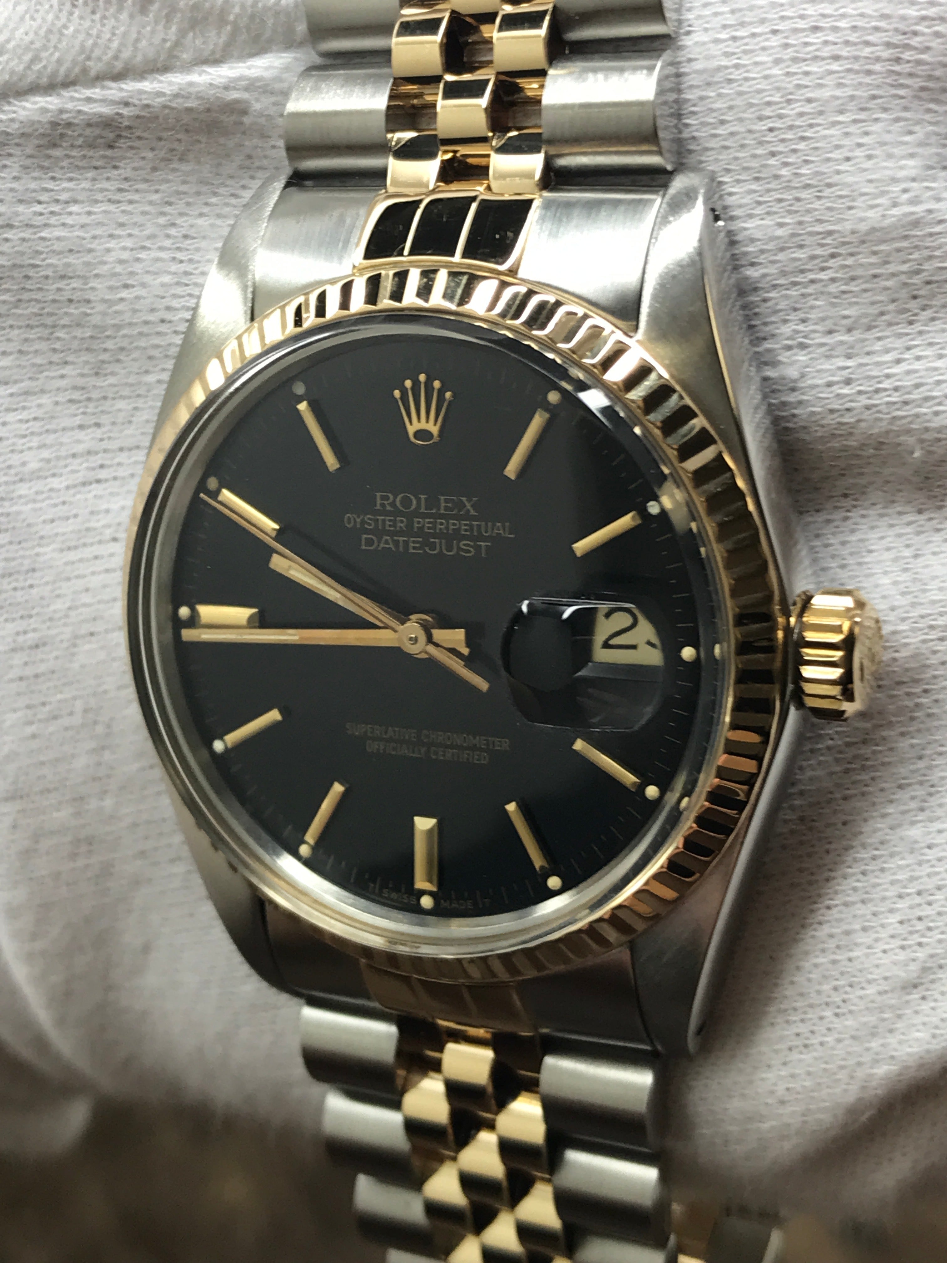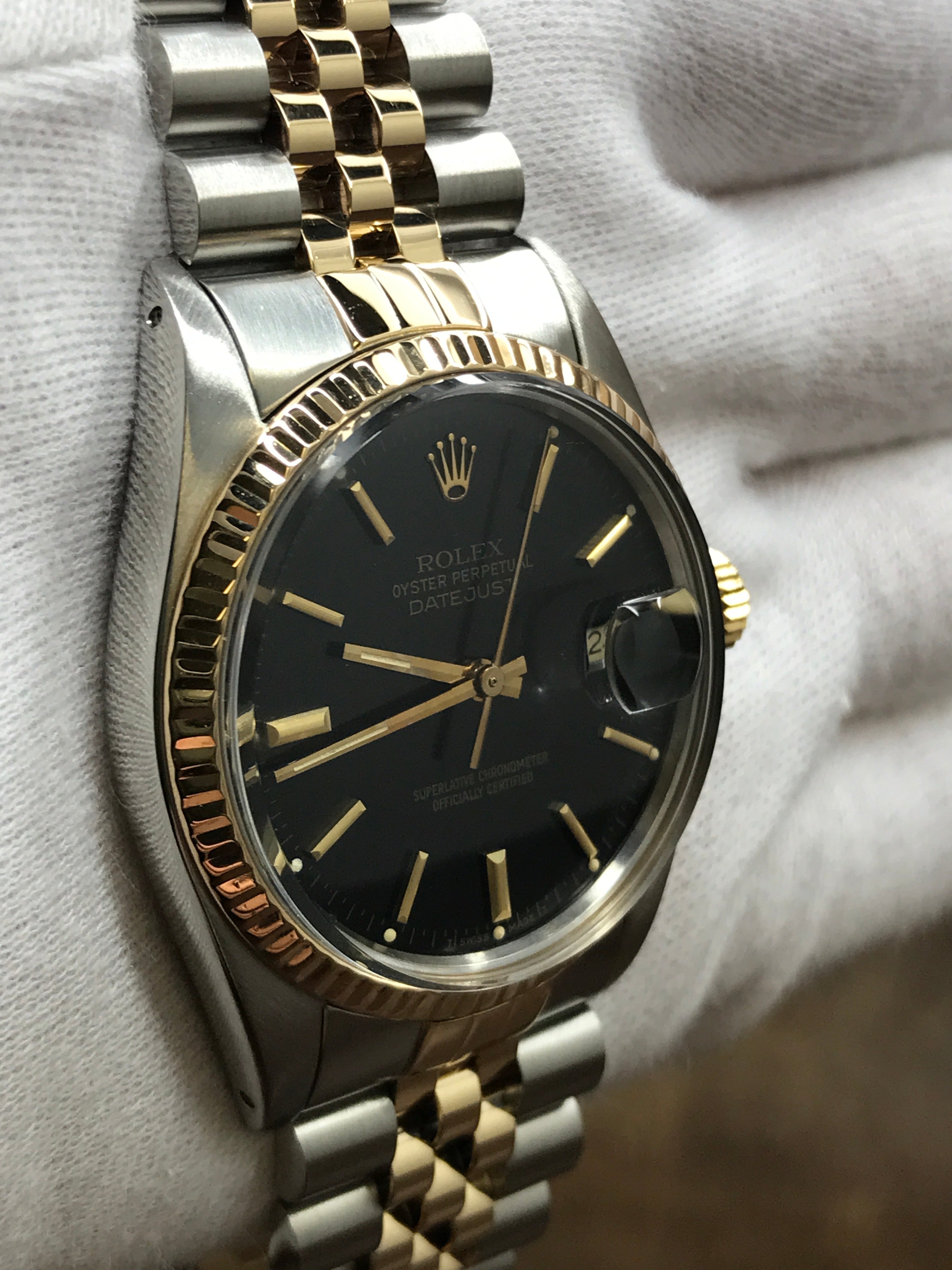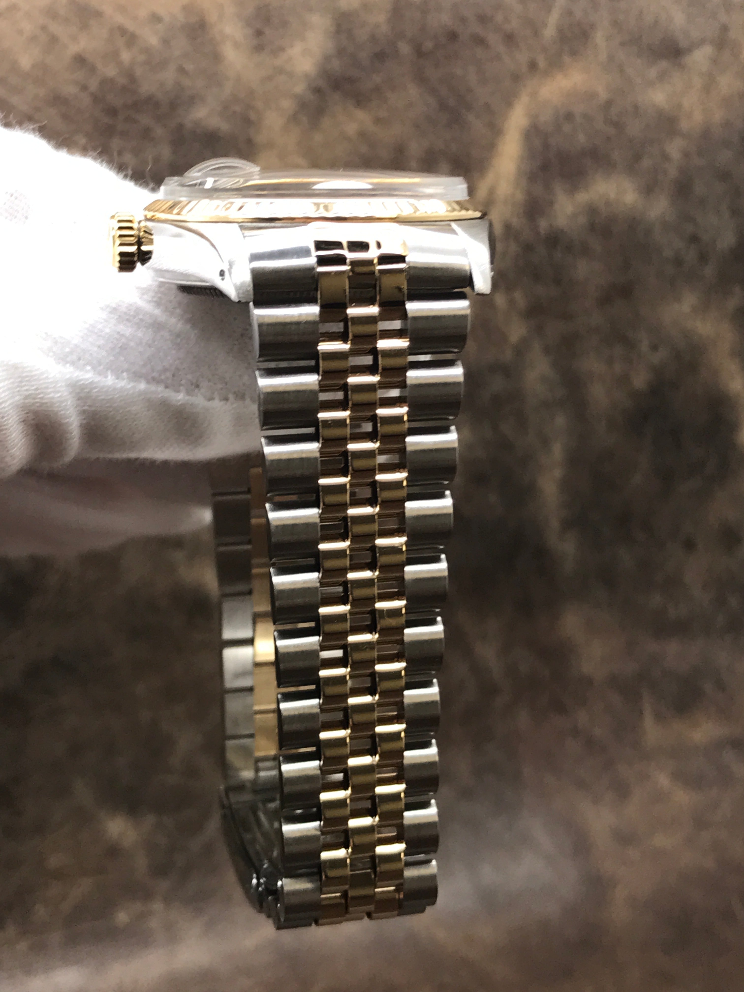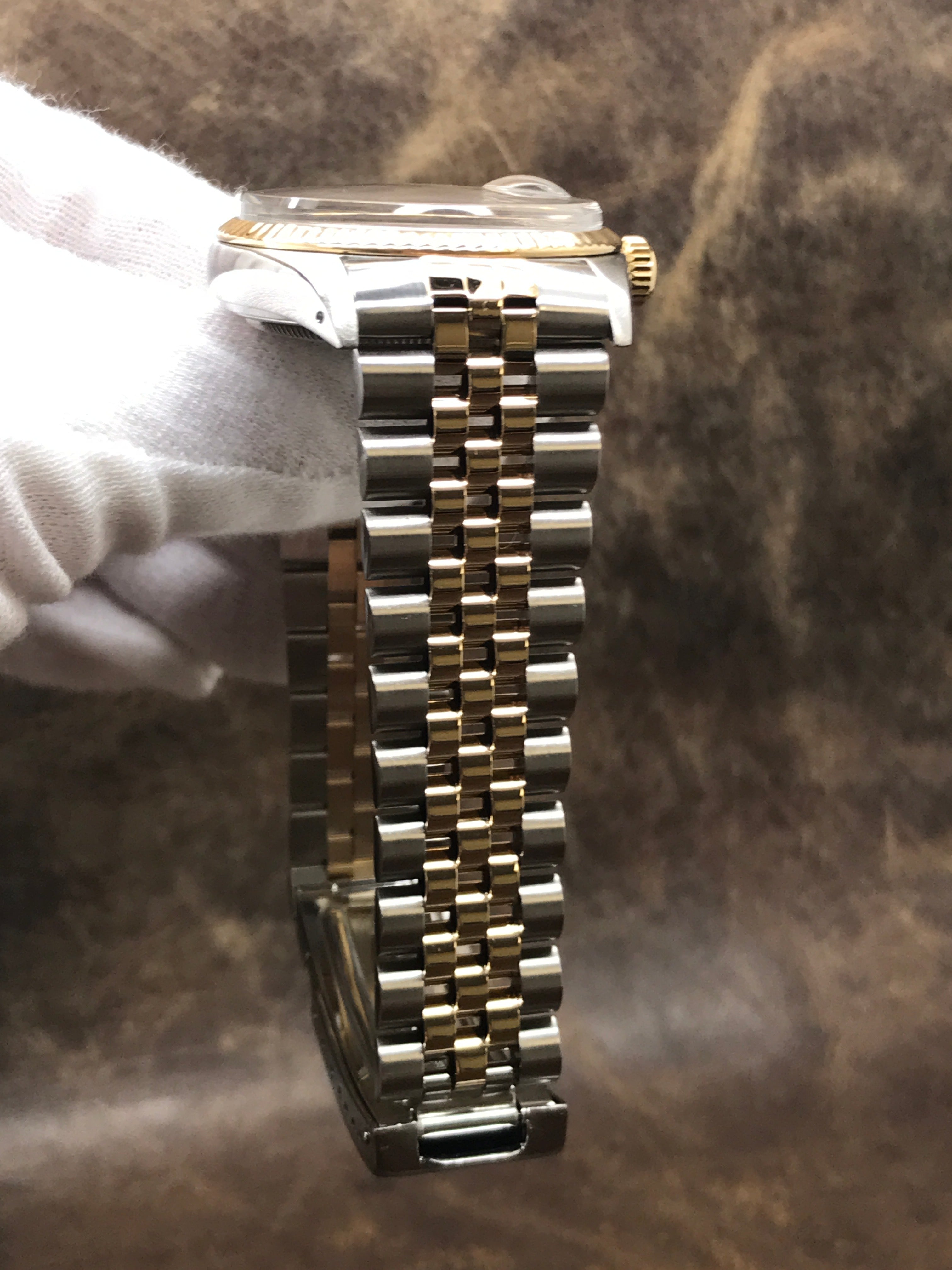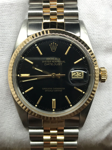 Stainless steel case with a stainless steel & 18k yellow gold custom repaired links with oem buckle & end pieces. Fixed fluted 18k yellow gold bezel. Black dial with luminous gold-tone hands and index hour markers. Dial type: analog. Luminescent hands. Rolex calibre 3035 automatic movement with about 50 hours of power reserve. Acrylic crystal with cyclops magnifier crystal. Screw down crown. Solid case back. Case size: 36 mm. Case thickness: 12 mm. Round case shape. Band width: mm. Fold over w/ safety release clasp. Water resistant at 100 meters / 330 feet. Functions: date, hour, minute, second, chronometer. Rolex Datejust 36mm 16013 Black Dial Automatic Watch.