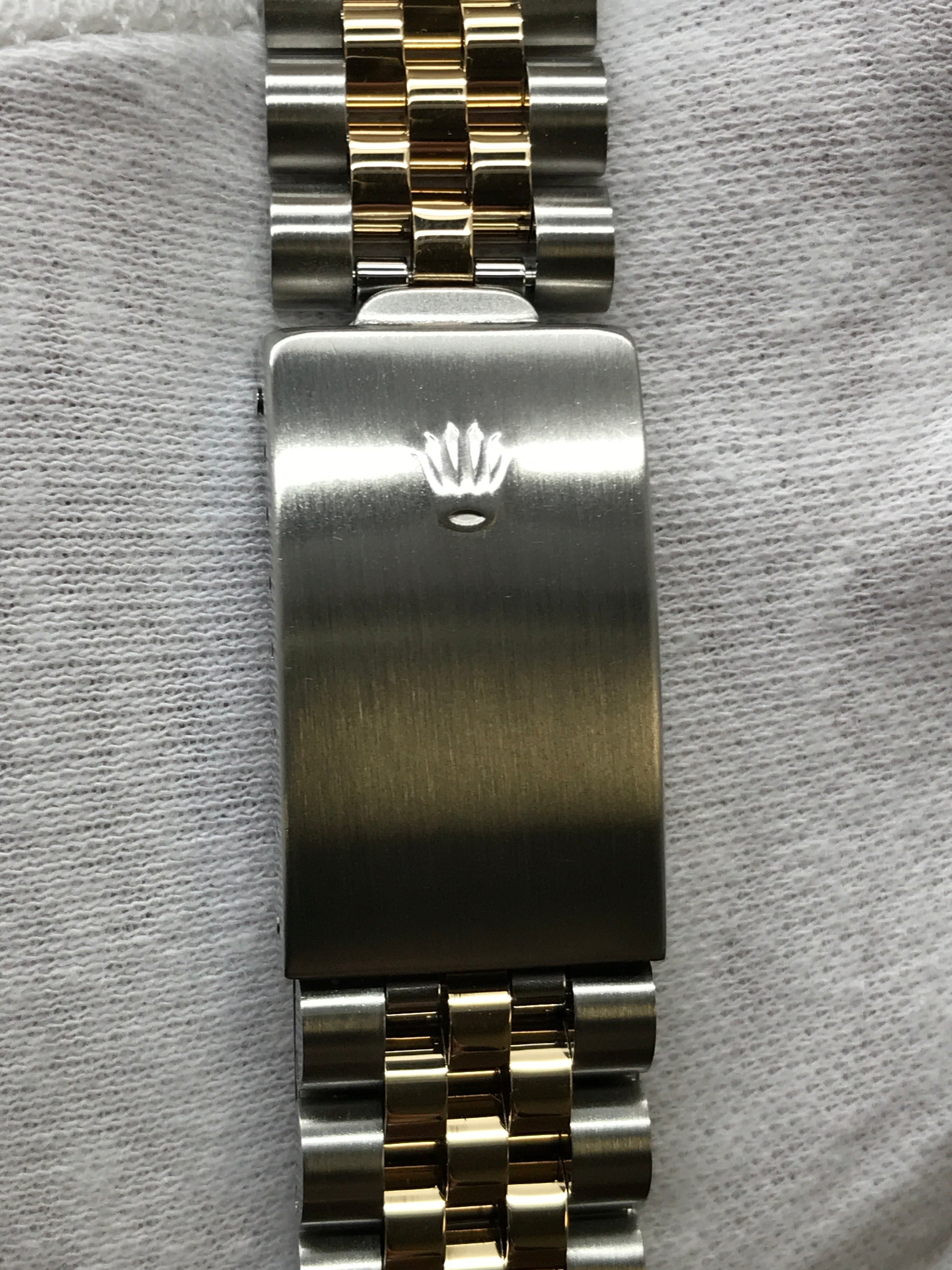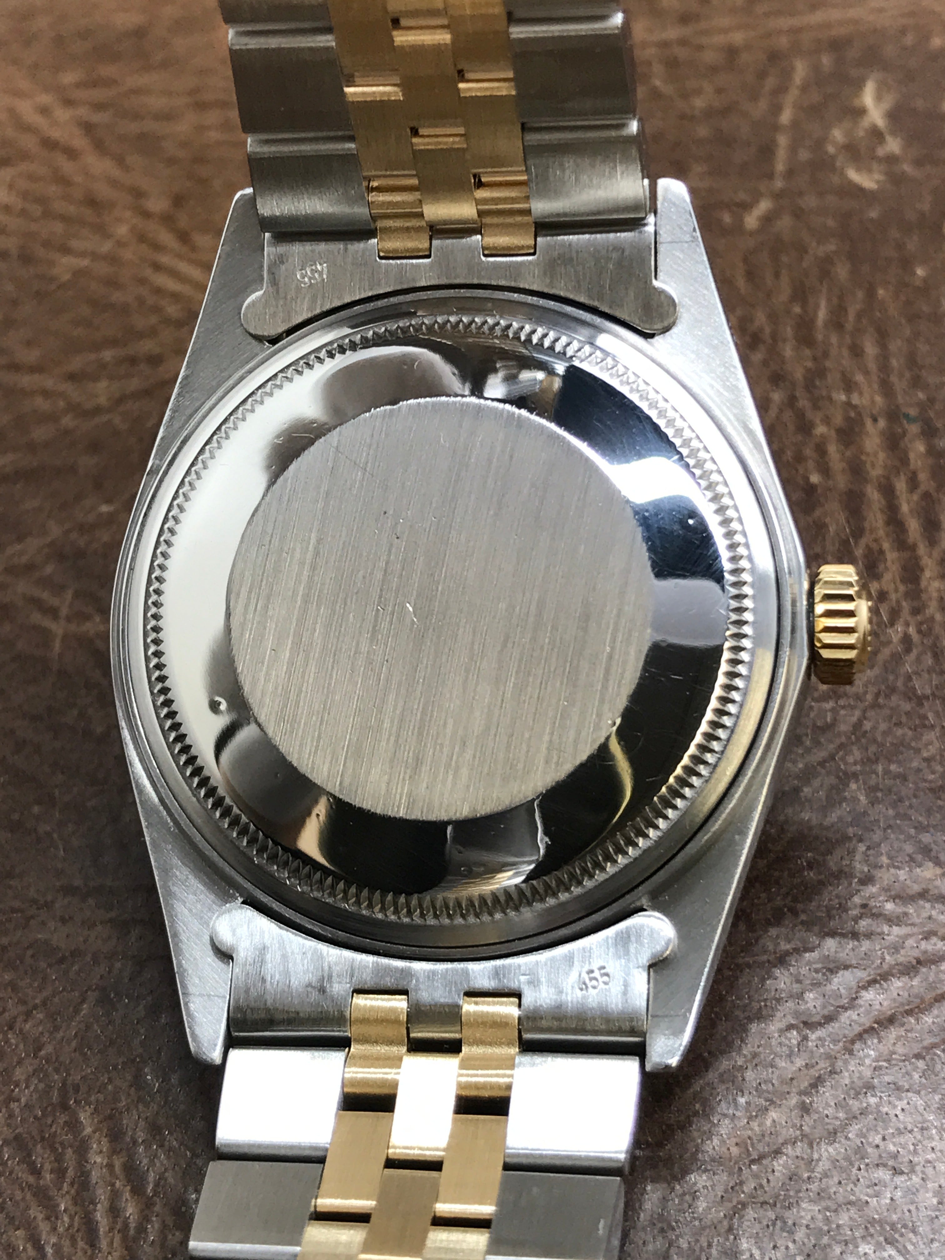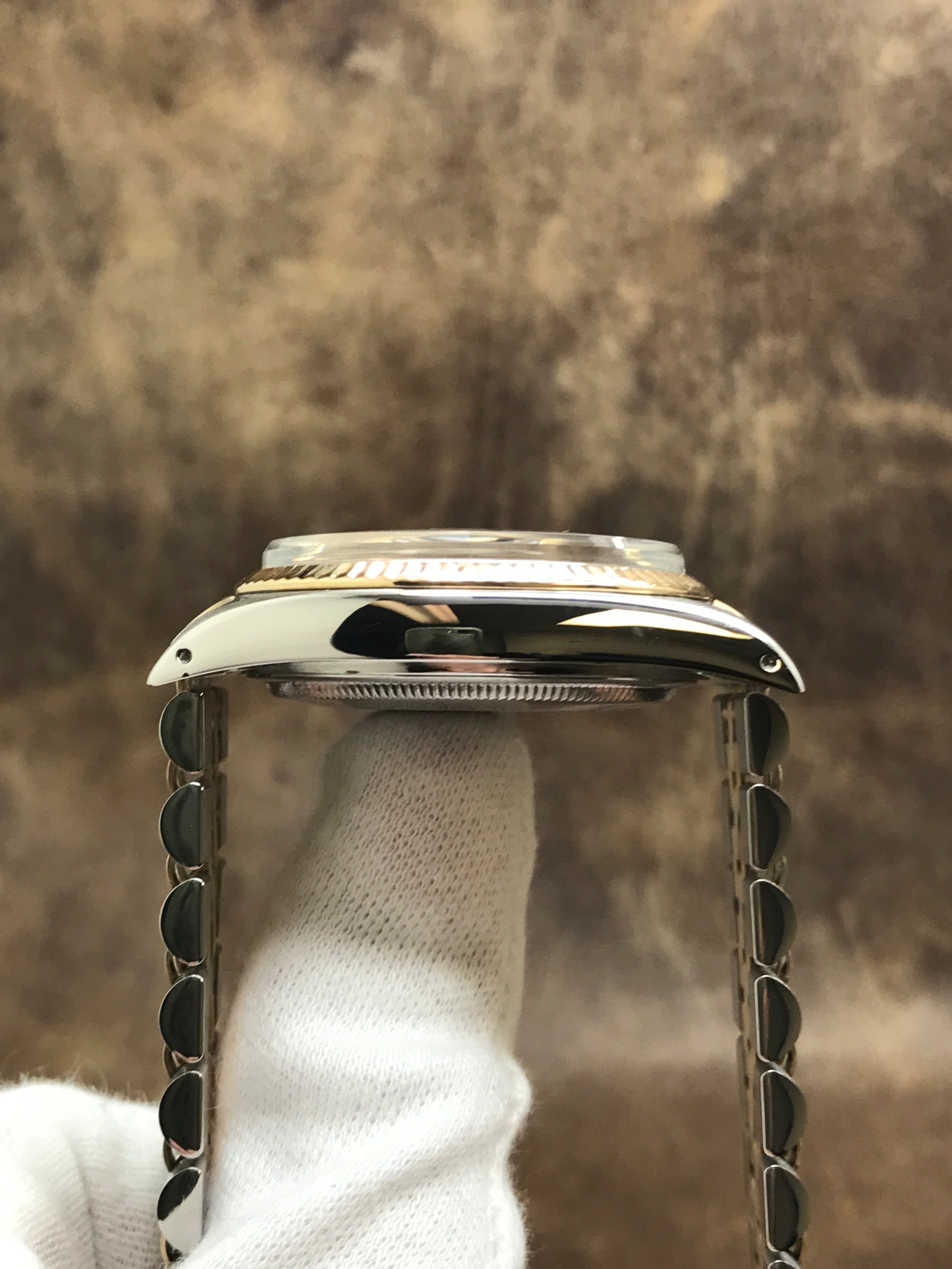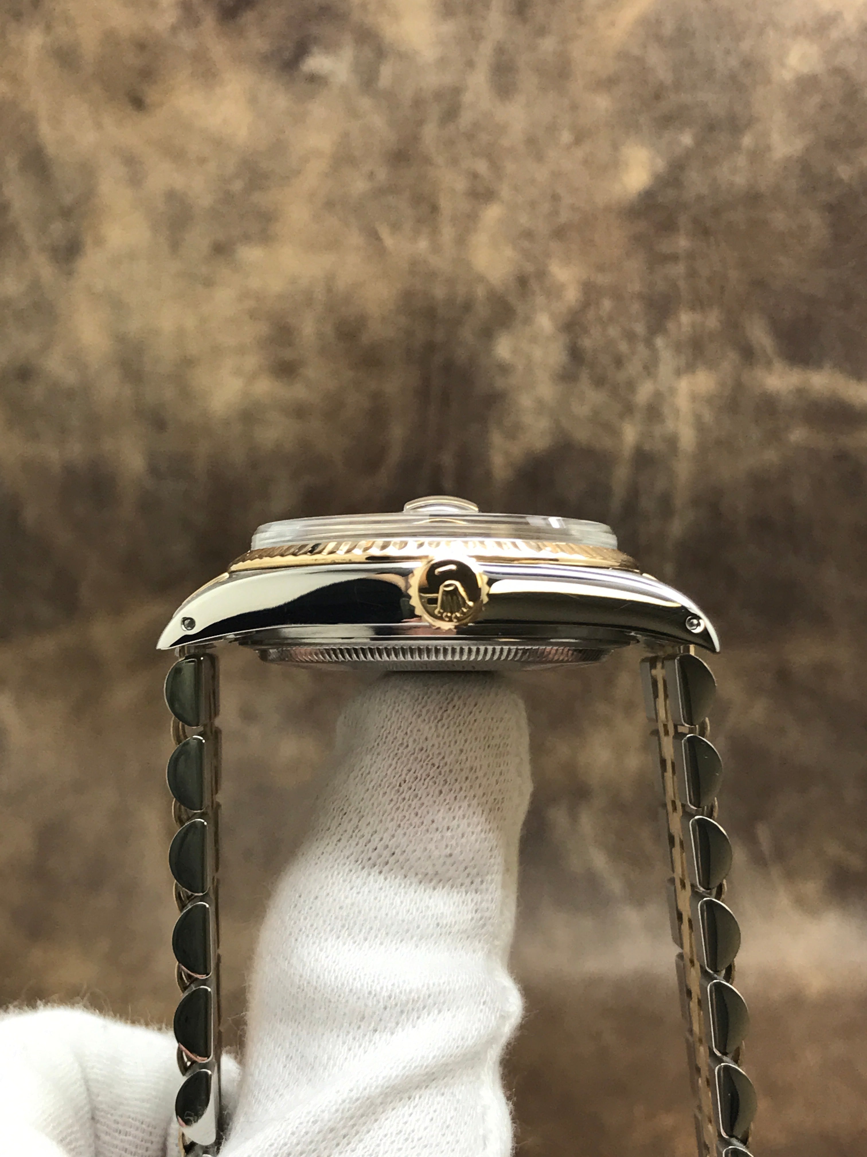 Stainless steel case with a stainless steel & 18k yellow gold custom repaired links with oem buckle & end pieces. Fixed fluted 18k yellow gold bezel. Black dial with luminous gold-tone hands and index hour markers. Dial type: analog. Luminescent hands. Rolex calibre 3035 automatic movement with about 50 hours of power reserve. Acrylic crystal with cyclops magnifier crystal. Screw down crown. Solid case back. Case size: 36 mm. Case thickness: 12 mm. Round case shape. Band width: mm. Fold over w/ safety release clasp. Water resistant at 100 meters / 330 feet. Functions: date, hour, minute, second, chronometer. Rolex Datejust 36mm 16013 Black Dial Automatic Watch.