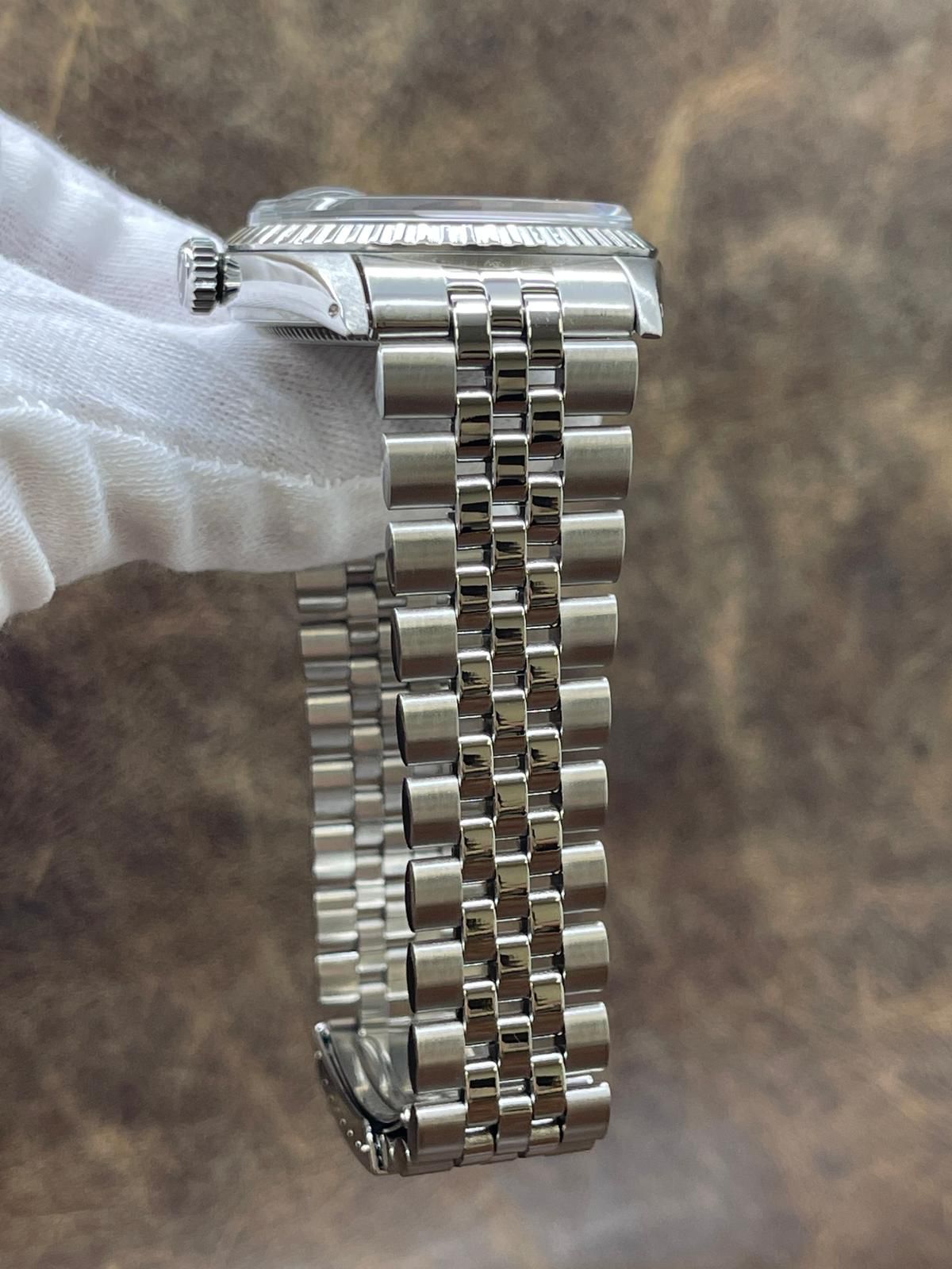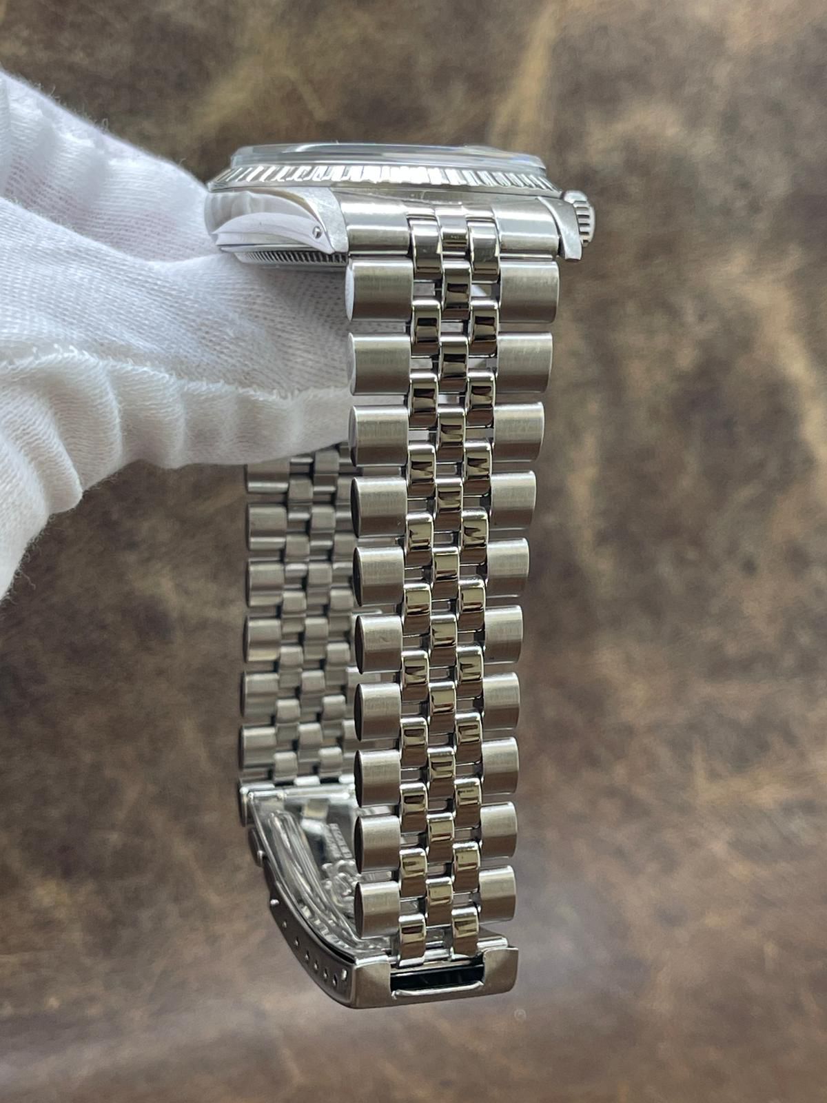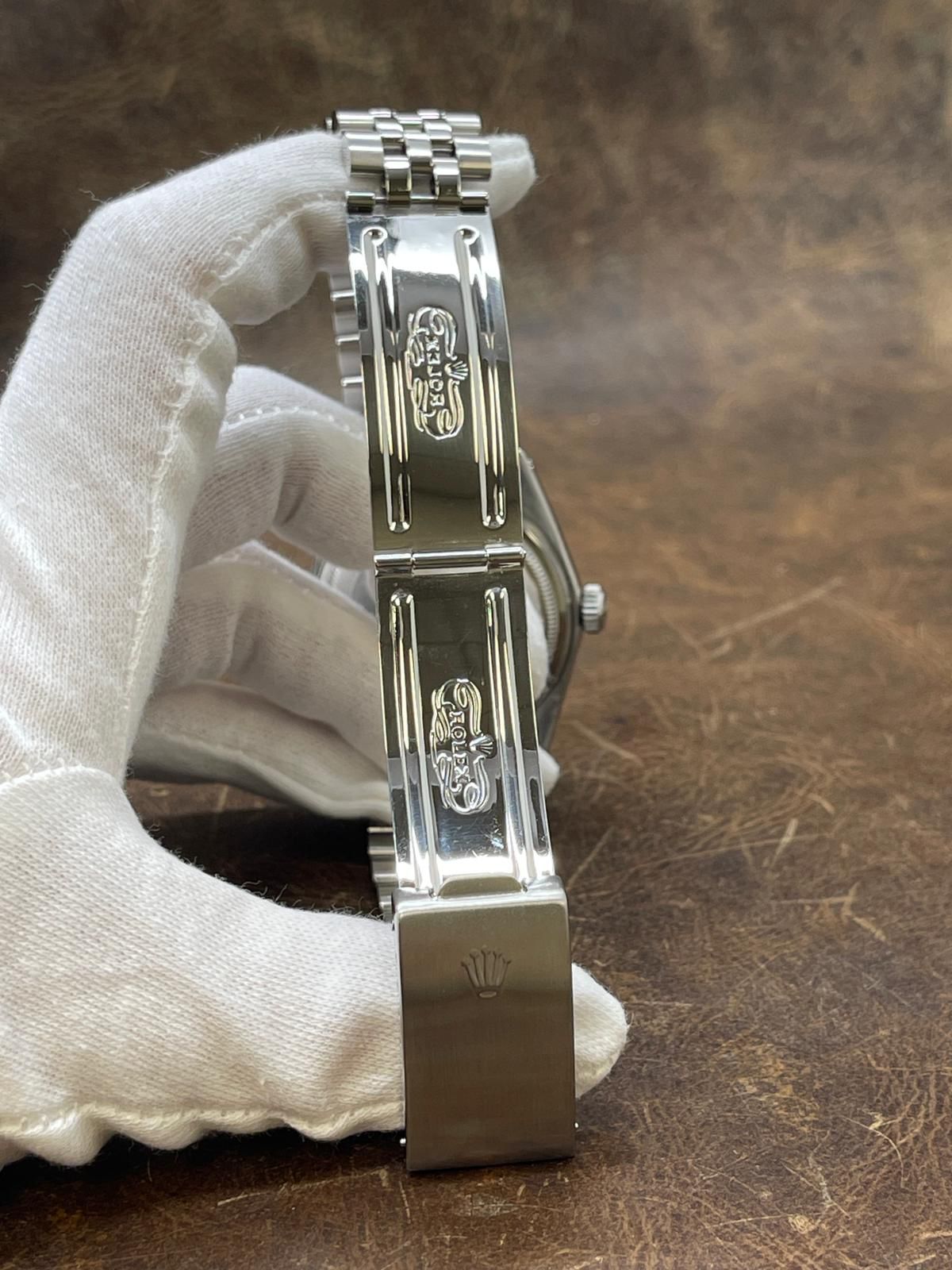 This pre-owned Rolex Datejust 36mm Custom Links 1603 is in excellent condition and comes with: NO box or papers. The bracelet was professionally repaired using custom links while keeping the original end-links and buckle. Max wrist size: 7.75 in.