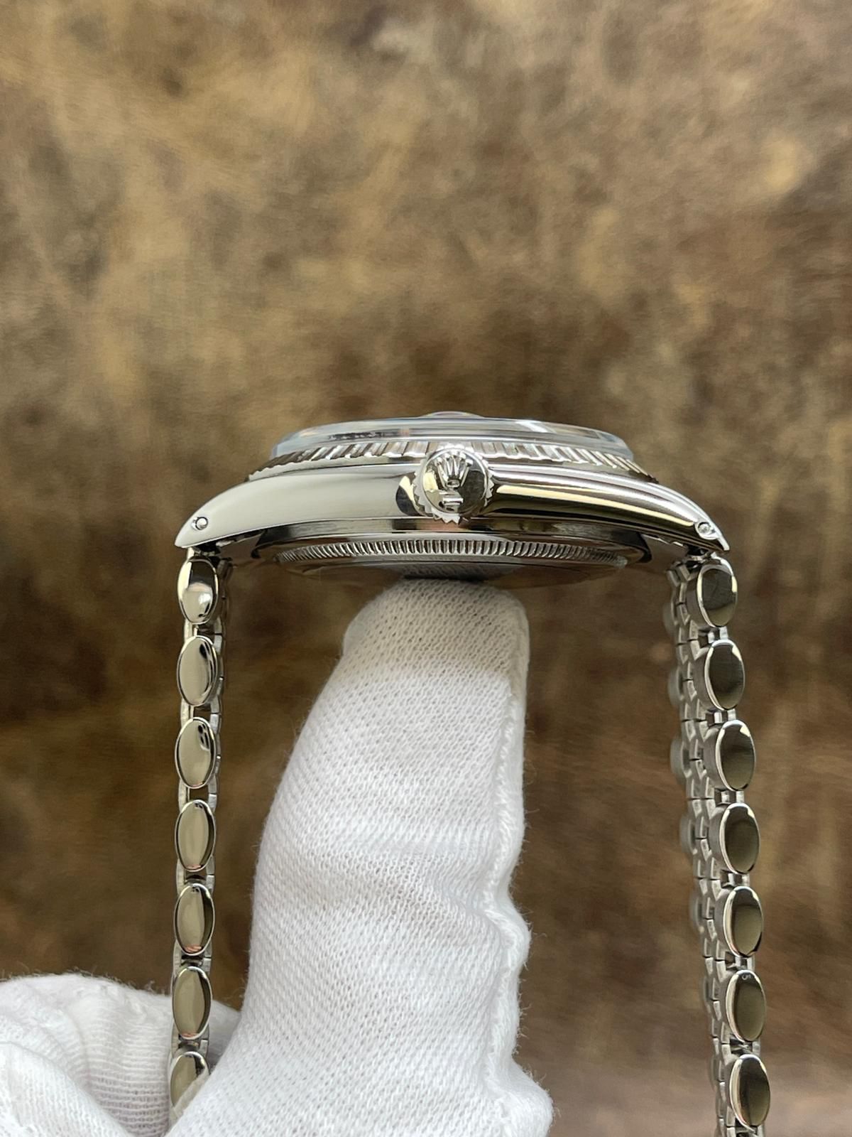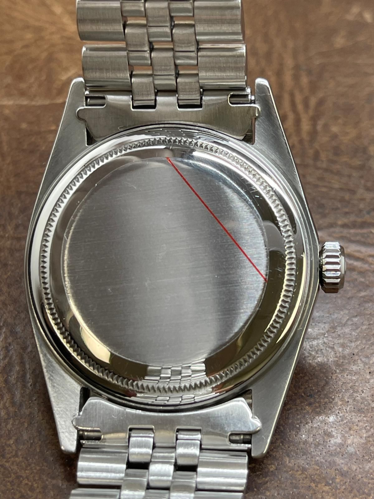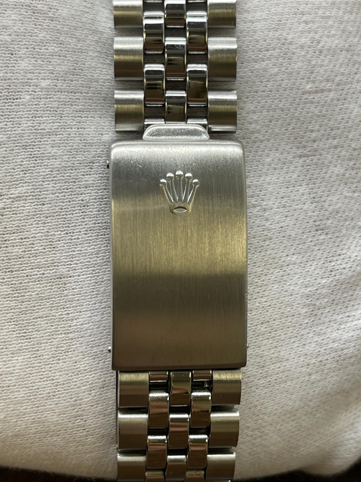 This pre-owned Rolex Datejust 36mm Custom Links 1603 is in excellent condition and comes with: NO box or papers. The bracelet was professionally repaired using custom links while keeping the original end-links and buckle. Max wrist size: 7.75 in.