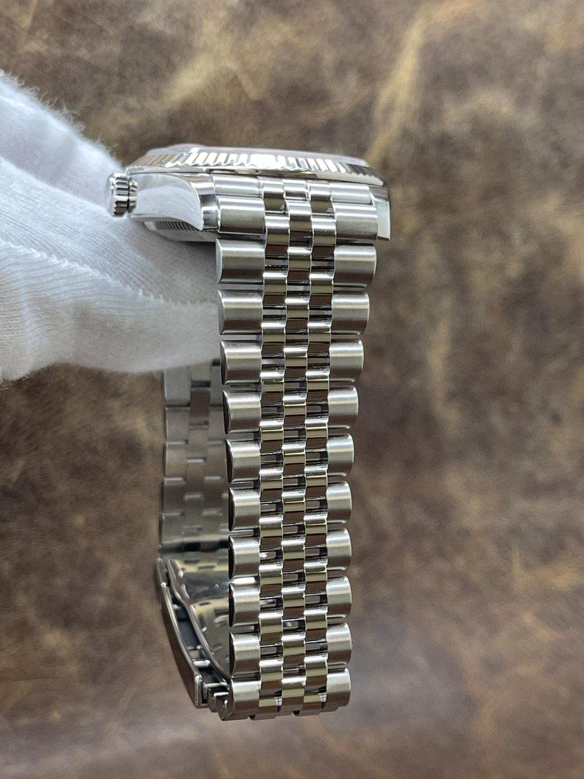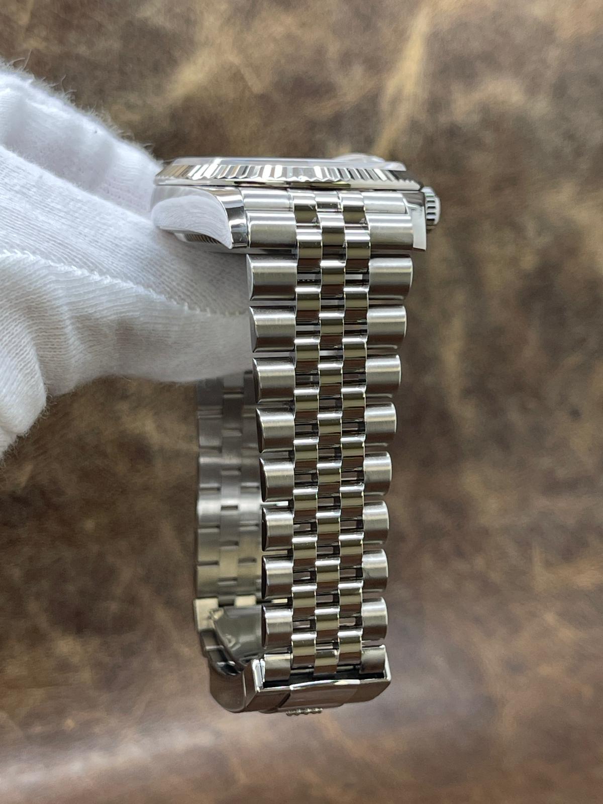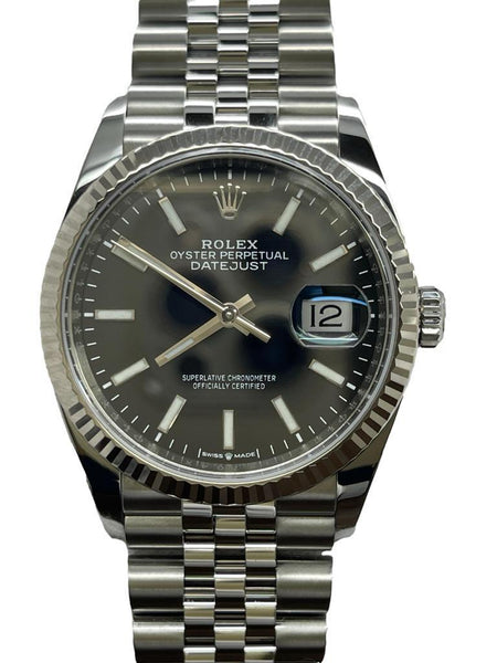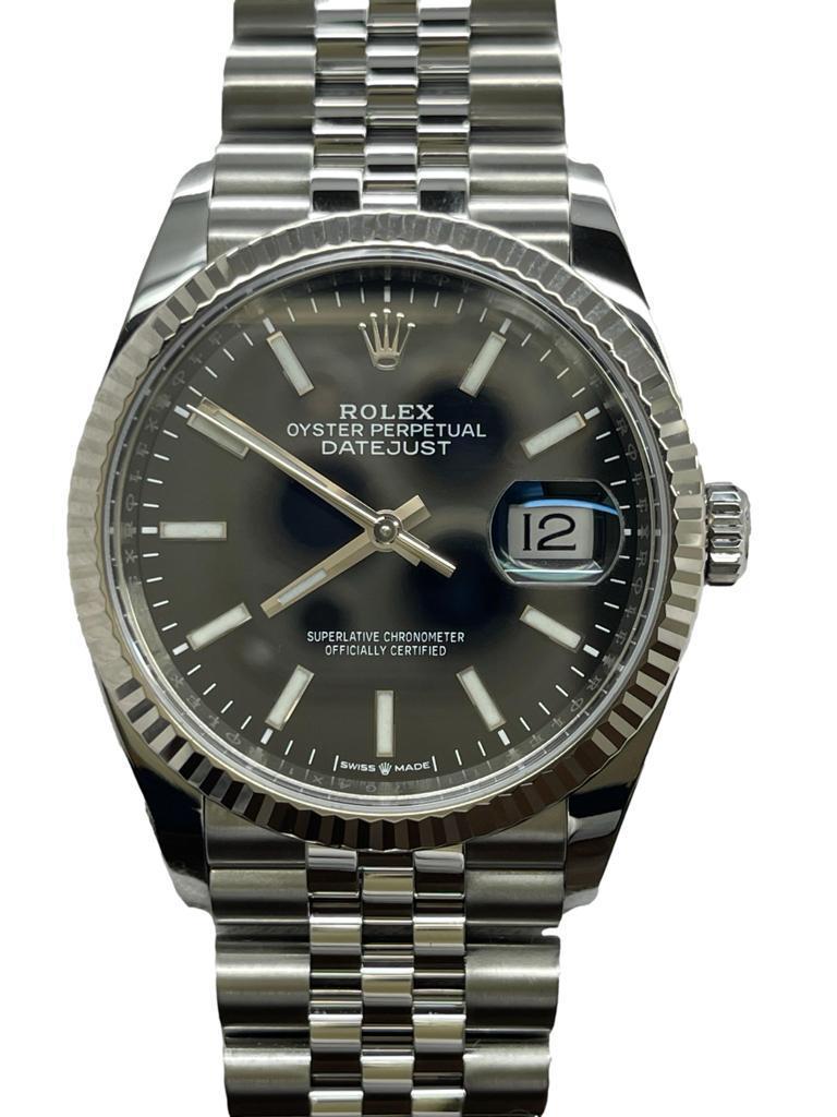Stainless steel case with a stainless steel jubilee bracelet. Fixed fluted 18k white gold bezel. Black dial with silver tone luminous hands and index hour markers. Dial type: analog. Rolex calibre 3235 automatic movement with about 70 hours of power reserve. Sapphire crystal. Screw down crown. Solid case back. Case size: 36 mm. Case thickness: mm. Round case shape. Band width: mm. Hidden deployment clasp. Water resistant at 100 meters / 330 feet. Functions: date, hour, minute, second. Rolex Datejust 36mm 126234 Black Dial Automatic Watch.