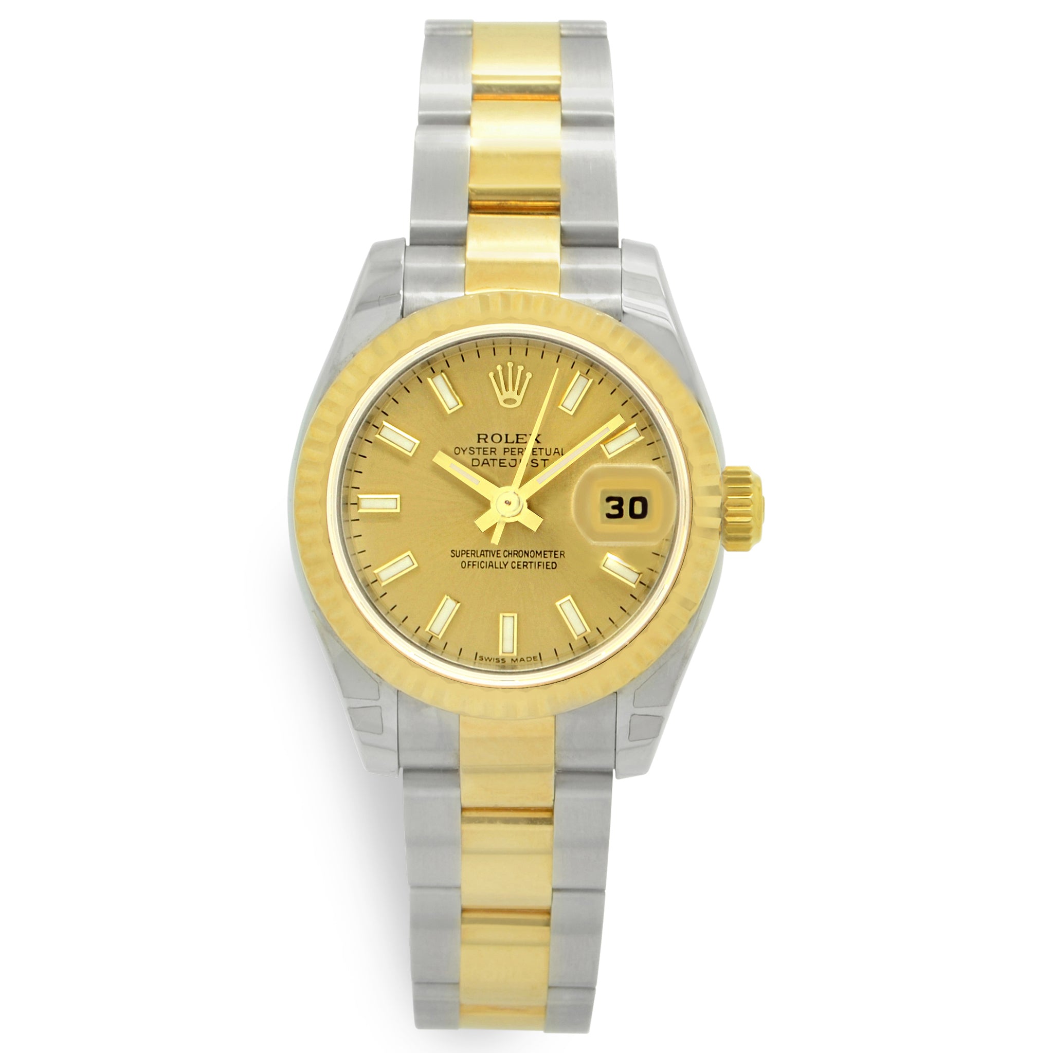 Stainless steel and 18kt yellow gold case with a stainless steel and 18kt yellow gold Rolex oyster bracelet. Fluted 18kt yellow gold bezel. Champagne dial with yellow gold-tone hands and index hour markers. Dial type: analog. Rolex calibre 2235 automatic movement with about 48 hours of power reserve. Sapphire crystal. Screw down crown. Solid case back. Case size: 26 mm. Case thickness: 10 mm. Round case shape. Band width: mm. Oysterclasp clasp. Water resistant at 100 meters / 330 feet. Functions: date, hour, minute, second. Rolex Datejust 179173 Champagne Dial Automatic Women's Watch.