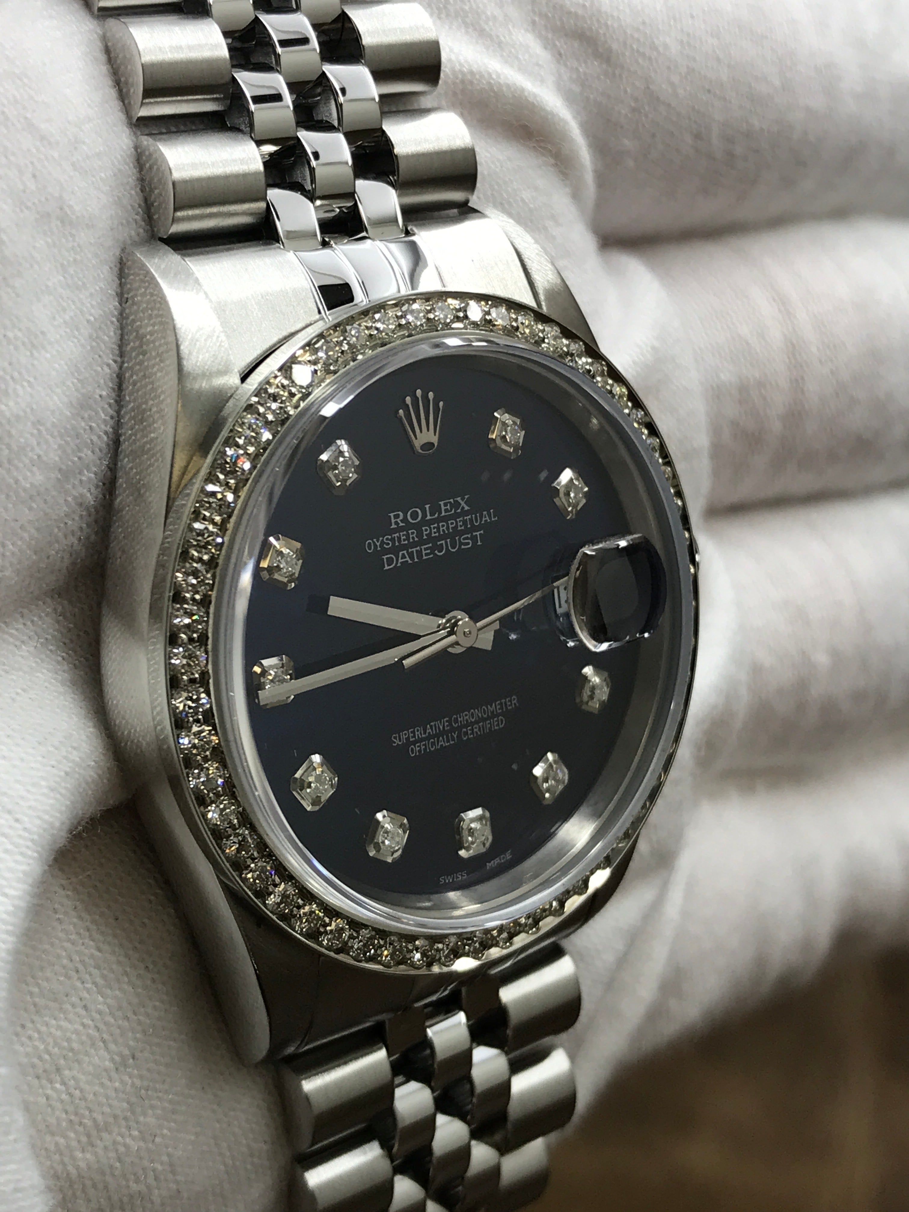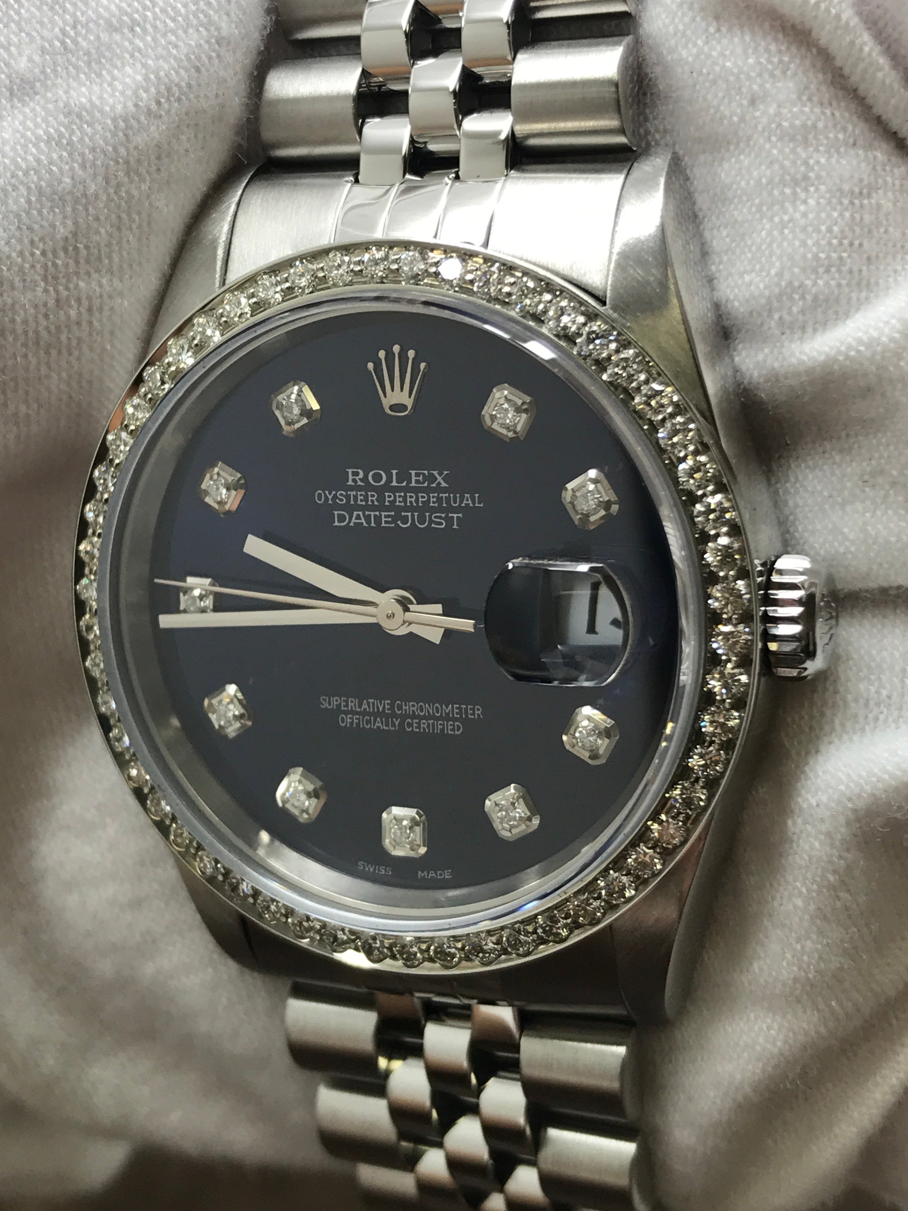 Stainless steel case with a stainless steel jubilee bracelet. Fixed fluted stainless steel with custom added diamonds bezel. Blue custom diamond dial with silver-tone hands and custom added diamonds hour markers. Dial type: analogue. Rolex cal. 3135 automatic movement with about 48 of power reserve. Scratch resistant sapphire crystal. Screw-down crown. Solid case back. Case size: 36 mm. Case thickness: 12 mm. Round case shape. Band width: mm. Fold over clasp. Water resistant at 100m/330ft. Functions: hours, minutes, seconds, date. Rolex Datejust Turn-o-graph 16264 Blue Custom Diamond Dial Automatic Men's Watch.