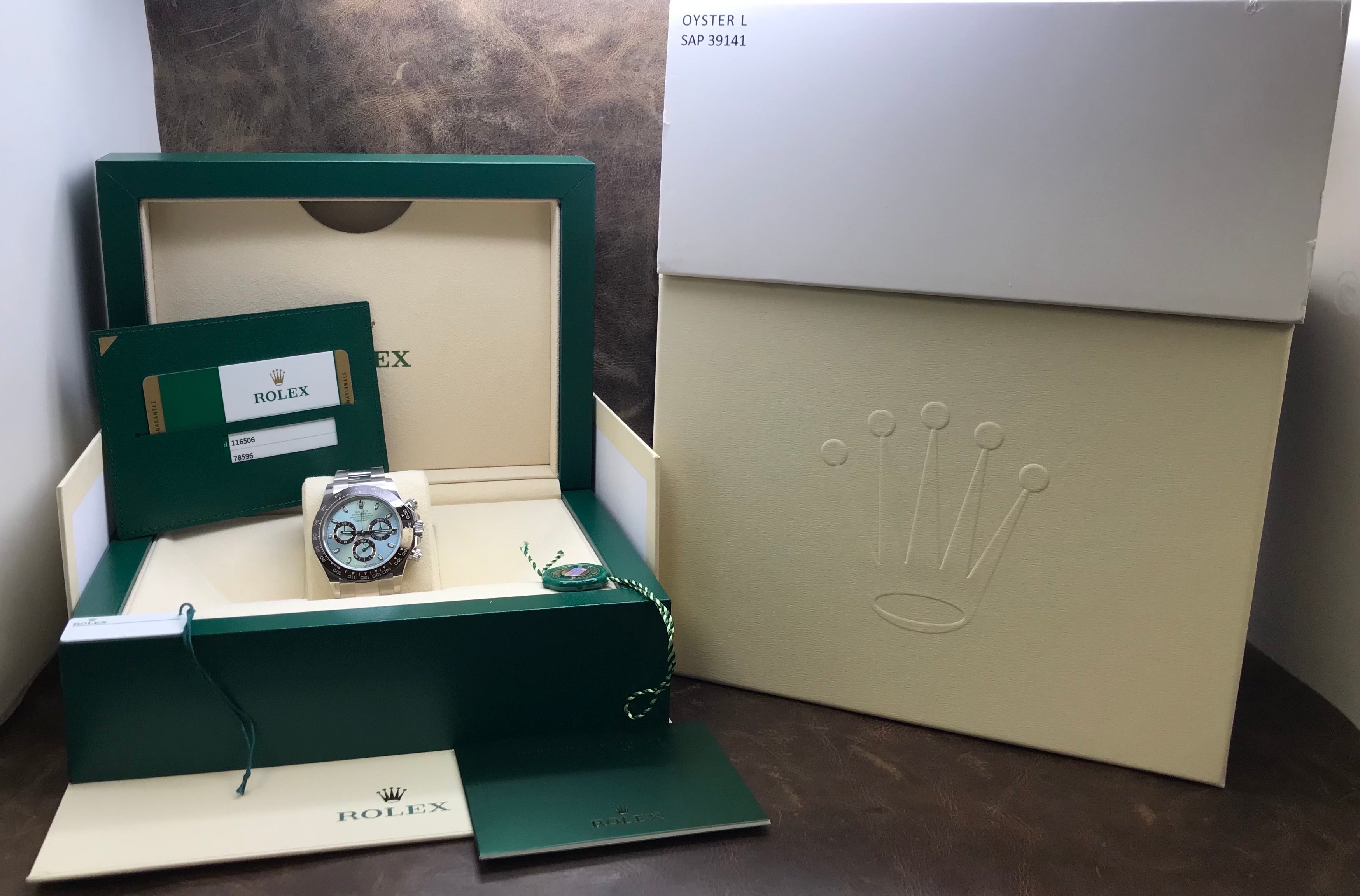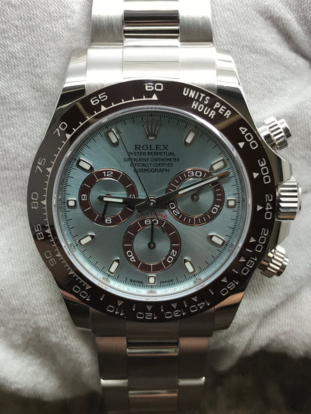 Platinum case with a platinum Rolex oyster oyster bracelet. Fixed tachymeter scale ceramic bezel. Blue dial with luminous silver-tone hands and index hour markers. Dial type: analog. Luminescent hands and markers. Rolex calibre 4130 automatic movement with about 72 hours of power reserve. Scratch resistant sapphire crystal. Screw down crown. Solid case back. Case size: 40 mm. Case thickness: mm. Round case shape. Band width: mm. Oysterlock clasp. Water resistant at 100 meters / 330 feet. Functions: chronograph, hour, minute, second, chronometer. Rolex Daytona Platona 116506 Blue Dial Automatic Men's Watch.