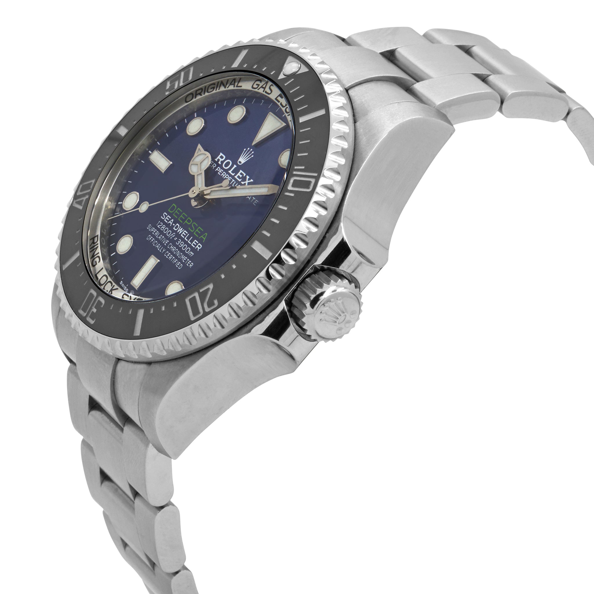Stainless steel case with a stainless steel Rolex oyster bracelet. Unidirectional rotating stainless steel bezel. Deep blue dial with luminous silver-tone mercedes-logo, sword, and breguet-style shape hands and dot hour markers. Dial type: analog. Luminescent hands & hour markers. Rolex calibre 3235 automatic movement with about 70 hours of power reserve. Scratch resistant sapphire crystal. Screw down crown. Titanium case back. Case size: 44 mm. Case thickness: mm. Round case shape. Band width: mm. Oysterlock clasp. Water resistant at 3900 meters / 12800 feet. Functions: date, hour, minute, second. Rolex Deepsea James Cameron Deep Blue 126660 D-blue Deep Blue Dial Automatic Men's Watch.