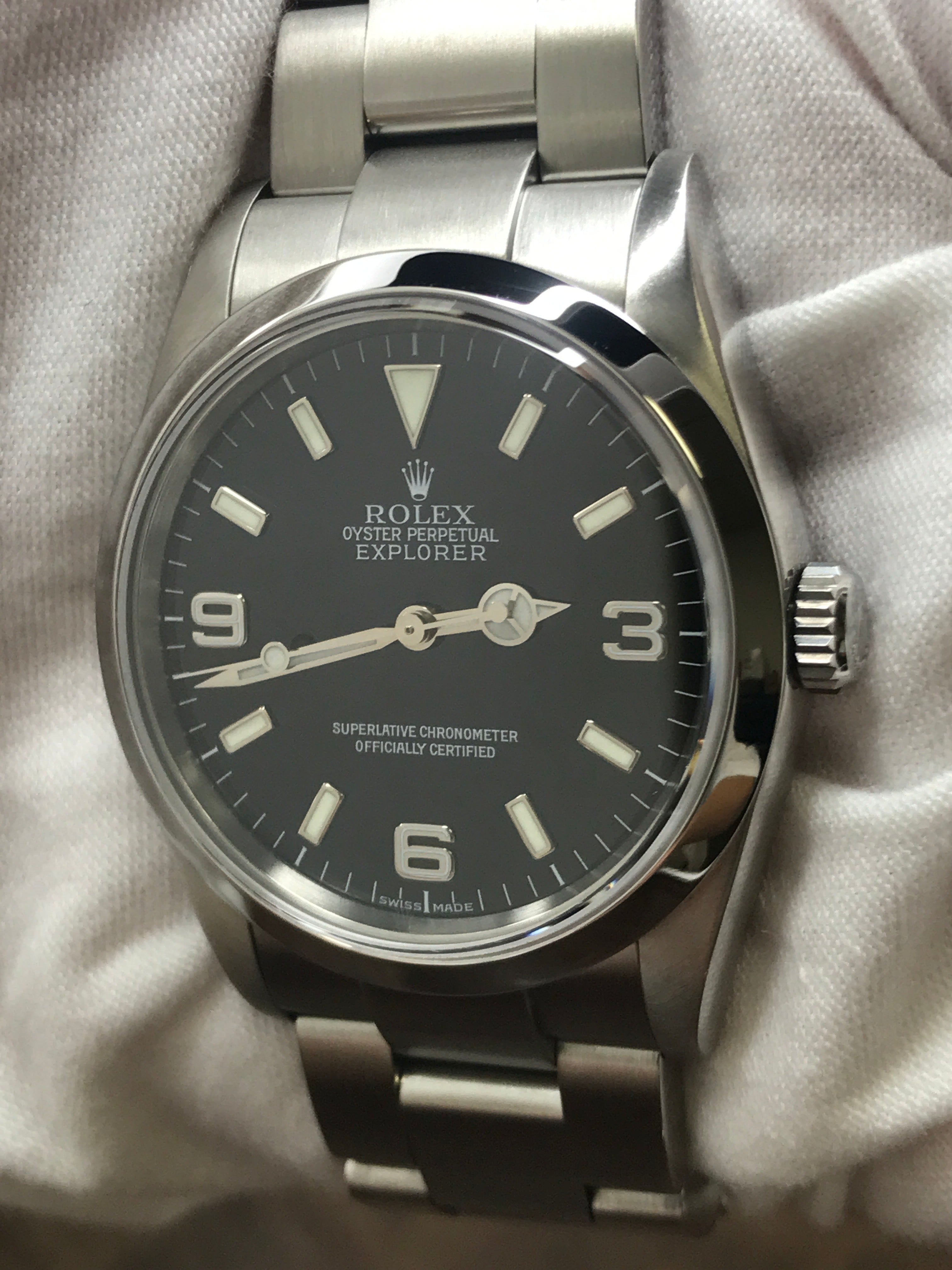 This pre-owned Rolex Explorer 36mm 114270 is in mint condition and comes with: original Rolex double box and matching warranty papers dated 2005. Max wrist size: 7 in.