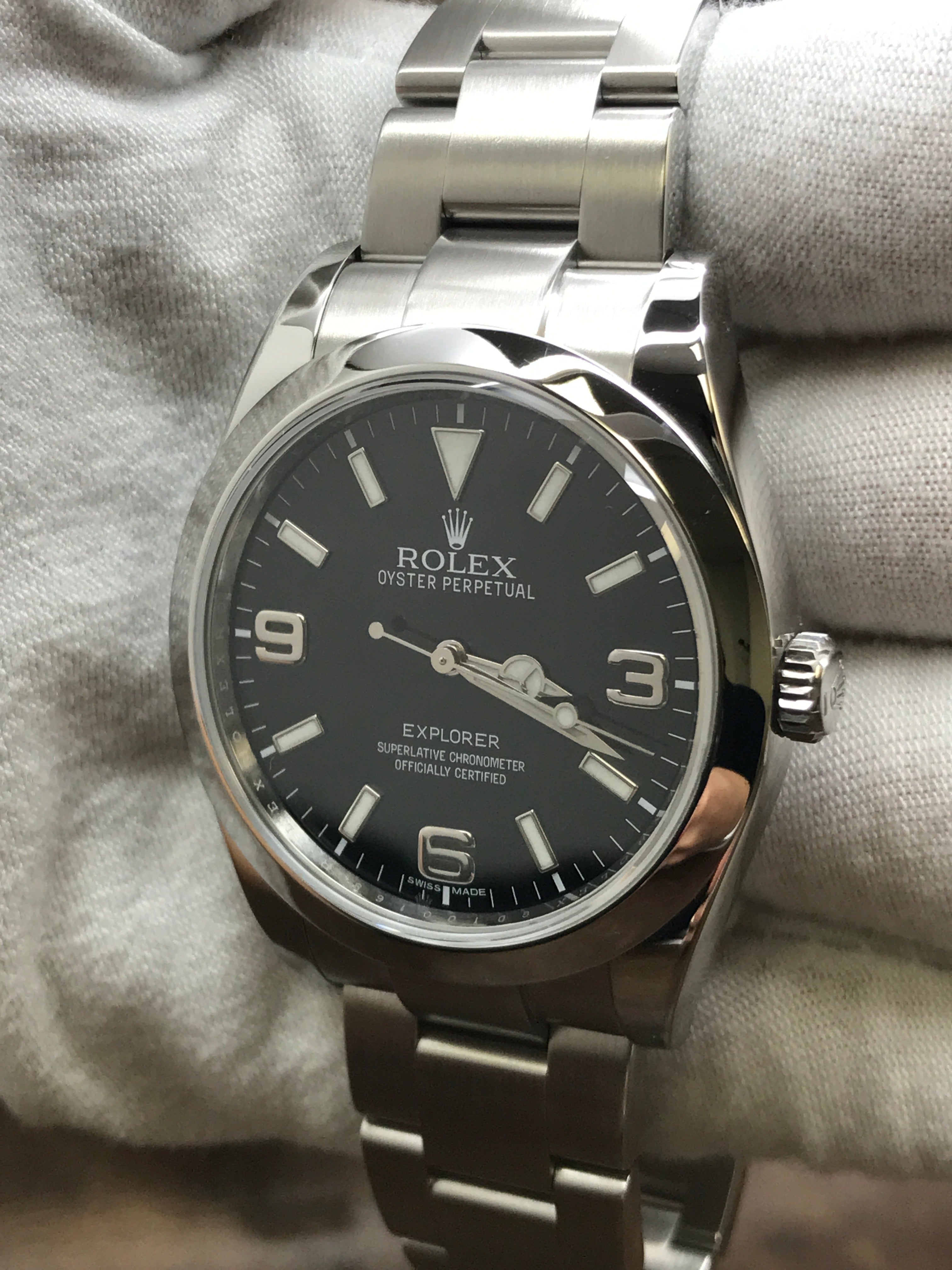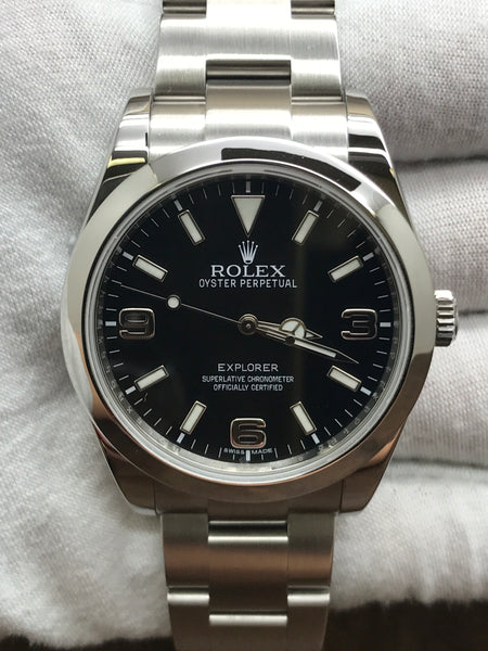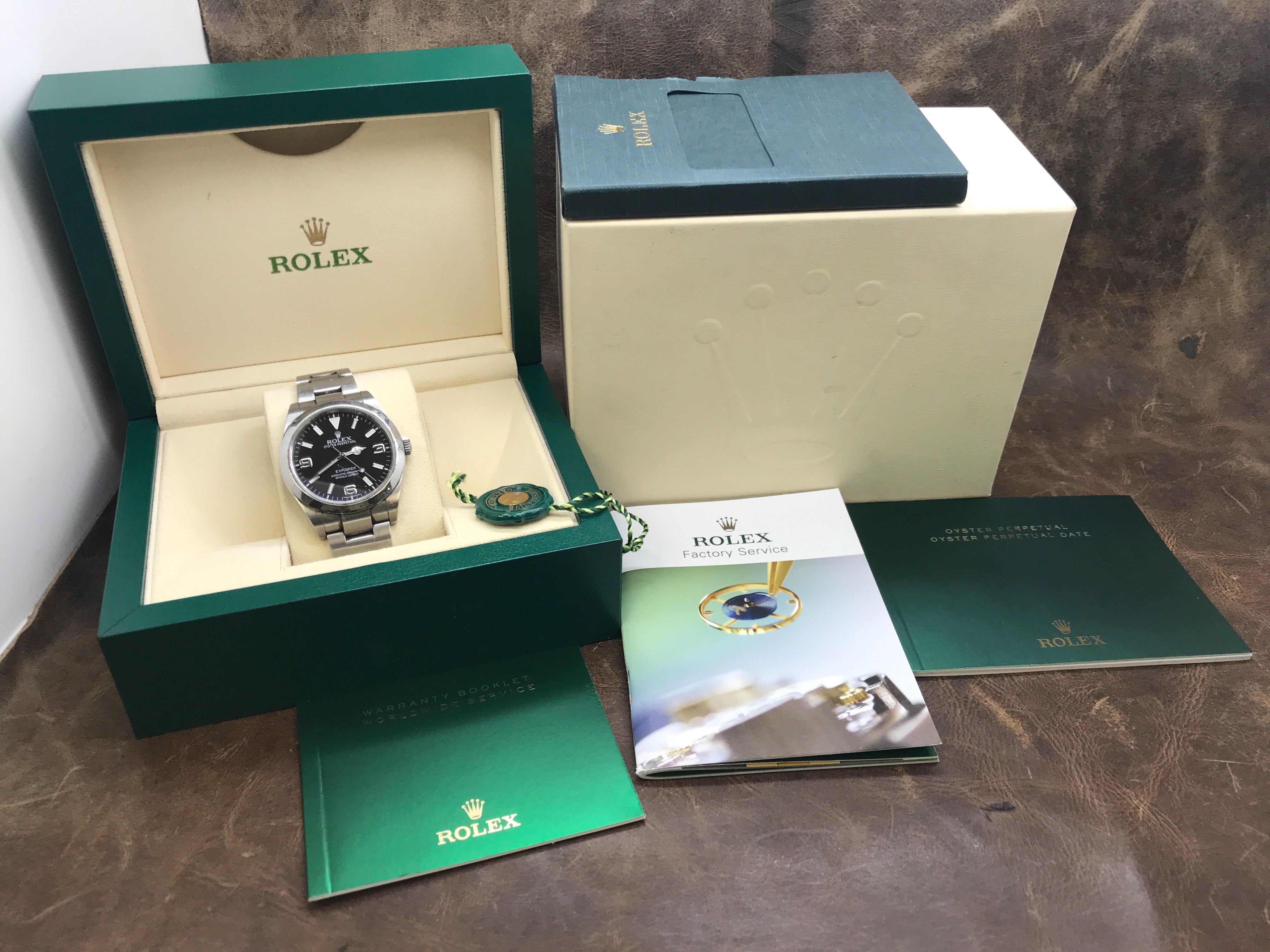 This pre-owned Rolex Explorer I 214270 NO Lume is in mint condition and comes with: original Rolex double box, green tag & booklets. Max wrist size: 7.75 in.