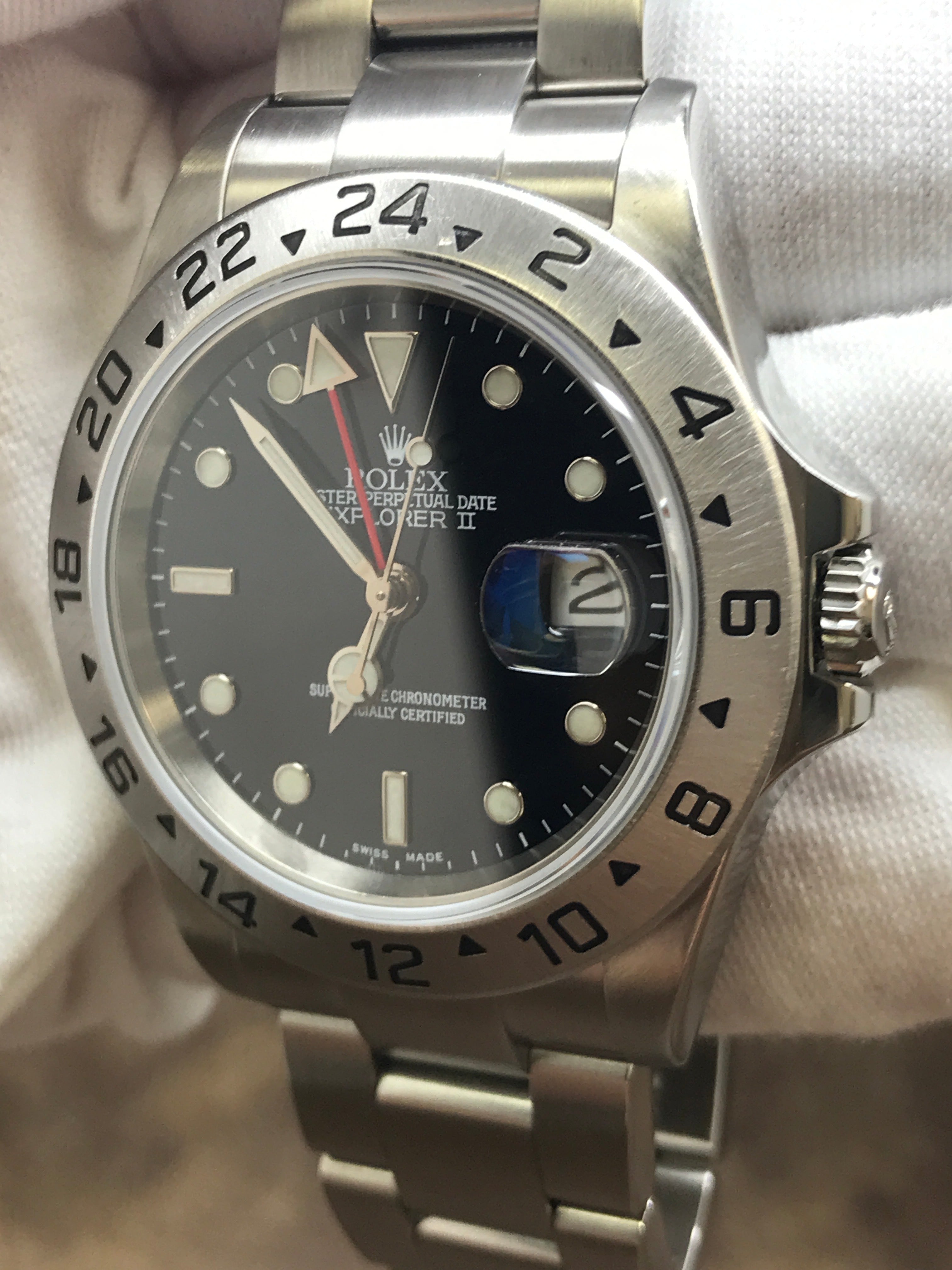 This pre-owned Rolex Explorer II F serial 16570 No Holes is in excellent condition and comes with: NO box or papers. Max wrist size: 7.5 in.