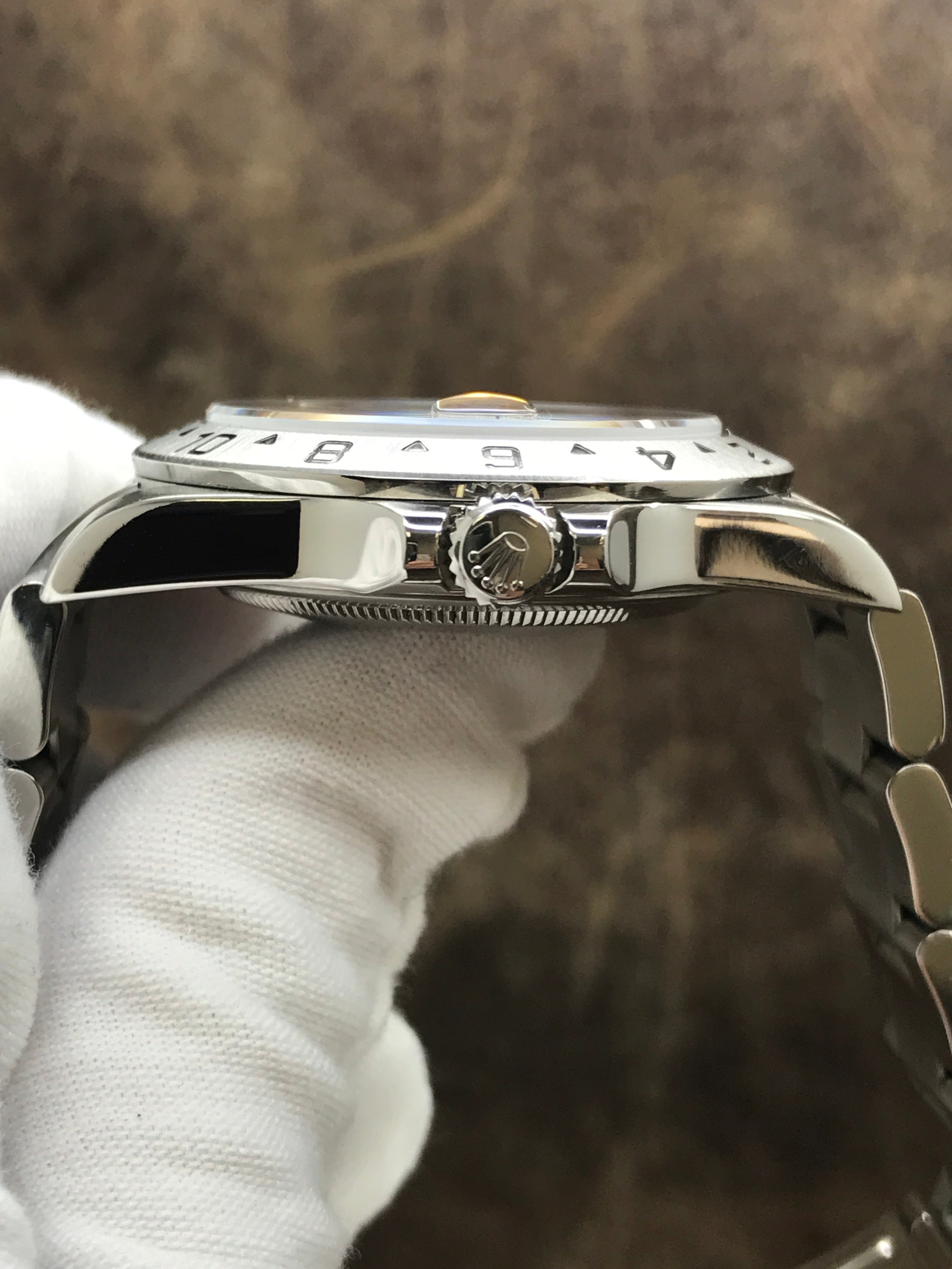 Stainless steel case with a stainless steel oyster bracelet. Fixed - 24 hour engraved stainless steel bezel. Black dial with silver tone luminous hands and luminous dots hour markers. Dial type: analog. Rolex calibre 3185 automatic movement with about 50 hours of power reserve. Scratch resistant sapphire crystal. Screw down crown. Solid case back. Case size: 40 mm. Case thickness: 12 mm. Round case shape. Band width: mm. Oysterlock clasp. Water resistant at 100 meters / 330 feet. Functions: gmt, second time zone, date, hour, minute, second, chronometer. Rolex Explorer II F serial 16570 No Holes Black Dial Automatic Men's Watch.