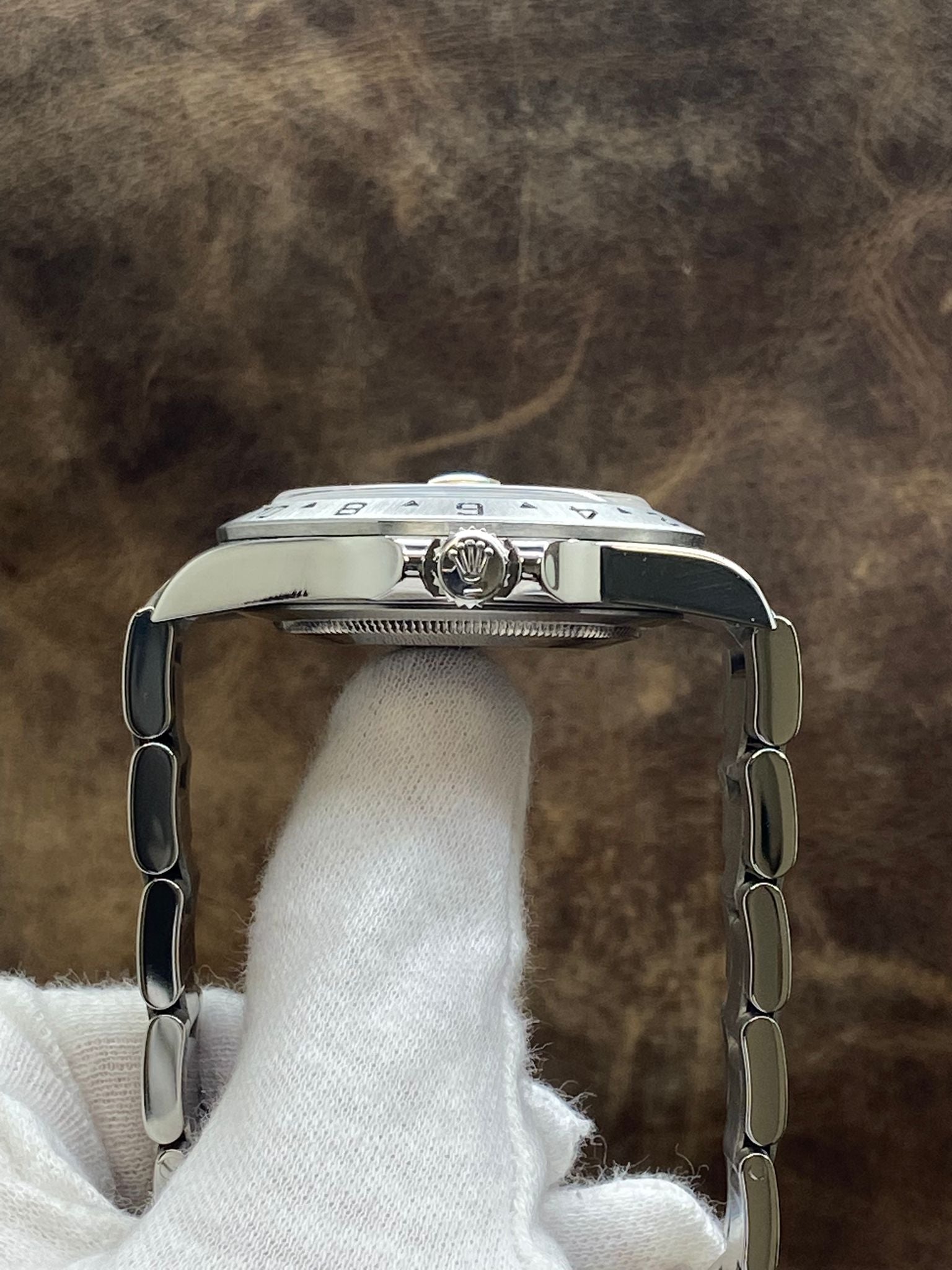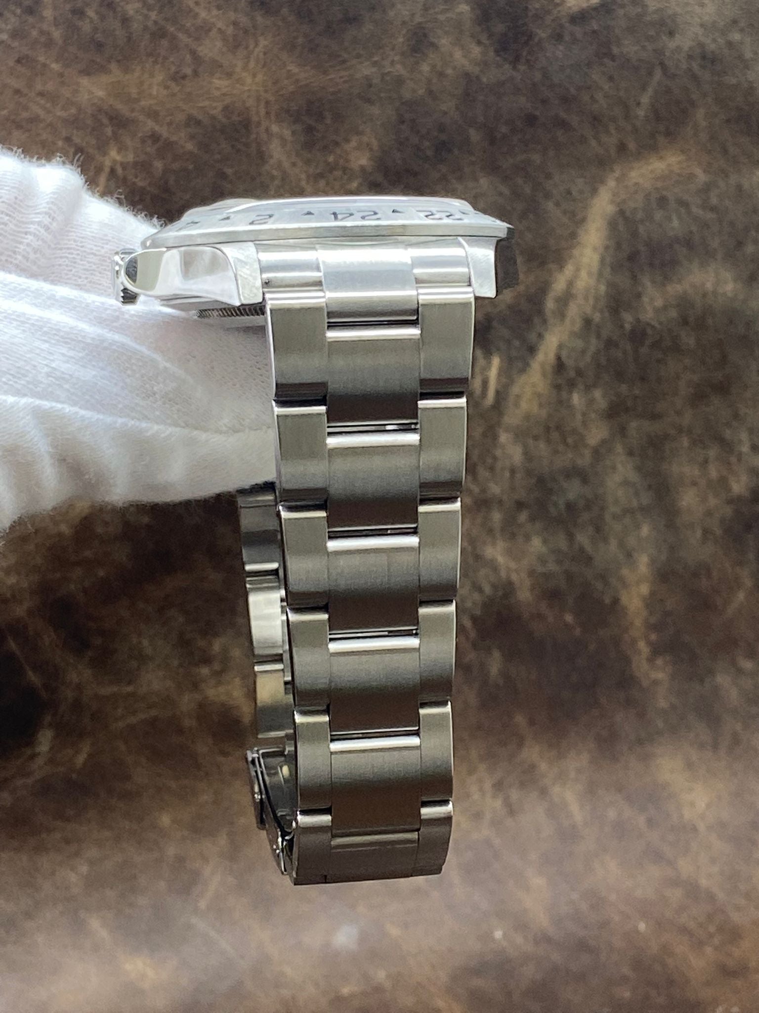 Stainless steel case with a stainless steel oyster bracelet. Fixed stainless steel bezel. Black dial with luminous mercedes-logo, sword, and breguet-style shape hands and luminous dot & index hour markers. Dial type: analog. Luminescent hands and dial markers. Rolex calibre 3185 automatic movement with about 48 hours of power reserve. Scratch resistant sapphire crystal. Screw down crown. Solid case back. Case size: 40 mm. Case thickness: 12.2 mm. Round case shape. Band width: mm. Fold over with safety release clasp. Water resistant at 100 meters / 330 feet. Functions: gmt, date, hour, minute, second, chronometer. Rolex Explorer II Caliber 3186 16570 Black Dial Automatic Men's Watch.