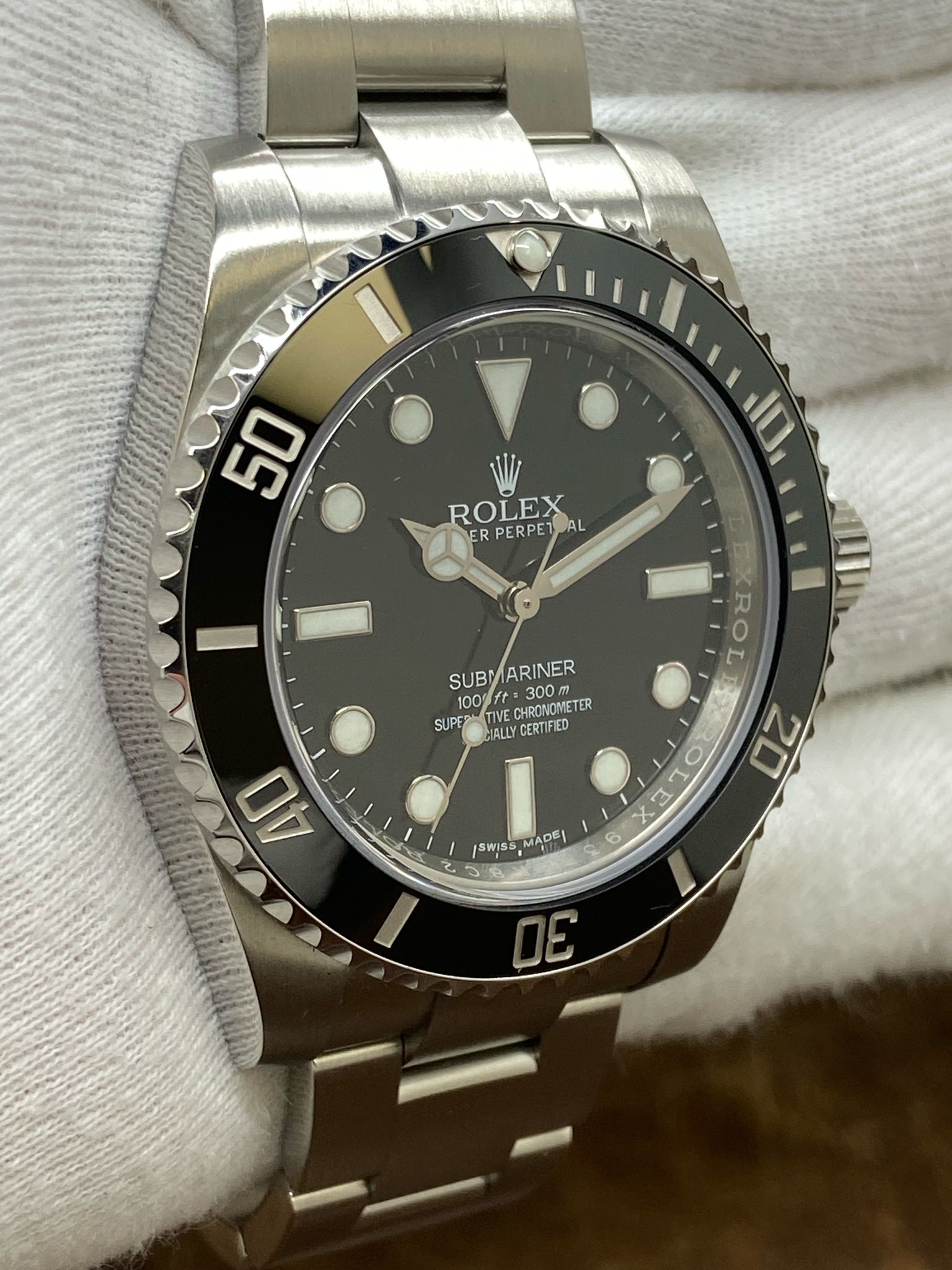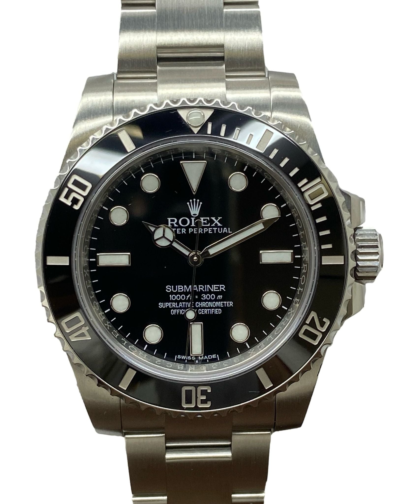 This pre-owned Rolex No Date Submariner 40mm Ceramic Bezel B&P 114060 is in mint condition and comes with: original Rolex full set with double box, booklets, tags and matching warranty card dated 2016. Max wrist size: 7.5 in.