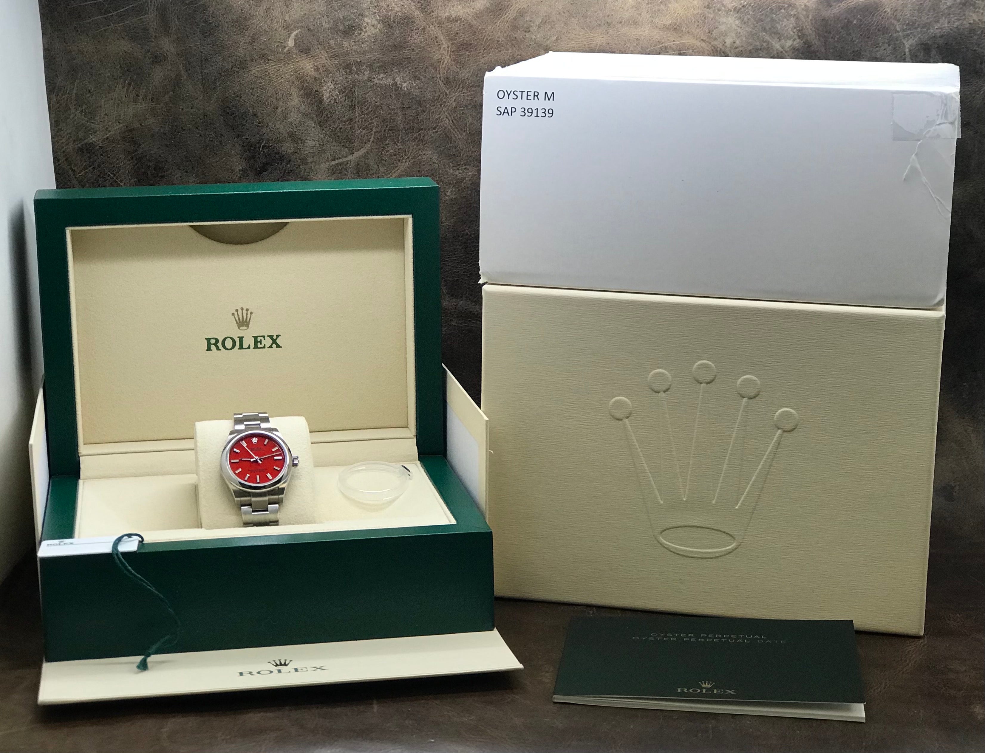 Stainless steel case with a stainless steel oyster bracelet. Fixed stainless steel bezel. Coral red dial with luminous silver-tone hands and index hour markers. Dial type: analog. Rolex calibre 2232 automatic movement with about 55 of power reserve. Scratch resistant sapphire crystal. Screw down crown. Solid case back. Case size: 31 mm. Case thickness: 10.7 mm. Round case shape. Band width: mm. Oysterlock clasp. Water resistant at 100 meters / 330 feet. Functions: hour, minute, second, chronometer. Rolex Oyster Perpetual 31mm 277200 Coral Red Dial Automatic Women's Watch.