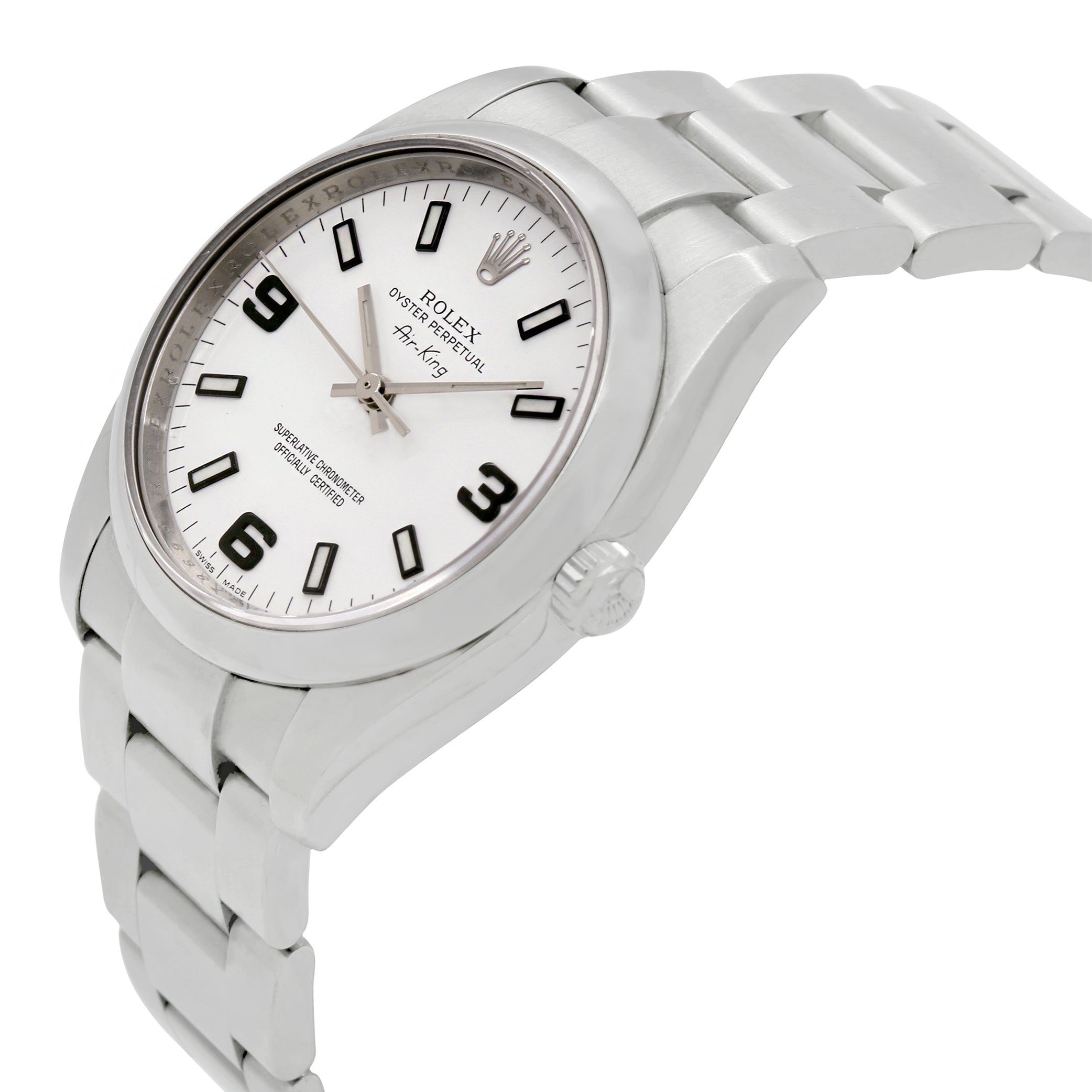 Stainless steel case with a stainless steel Rolex oyster bracelet. Fixed domed stainless steel bezel. White dial with luminous silver-tone hands and index with 3/6/9 Arabic hour markers. Dial type: analog. Luminescent hands and markers. Rolex calibre 3130 automatic movement with about 48 hours of power reserve. Scratch resistant sapphire crystal. Screw down crown. Solid case back. Case size: 34 mm. Case thickness: 11.5 mm. Round case shape. Band width: mm. Oysterlock clasp. Water resistant at 100 meters / 330 feet. Functions: hour, minute, second, chronometer. Rolex Oyster Perpetual 34mm 114200 White Dial Automatic Watch.