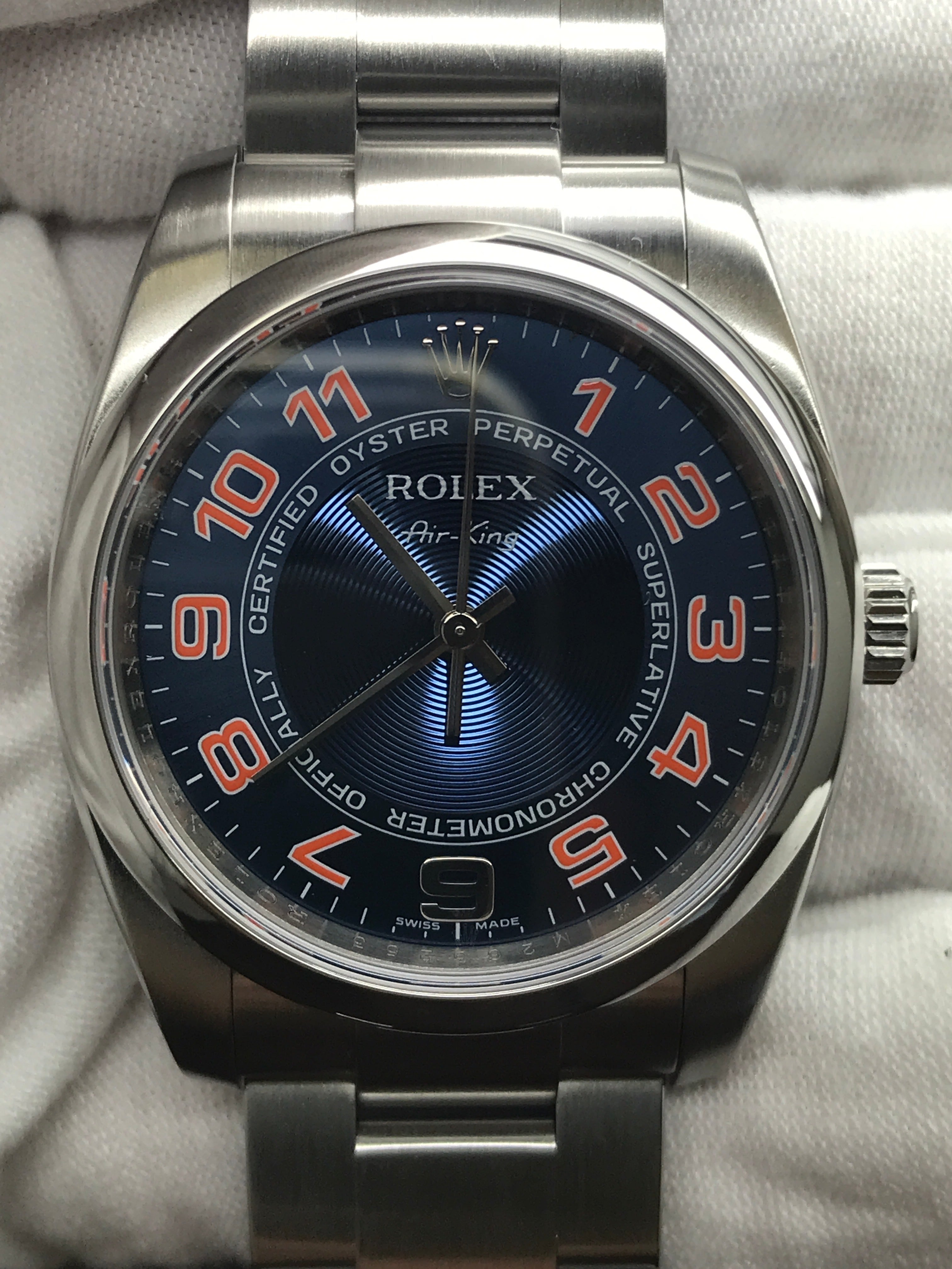 Stainless steel case with a stainless steel oyster bracelet. Fixed domed stainless steel bezel. Blue dial with silver tone luminous hands and Arabic numeral hour markers. Dial type: analog. Luminescent hands and markers. Rolex calibre 3130 automatic movement with about 48 hours of power reserve. Scratch resistant sapphire crystal. Screw down crown. Solid case back. Case size: 34 mm. Case thickness: 11.5 mm. Round case shape. Band width: mm. Oysterclasp clasp. Water resistant at 100 meters / 330 feet. Functions: hour, minute, second, chronometer. Rolex Oyster Perpetual 34mm 114200 Blue Dial Automatic Watch.