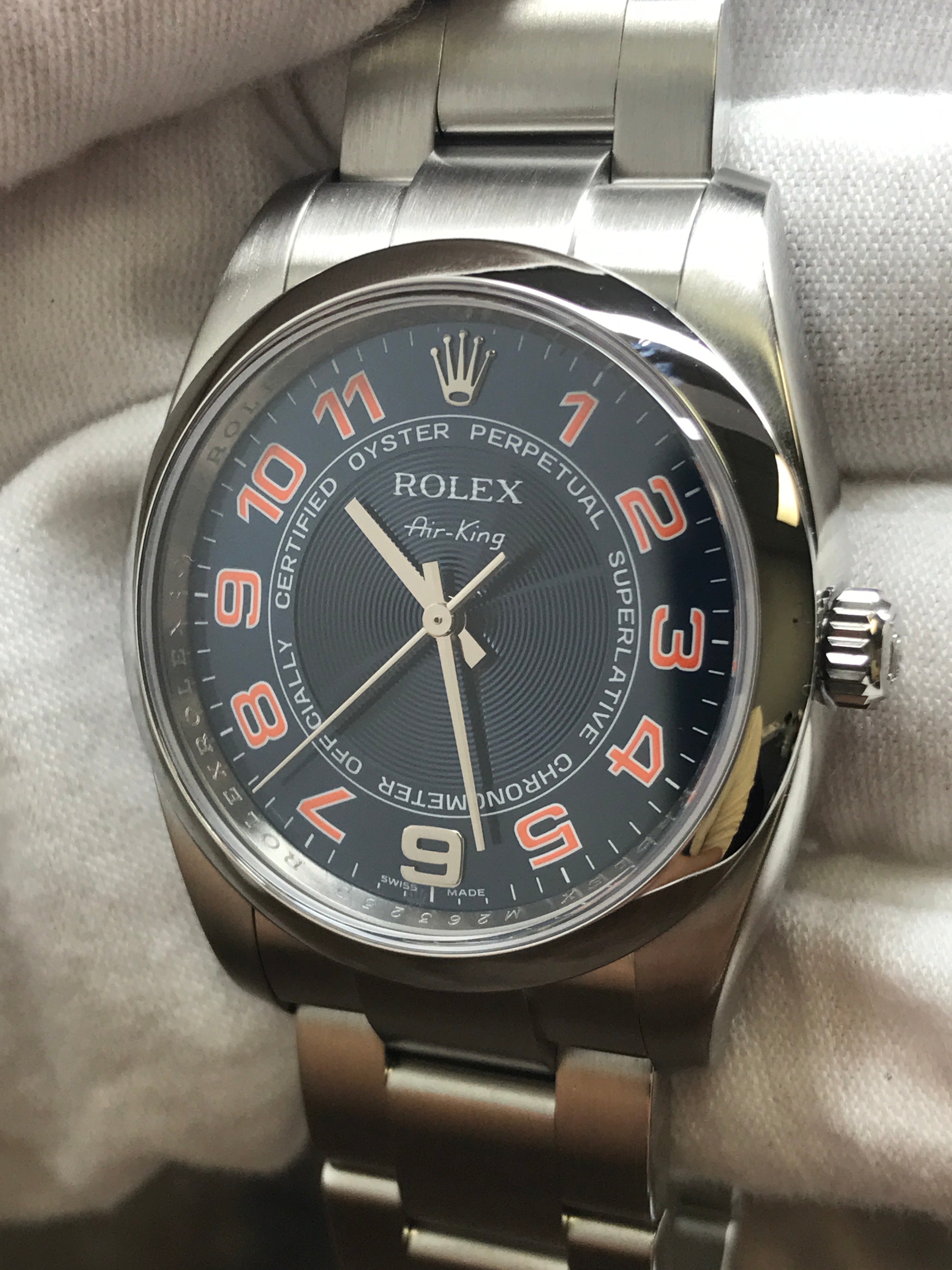 This pre-owned Rolex Oyster Perpetual 34mm 114200 is in mint condition and comes with: original Rolex double box, booklets & matching warranty card. Max wrist size: 7.25 in.