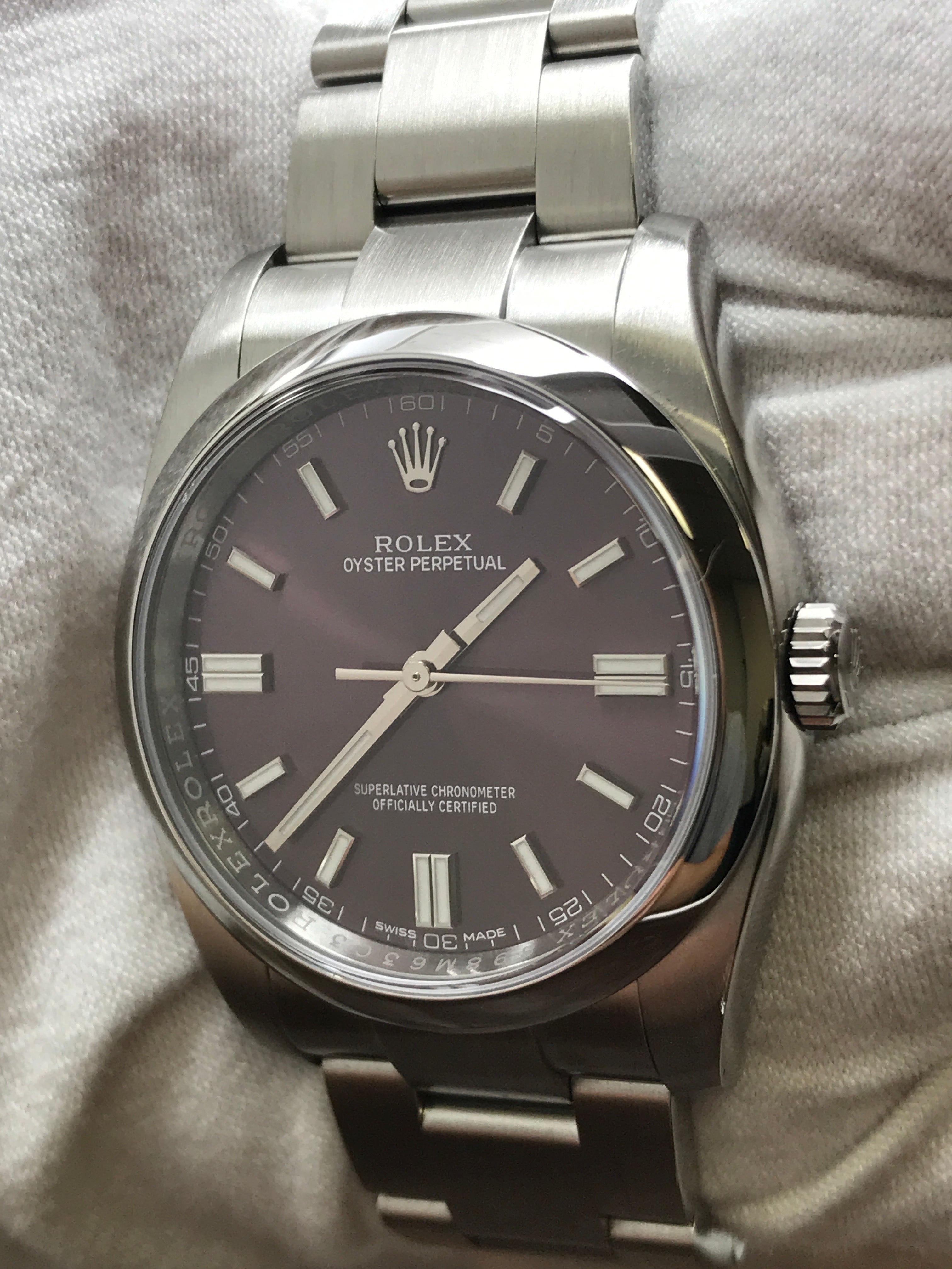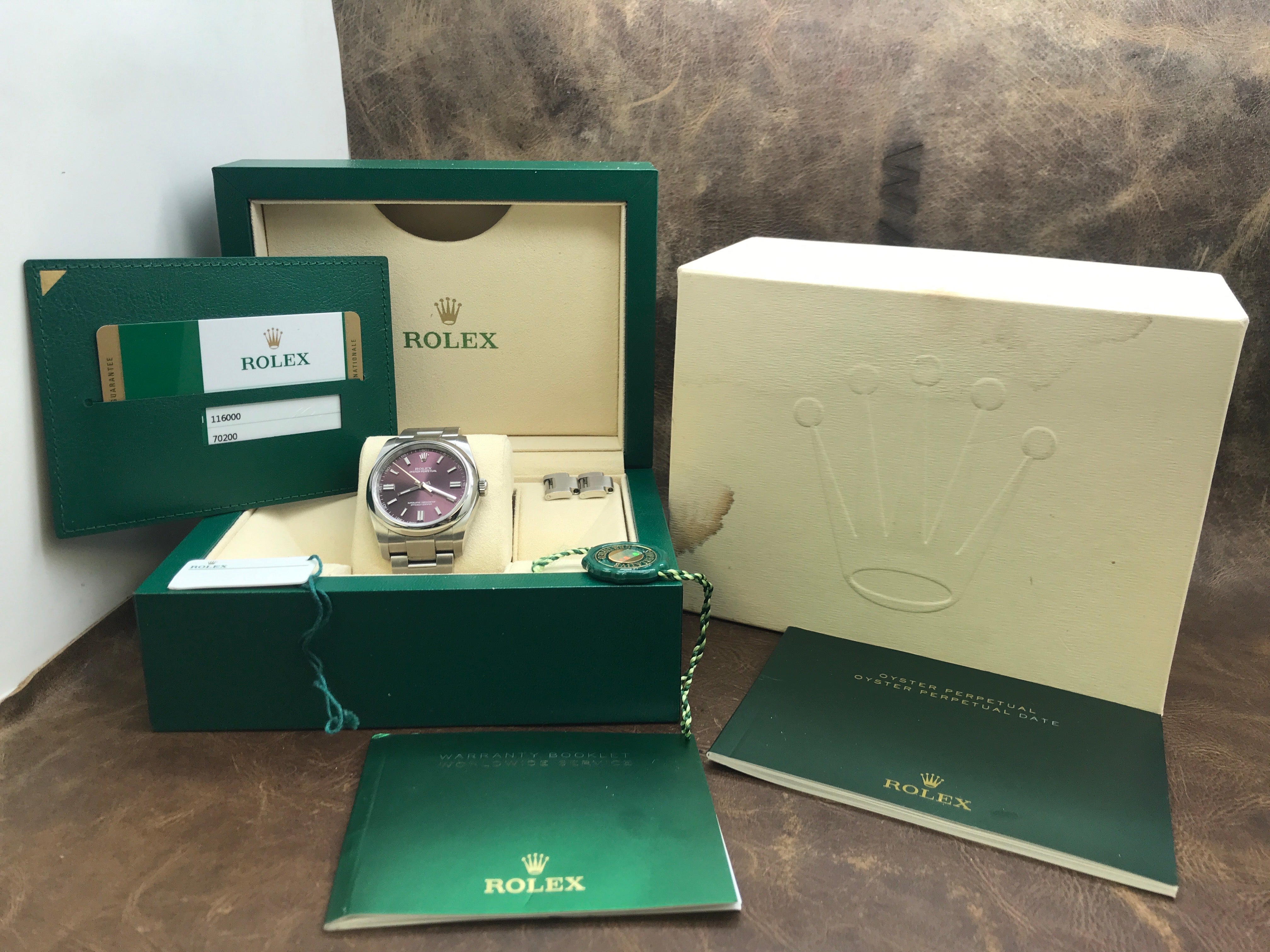 Stainless steel case with a stainless steel oyster bracelet. Fixed stainless steel bezel. Red grape dial with luminous silver-tone hands and index hour markers. Dial type: analog. Rolex calibre 3130 automatic movement with about 42 hours of power reserve. Sapphire crystal. Screw down crown. Solid case back. Case size: 36 mm. Case thickness: 12 mm. Round case shape. Band width: mm. Oysterlock clasp. Water resistant at 100 meters / 330 feet. Functions: hour, minute, seconds, chronometer. Rolex Oyster Perpetual 36mm 116000 Red Grape Dial Automatic Watch.