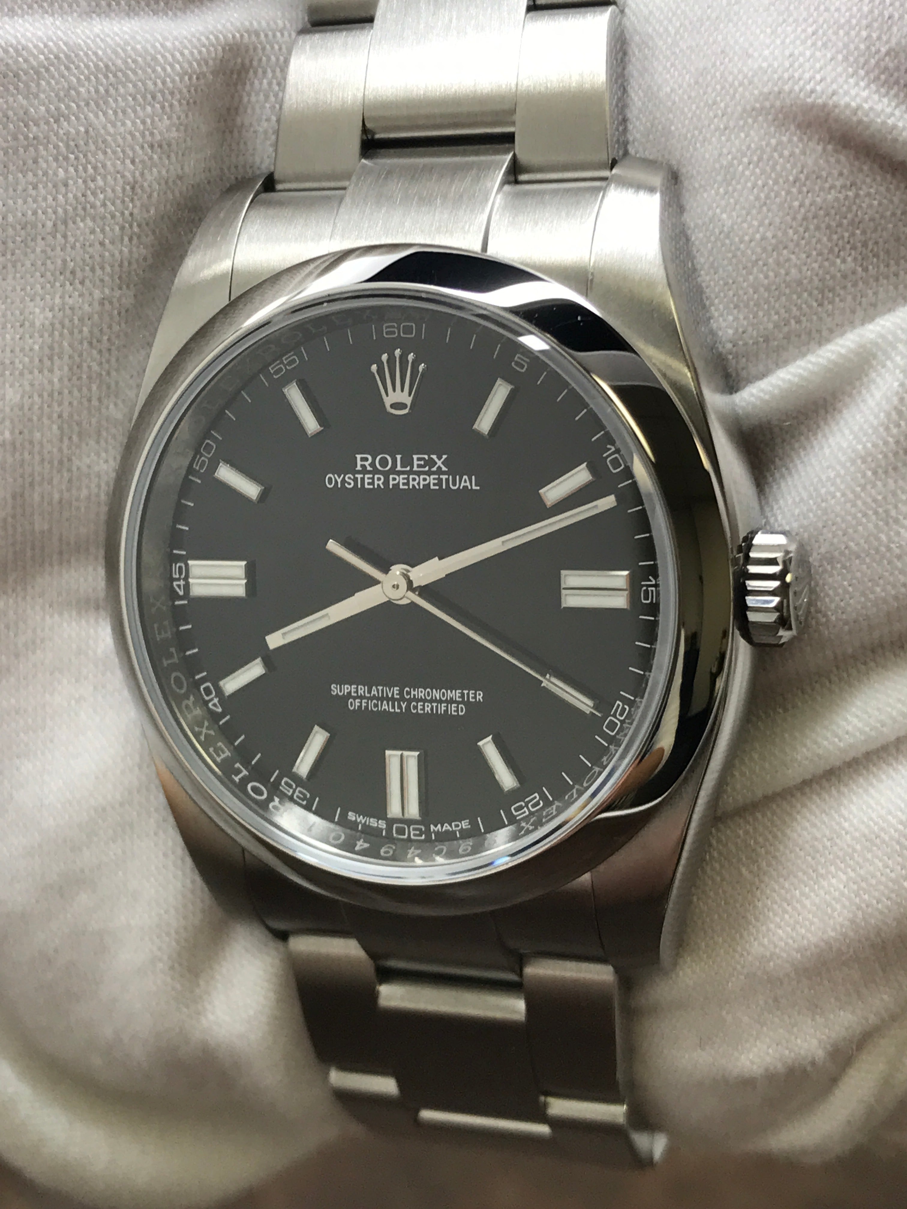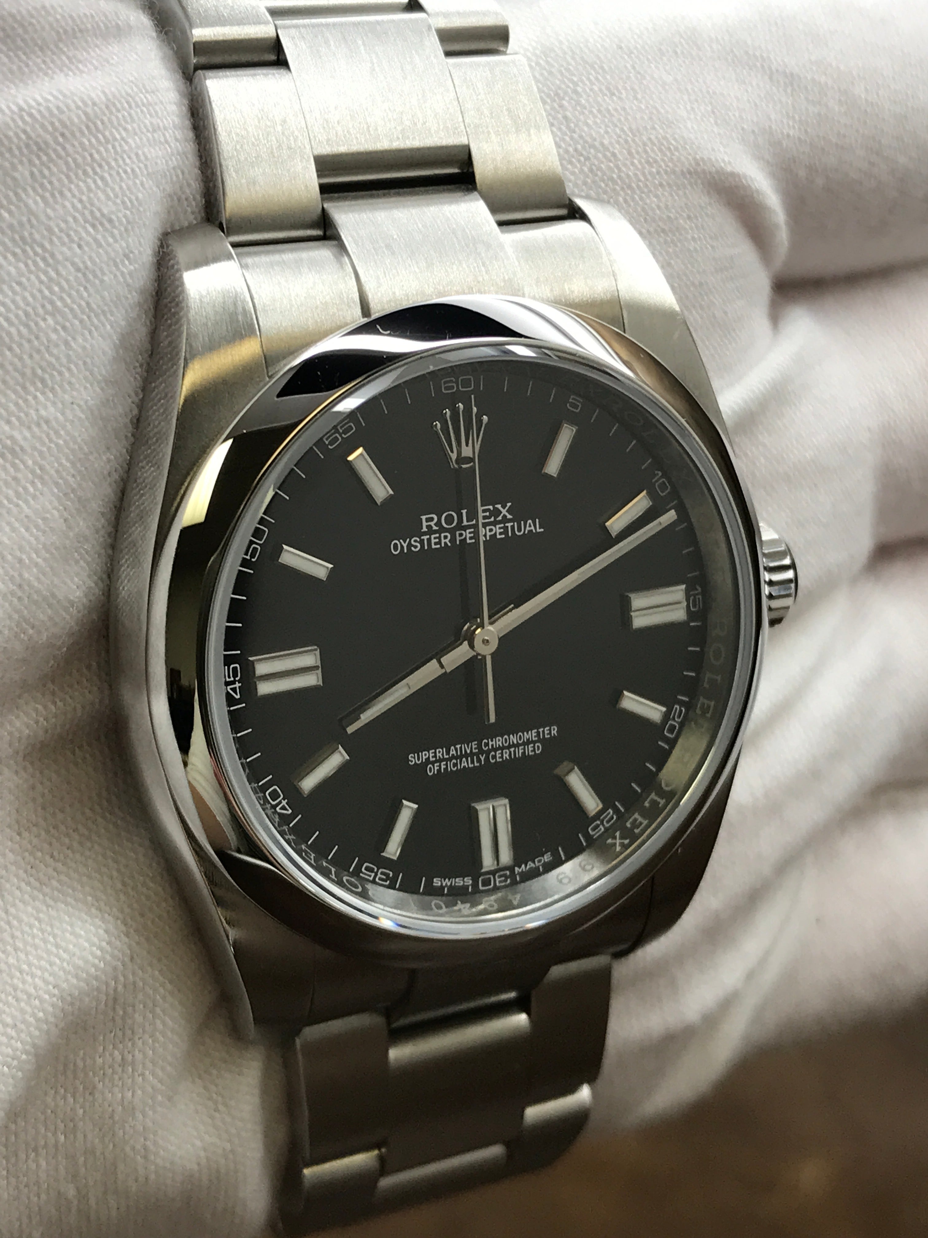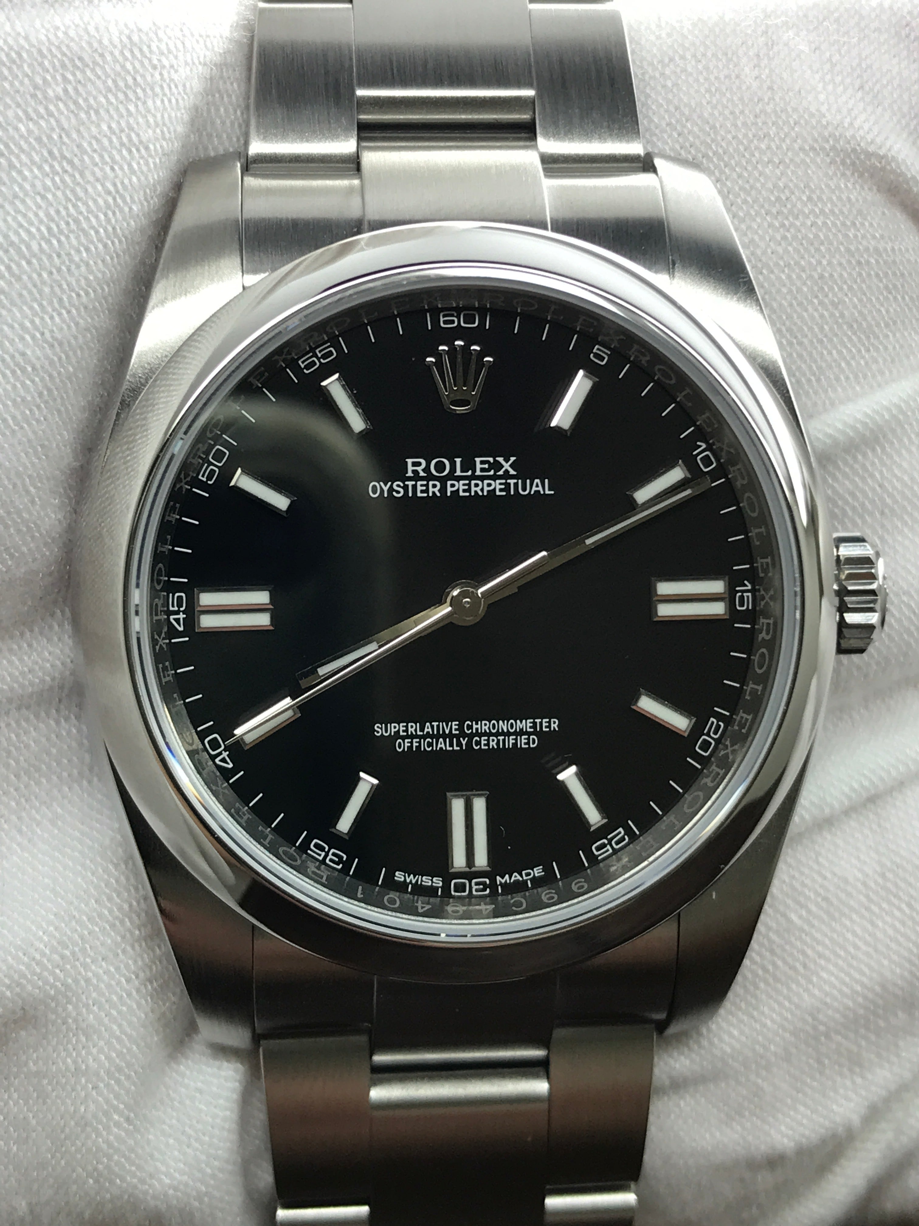 Stainless steel case with a stainless steel oyster bracelet. Fixed stainless steel bezel. Black dial with luminous silver-tone hands and index hour markers. Dial type: analog. Rolex calibre 3130 automatic movement with about 42 hours of power reserve. Scratch resistant sapphire crystal. Screw down crown. Solid case back. Case size: 36 mm. Case thickness: 12 mm. Round case shape. Band width: mm. Oysterlock clasp. Water resistant at 100 meters / 330 feet. Functions: hour, minute, seconds, chronometer. Rolex Oyster Perpetual 36mm 116000 Black Dial Automatic Watch.