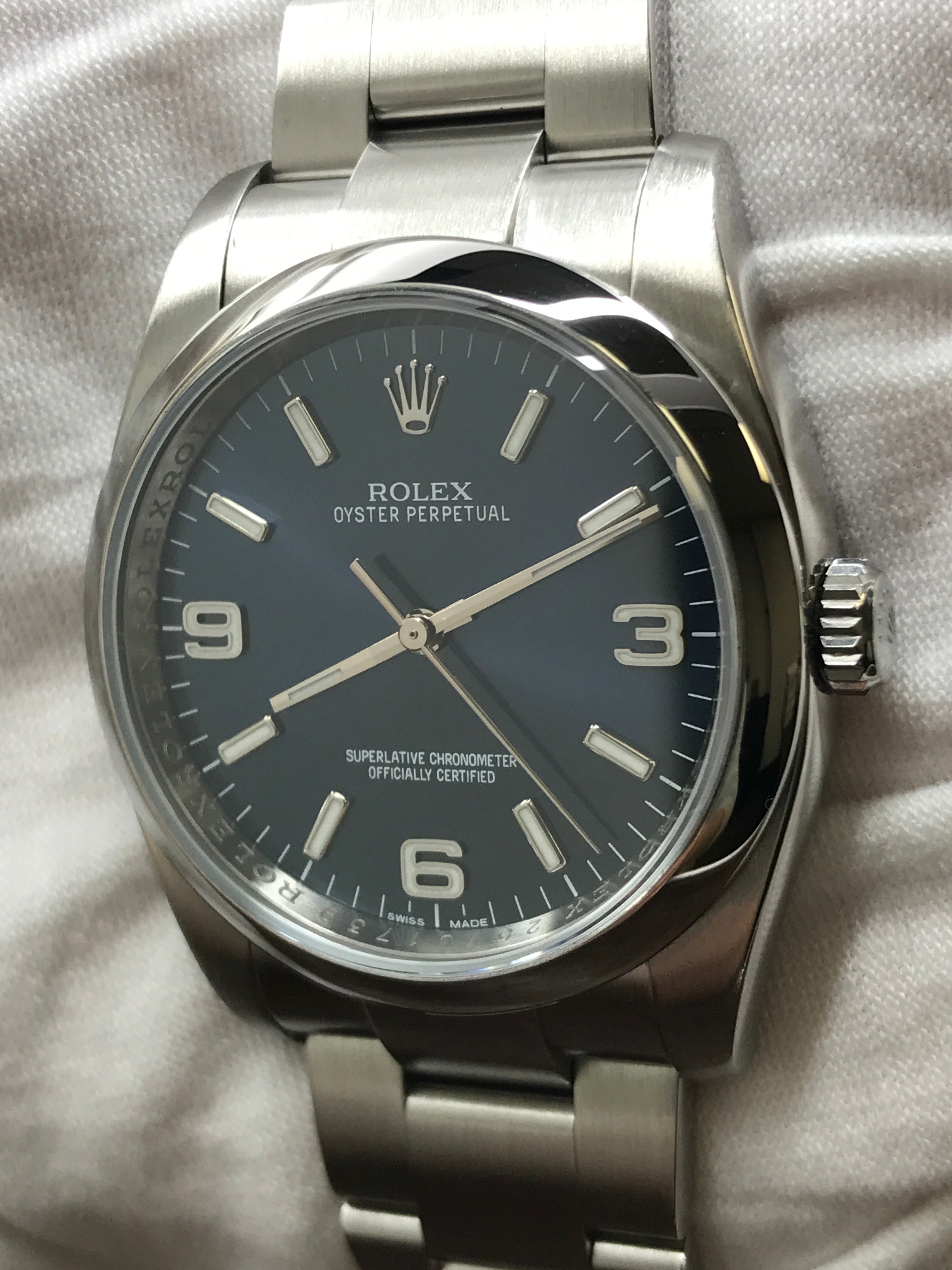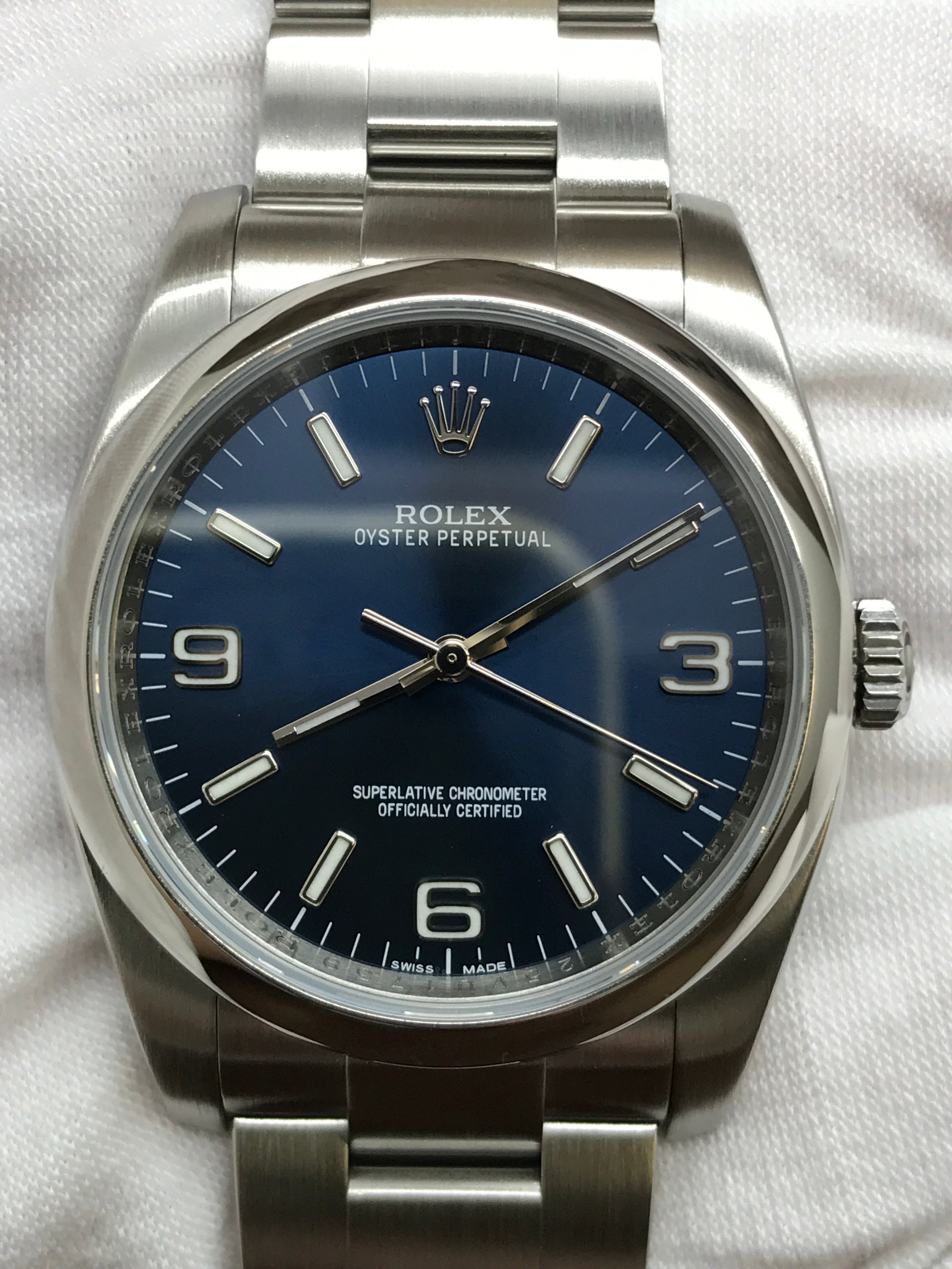 Stainless steel case with a stainless steel oyster bracelet. Fixed stainless steel bezel. Blue dial with luminous silver-tone hands and index with 3/6/9 Arabic hour markers. Dial type: analog. Rolex calibre 3130 automatic movement with about 42 hours of power reserve. Scratch resistant sapphire crystal. Screw down crown. Solid case back. Case size: 36 mm. Case thickness: 12 mm. Round case shape. Band width: mm. Oysterlock clasp. Water resistant at 100 meters / 330 feet. Functions: hour, minute, seconds, chronometer. Rolex Oyster Perpetual 36mm 116000 Blue Dial Automatic Watch.