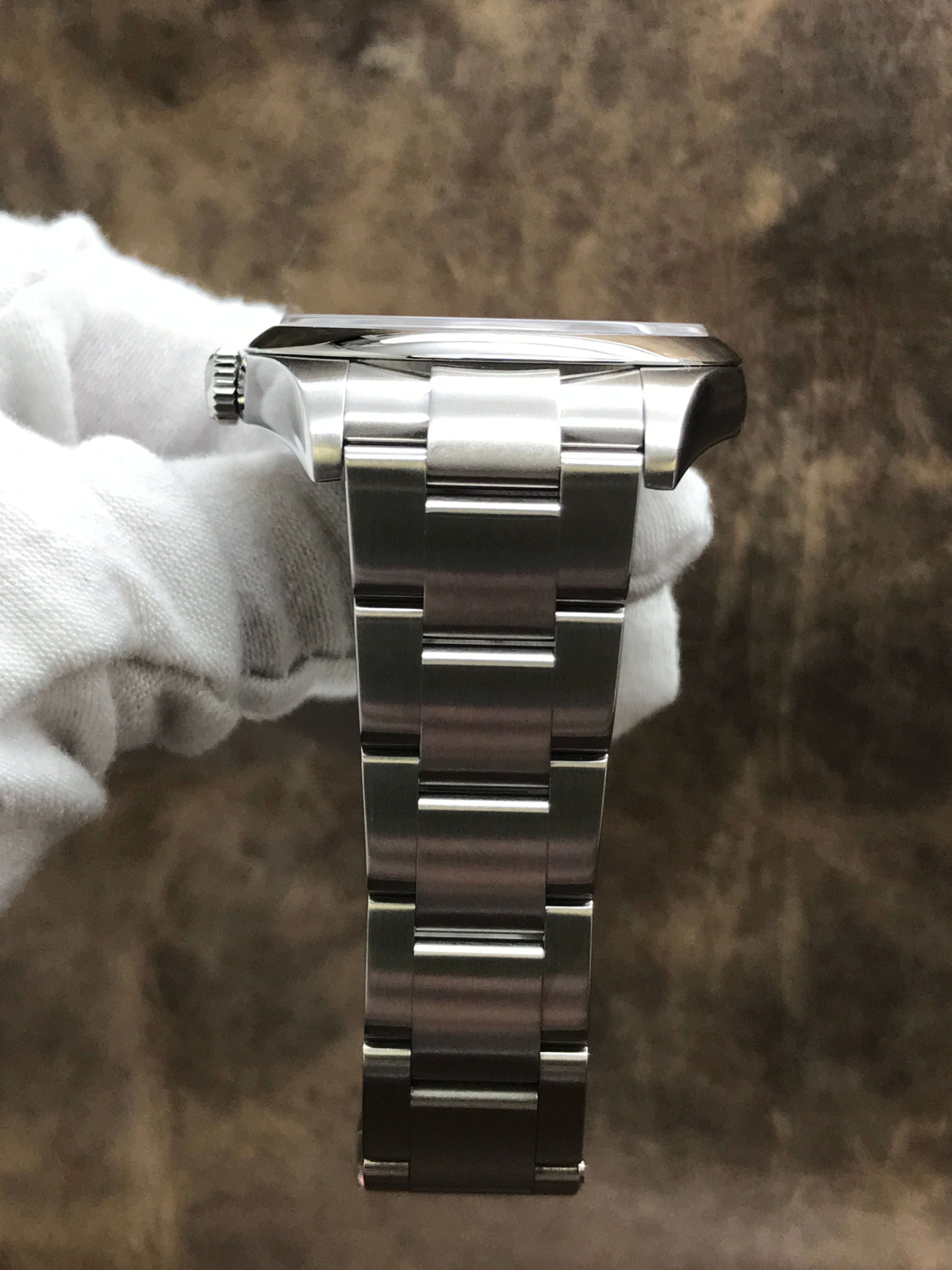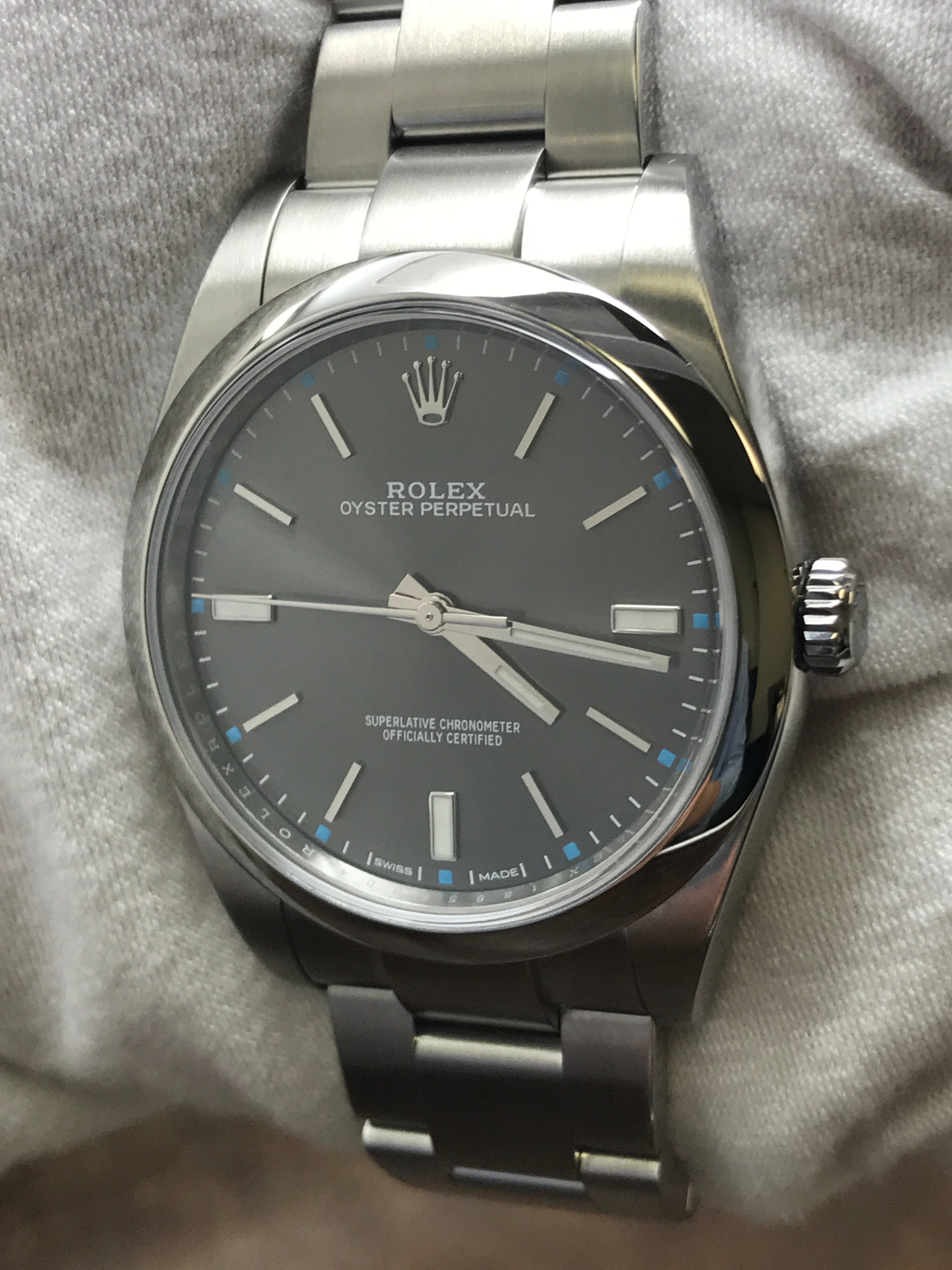 Stainless steel case with a stainless steel oyster bracelet. Fixed stainless steel bezel. Dark rhodium dial with luminous silver-tone hands and luminous index hour markers. Dial type: analog. Luminescent hands & hour markers. Rolex caliber 3132 automatic movement with about 48 hours of power reserve. Scratch resistant sapphire crystal. Screw down crown. Solid case back. Case size: 39 mm. Case thickness: 11 mm. Round case shape. Band width: mm. Oysterlock clasp. Water resistant at 100 meters / 330 feet. Functions: hour, minute, second, chronometer. Rolex Oyster Perpetual 39mm 114300 Dark Rhodium Dial Automatic Watch.