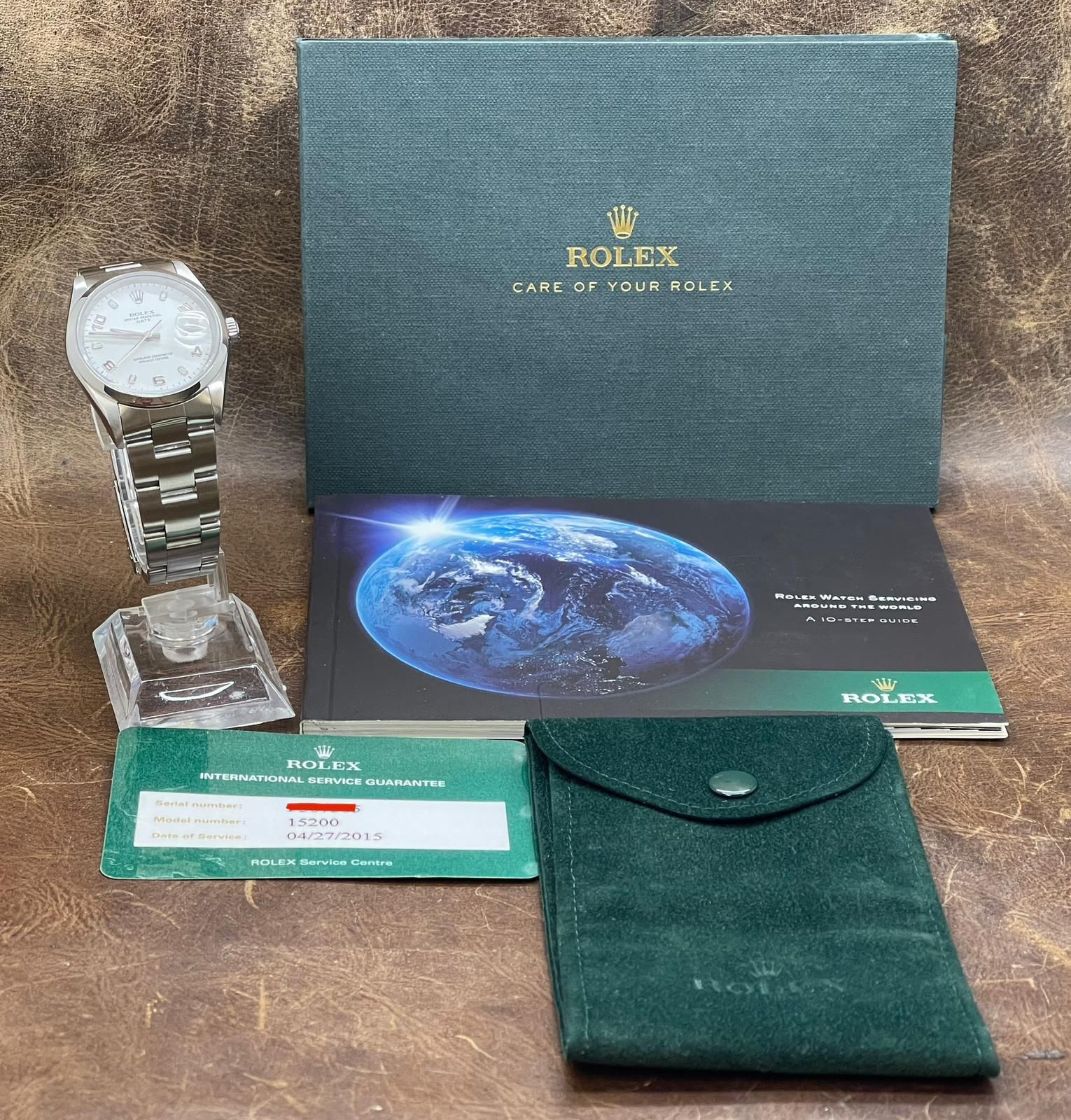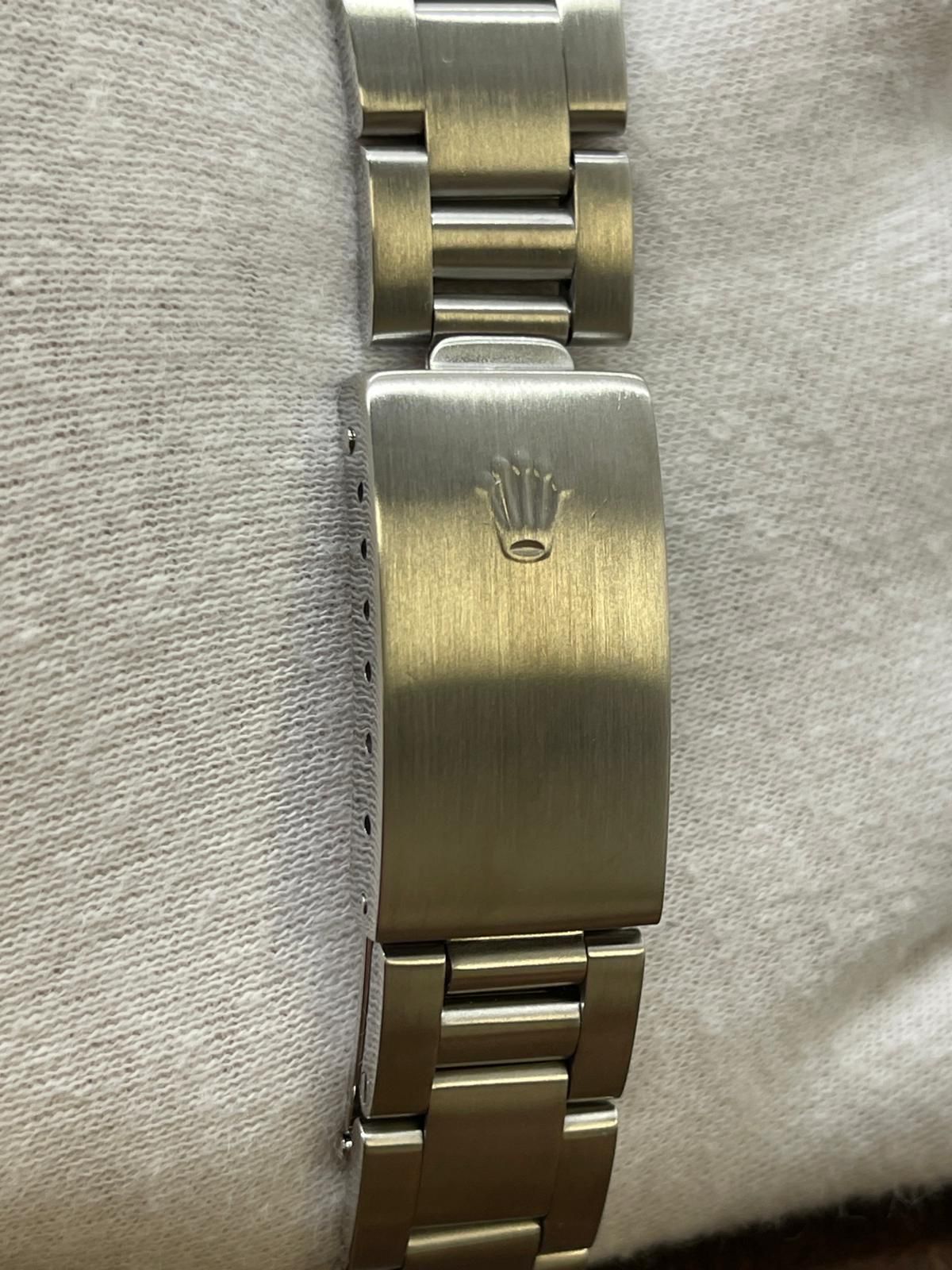 This pre-owned Rolex Oyster Perpetual Date 34mm 15200 is in very good condition and comes with: original booklets and matching SERVICE card dated 2015. The dial has several signs of wear - most significant is black line near 6 o'clock on left side. Max wrist size: 7.25 in.