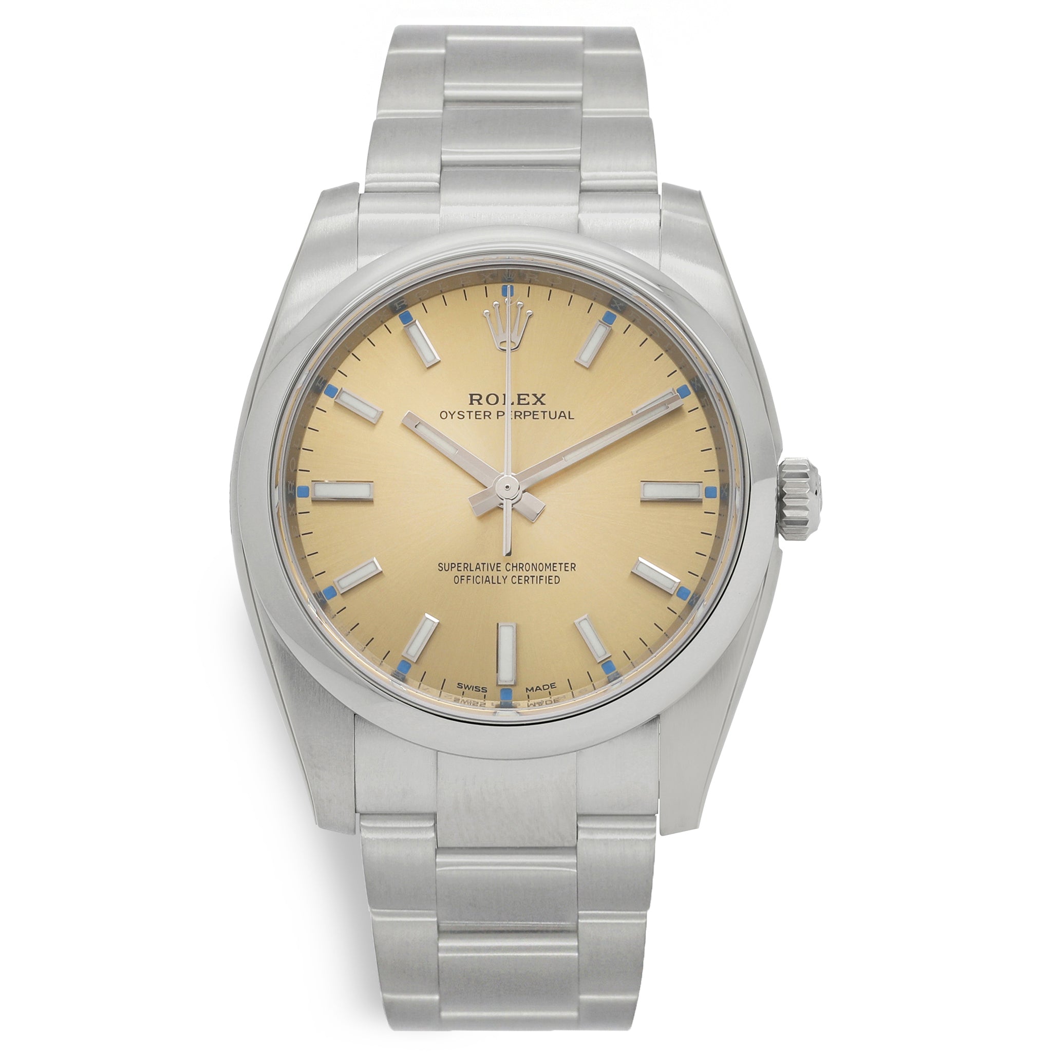 Stainless steel case with a stainless steel Rolex oyster bracelet. Fixed domed stainless steel bezel. Champagne dial with silver-tone hands and index hour markers. Dial type: analog. Luminescent hands and markers. Rolex calibre 3130 automatic movement with about 48 hours of power reserve. Scratch resistant sapphire crystal. Screw down crown. Solid case back. Case size: 34 mm. Case thickness: mm. Round case shape. Band width: mm. Oysterlock clasp. Water resistant at 100 meters / 330 feet. Functions: hour, minute, second, chronometer. Rolex Oyster Perpetual 114200 Champagne Dial Automatic Watch.