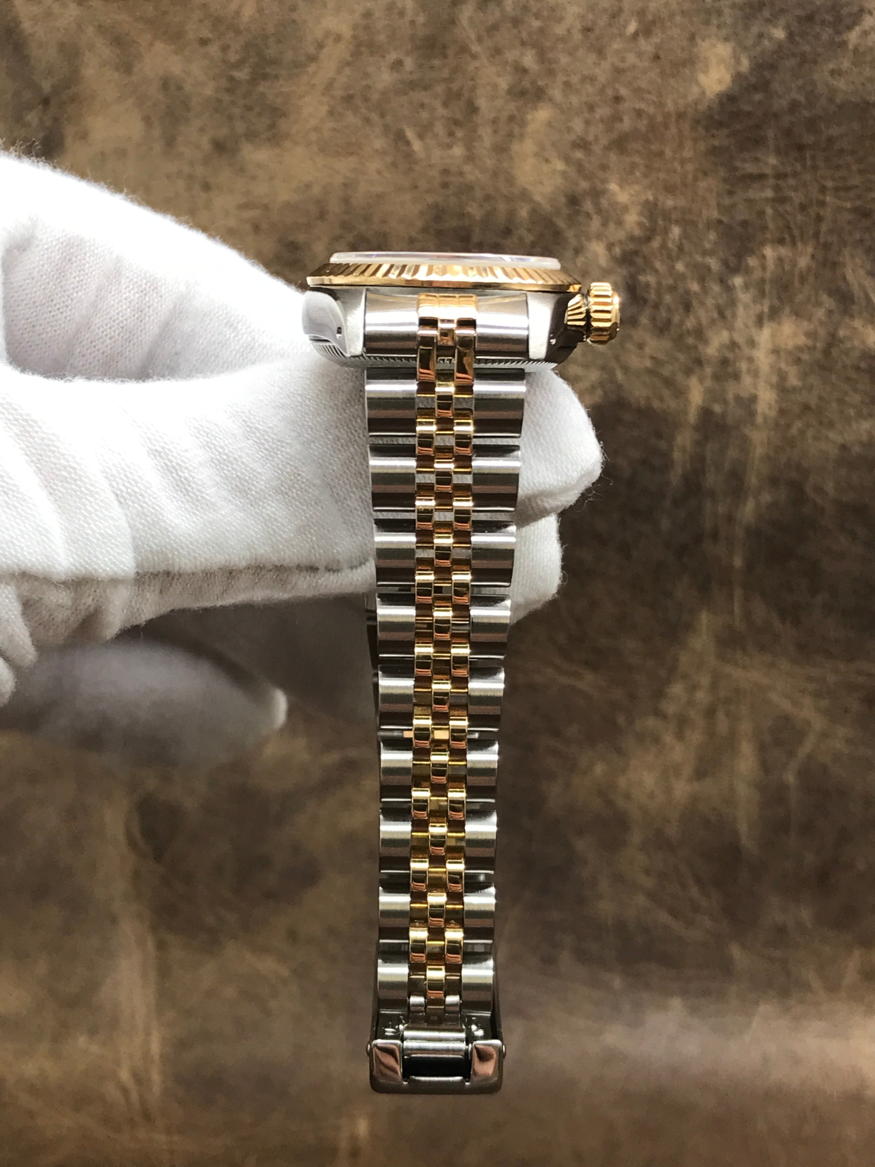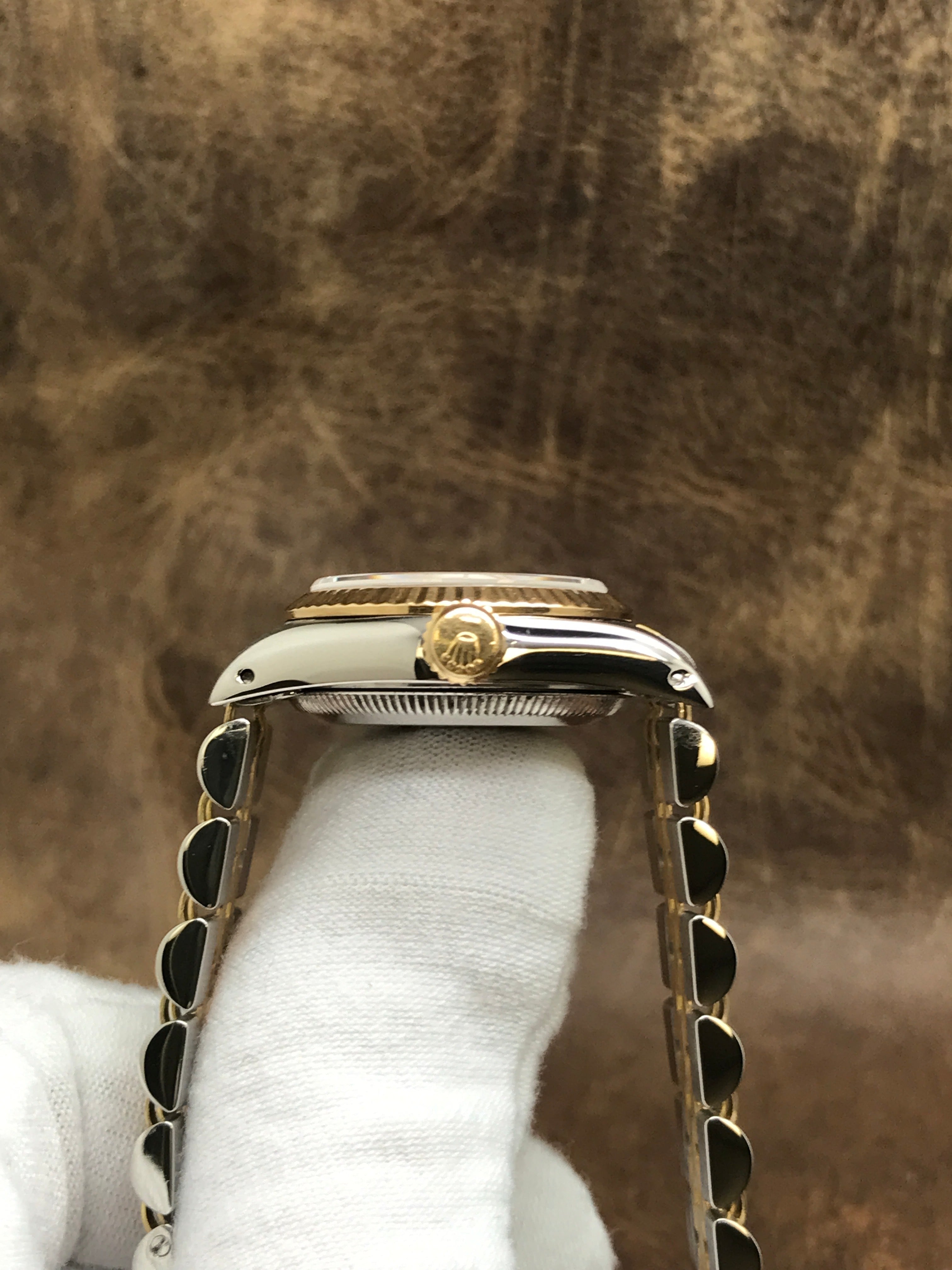 Stainless steel case with a stainless steel & 18k yellow gold jubilee bracelet. Fixed fluted 18k yellow gold bezel. Custom blue diamond dial with gold-tone hands and custom added diamonds hour markers. Dial type: analog. 2130 automatic movement with about 42 of power reserve. Sapphire crystal. Screw down crown. Solid case back. Case size: 24 mm. Case thickness: 10 mm. Round case shape. Band width: mm. Fold over clasp. Water resistant at 100 meters / 300 feet. Functions: hour, minute, seconds. Rolex Oyster Perpetual 67193 Custom Blue Diamond Dial Automatic Women's Watch.