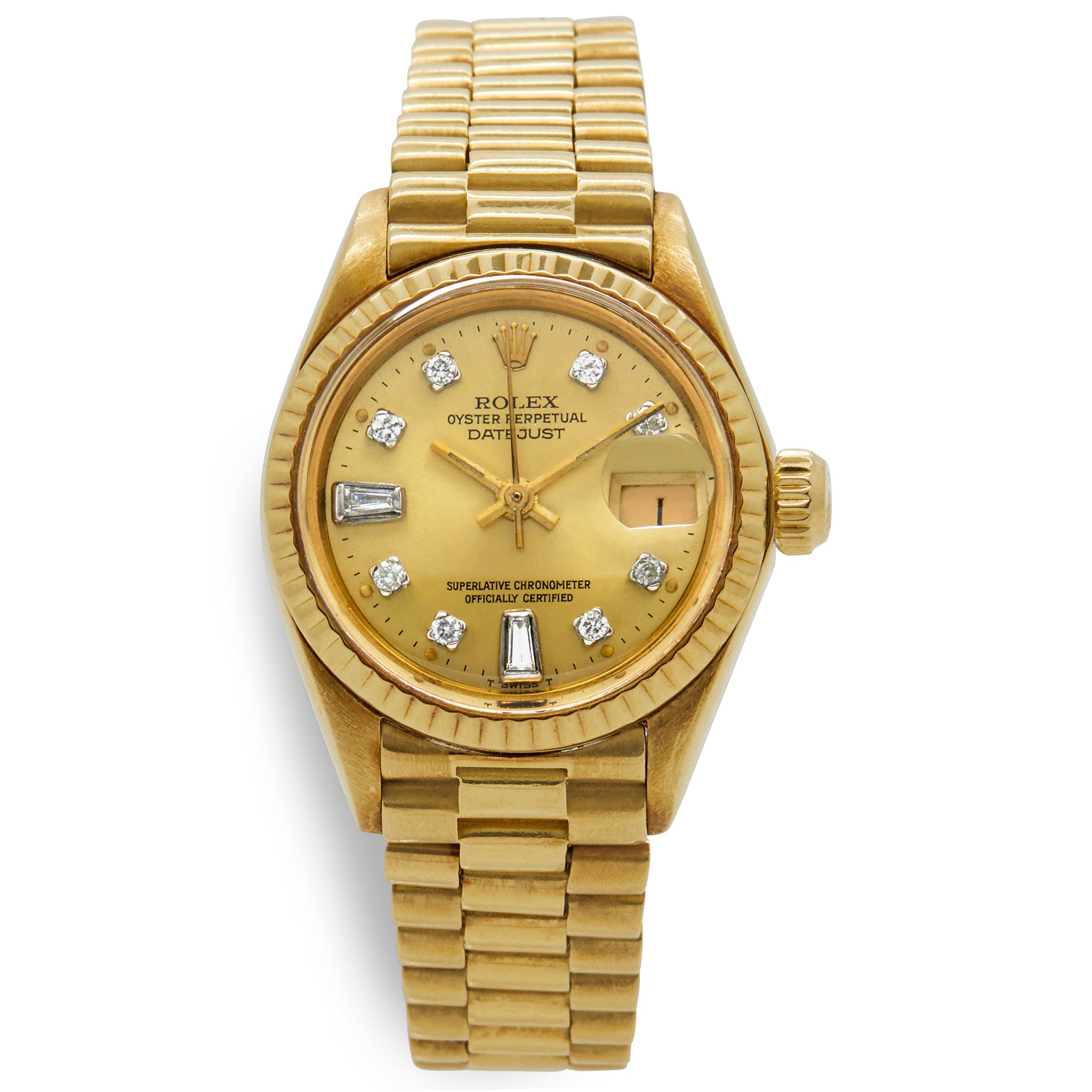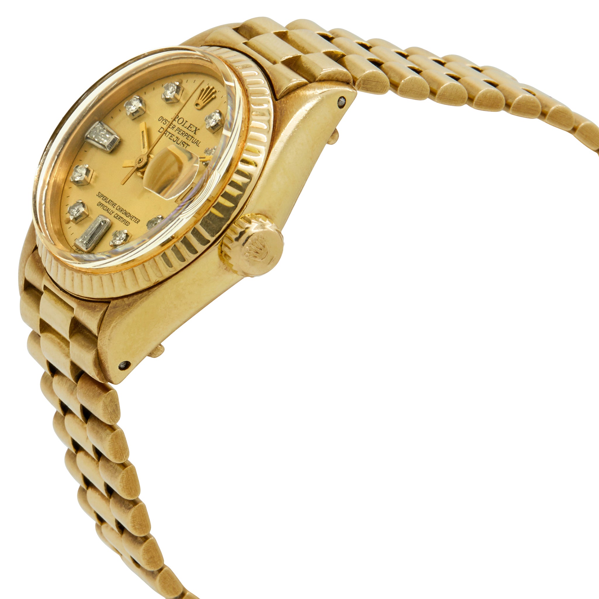 18k yellow gold case with a 18kt yellow gold president bracelet. Fixed fluted 18kt yellow gold bezel. Champagne dial with gold-tone hands and custom added diamonds hour markers. Dial type: analog. Luminescent hands & hour markers. Rolex calibre 2135 automatic movement with about 42 hours of power reserve. Scratch resistant sapphire crystal. Screw down crown. Solid case back. Case size: 26 mm. Case thickness: 10 mm. Round case shape. Band width: mm. Crownclasp clasp. Water resistant at 10. Functions: hours, minutes, seconds, date. Rolex President 26mm President 69178 Champagne Dial Automatic Women's Watch.