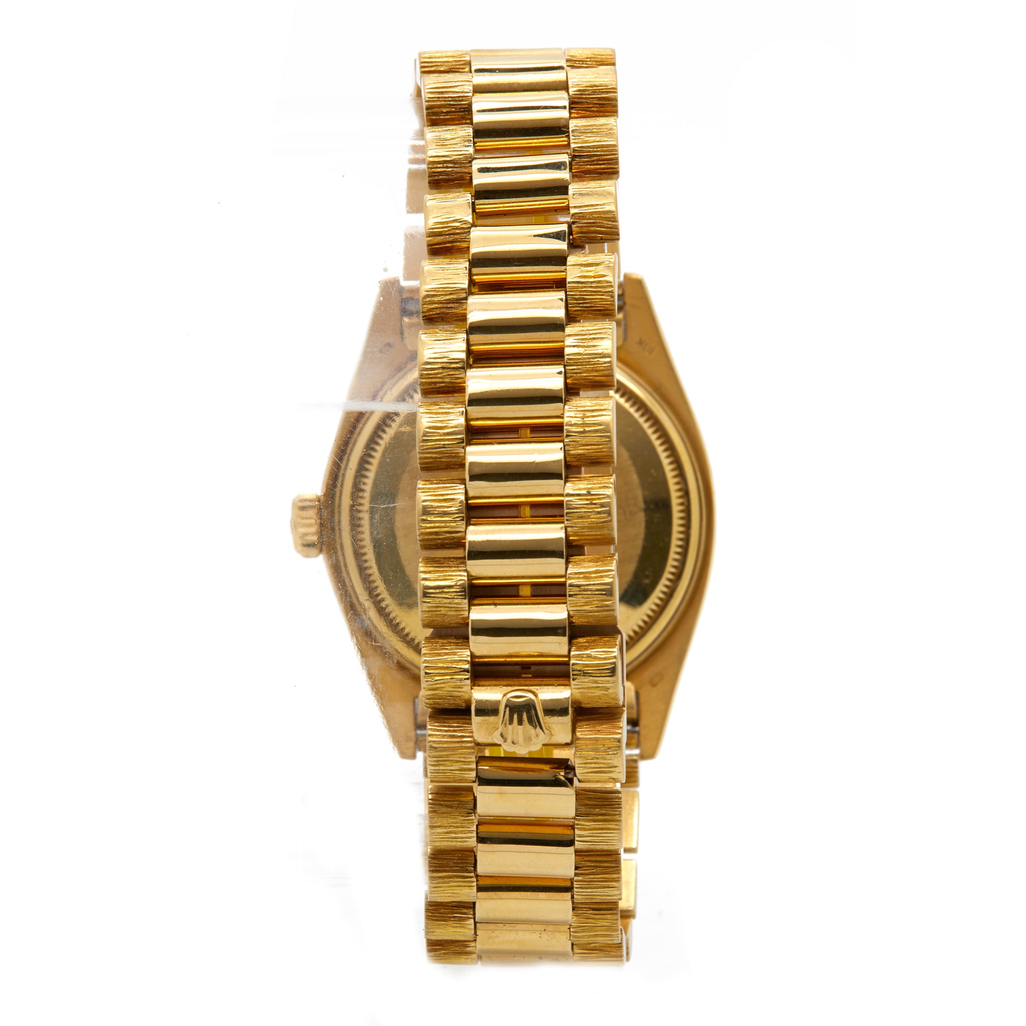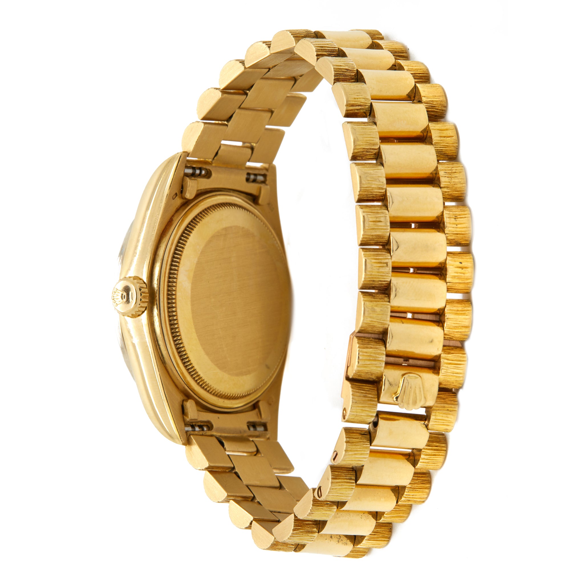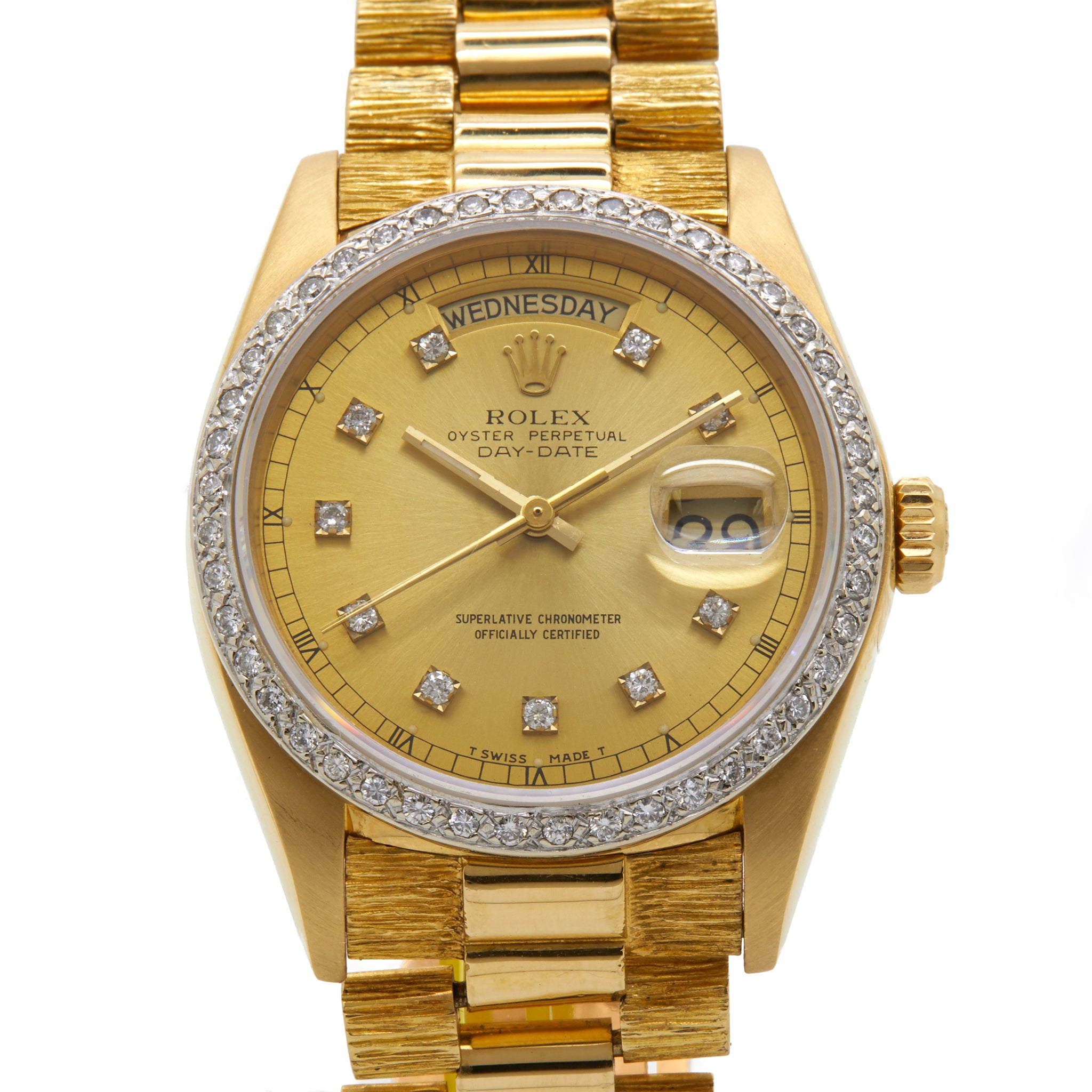 18k yellow gold case with a 18kt yellow gold bracelet. Fixed diamond bezel. Champagne dial with gold-tone hands and diamond hour markers. Dial type: analog. Rolex calibre 3055 automatic movement with about 42 hours of power reserve. Scratch resistant sapphire crystal. Screw down crown. Solid case back. Case size: 36 mm. Case thickness: 14 mm. Round case shape. Band width: mm. Concealed crown clasp. Water resistant at 100 meters / 330 feet. Functions: date, day, hour, minute, second, chronometer. Rolex President Day Date 36mm President 18038 Champagne Dial Automatic Watch.
