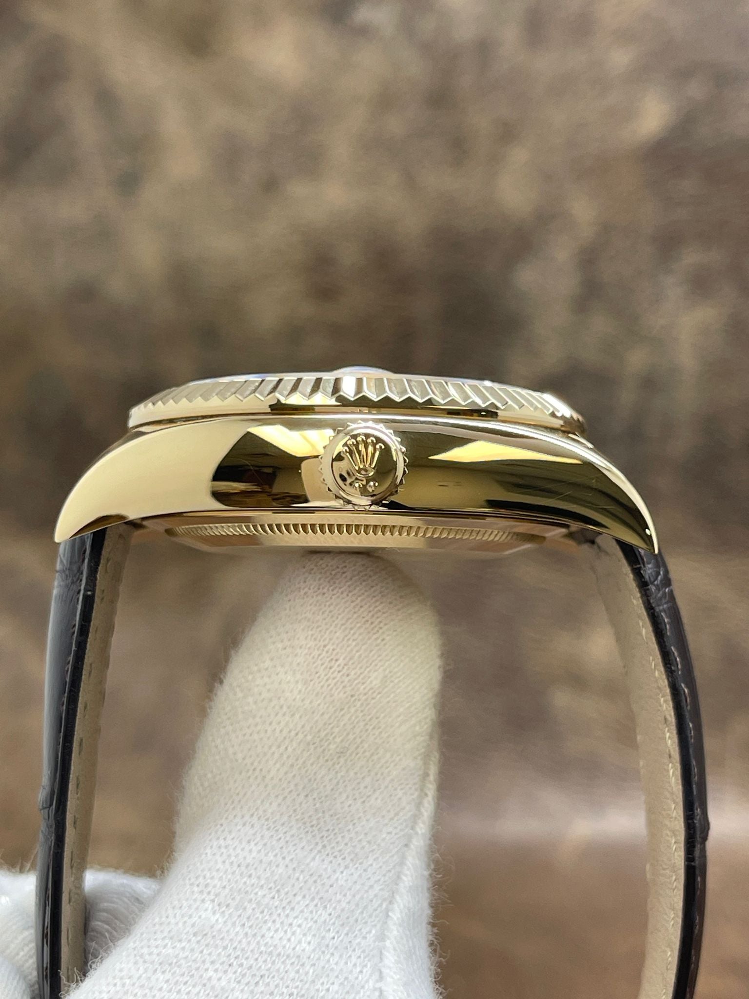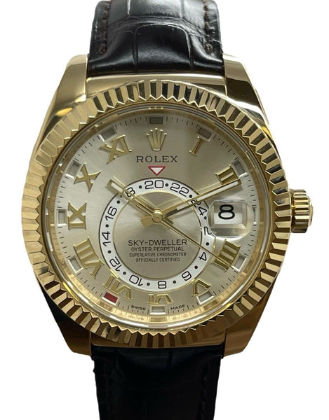 18k yellow gold case with a leather strap. Bidirectional rotating Rolex ring command bezel 18k yellow gold bezel. Silver dial with luminous gold-tone hands and Roman numerals hour markers. Dial type: analog. 9001 automatic movement with about 72 of power reserve. Scratch resistant sapphire crystal. Screw down crown. Solid case back. Case size: 42 mm. Case thickness: 14 mm. Round case shape. Band width: mm. Fold over w/ safety release clasp. Water resistant at 100 meters / 300 feet. Functions: date, hour, minute, seconds, chronometer, gmt. Rolex Sky Dweller 18K Yellow Gold B&P 326138 Silver Dial Automatic Men's Watch.